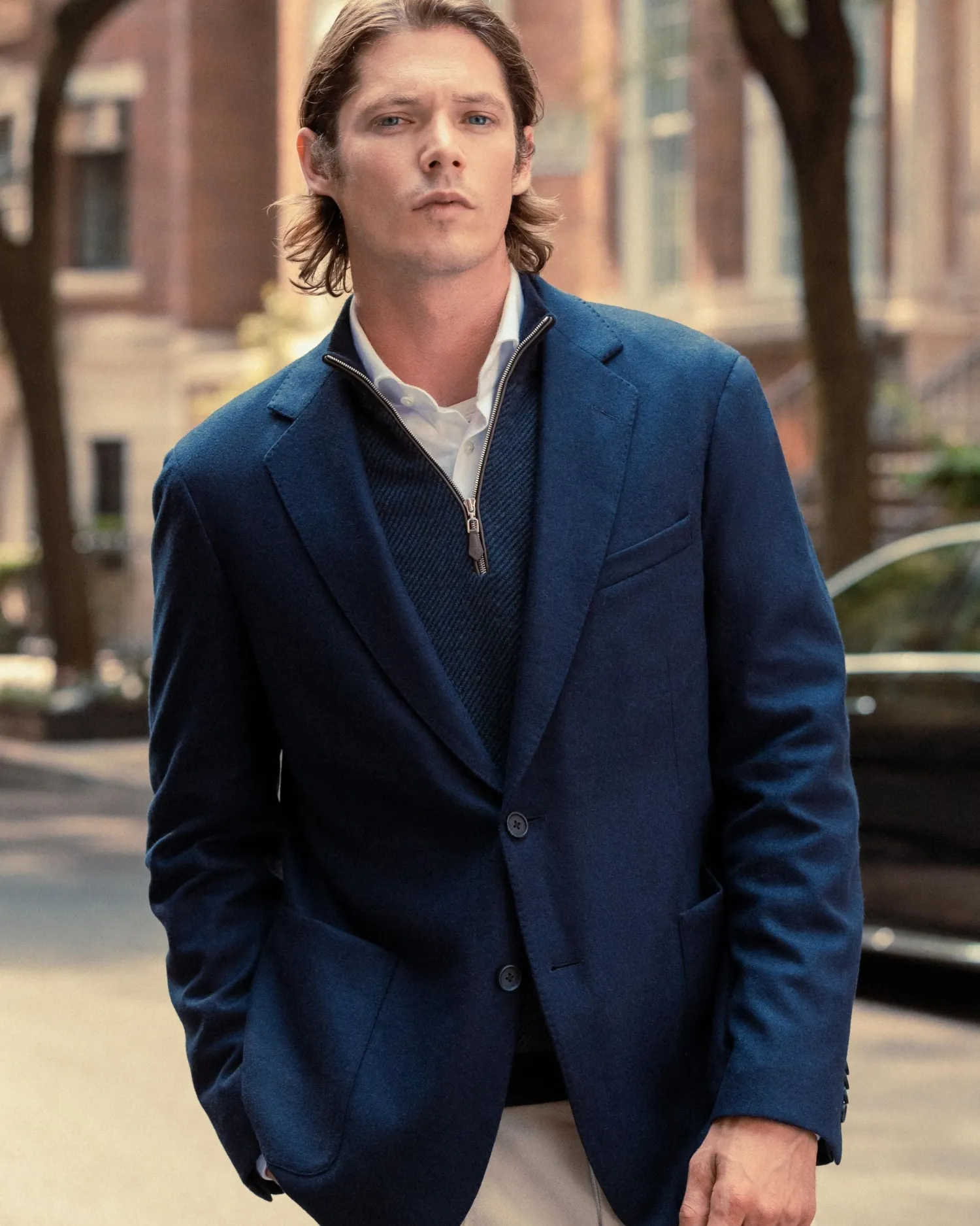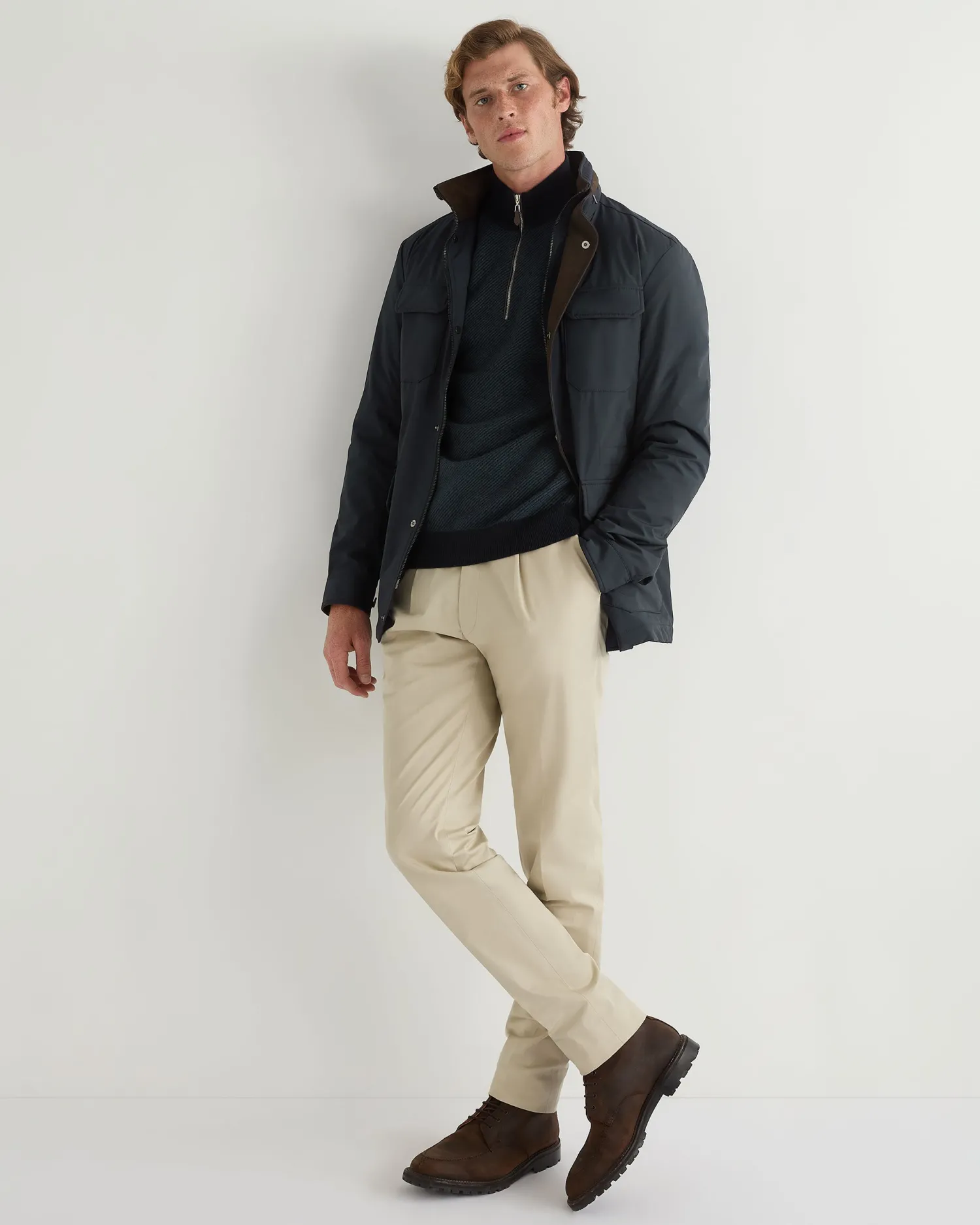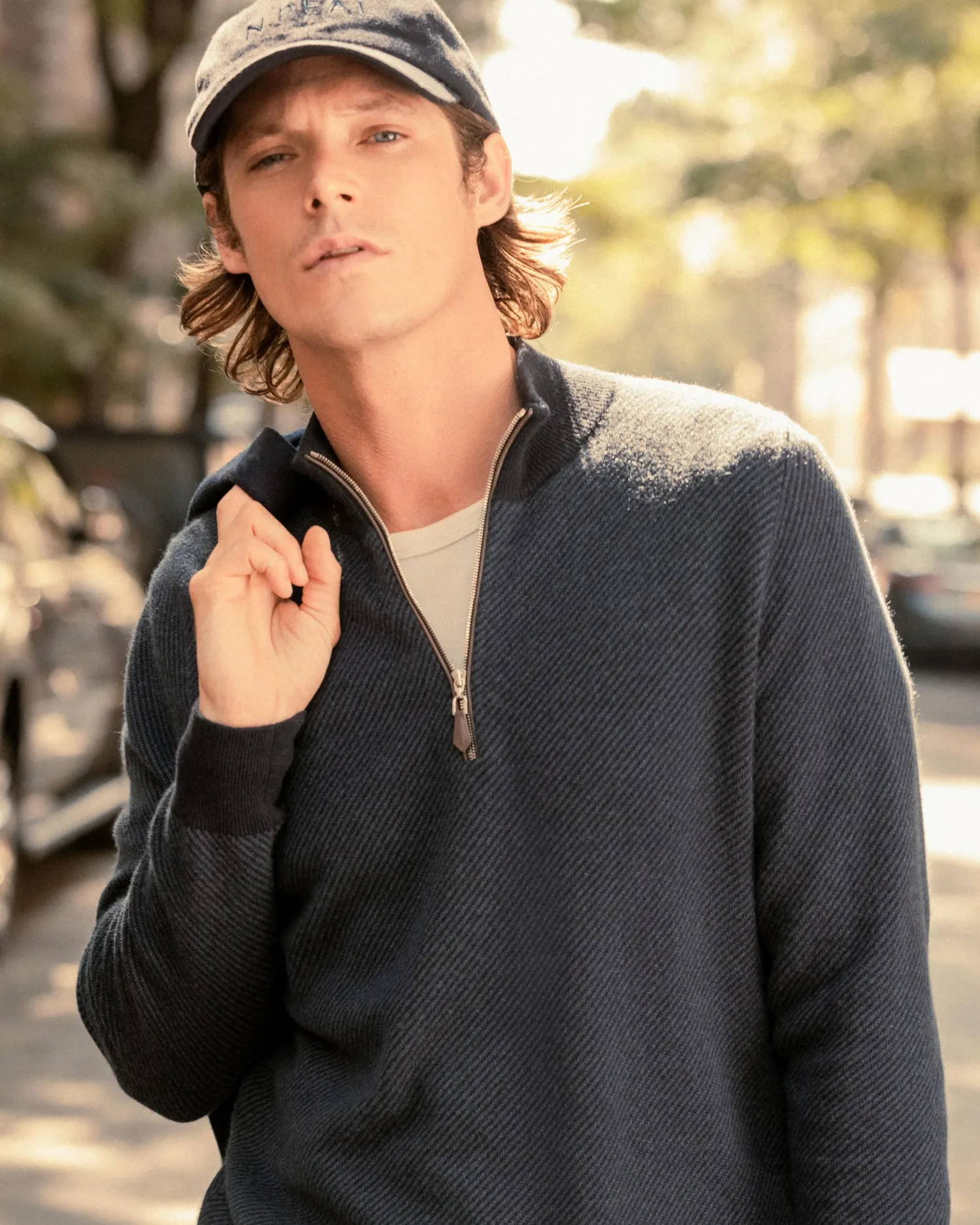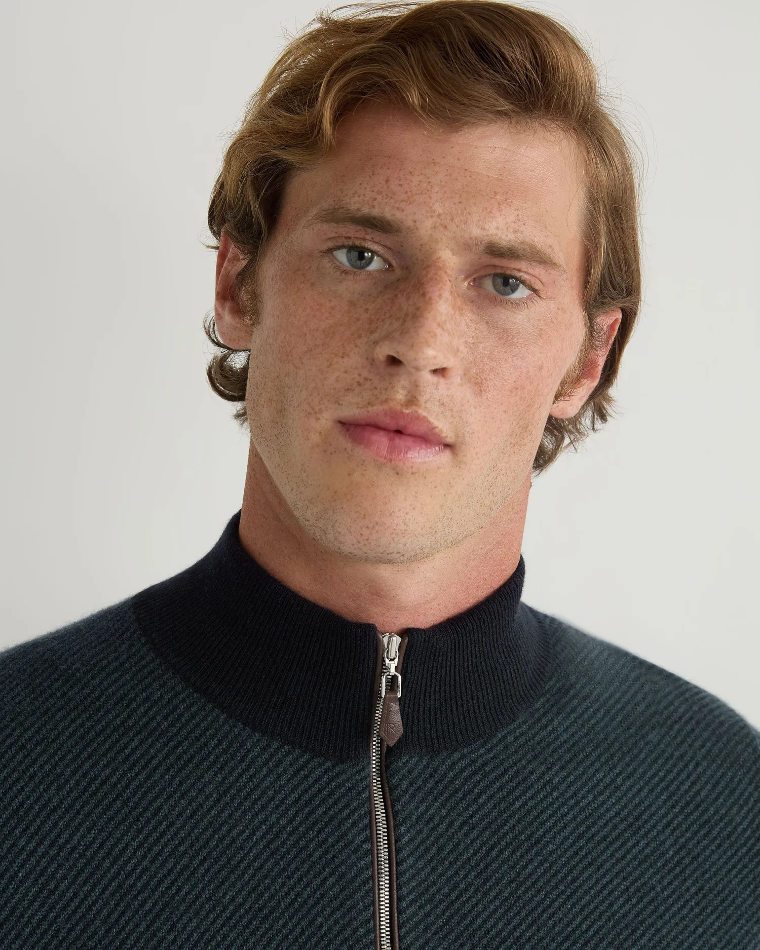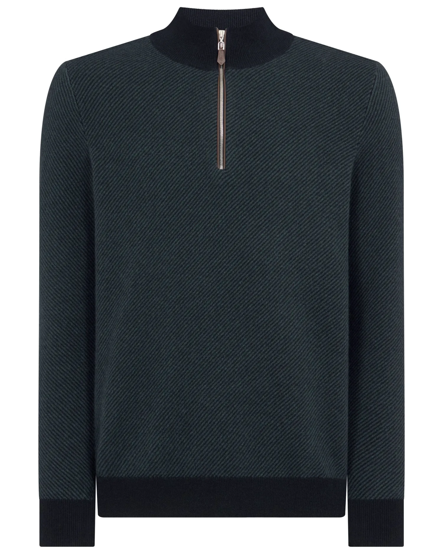 Our half zip ‘Carnaby’ style looking incredible here with a new diagonal stripe knit. Made from 100% organic Mongolian cashmere- Half zip style with our signature leather toggle- Ingenious diagonal stitch pattern in navy blue and caviar blue- Elegant new gents style with matching contrast collar, hem and cuffs- 1ply- Model is wearing size Medium- Care: Dry Clean Only Organic cashmere: organic dyes and detergents, free from fertilizer and pesticides, find out more heren