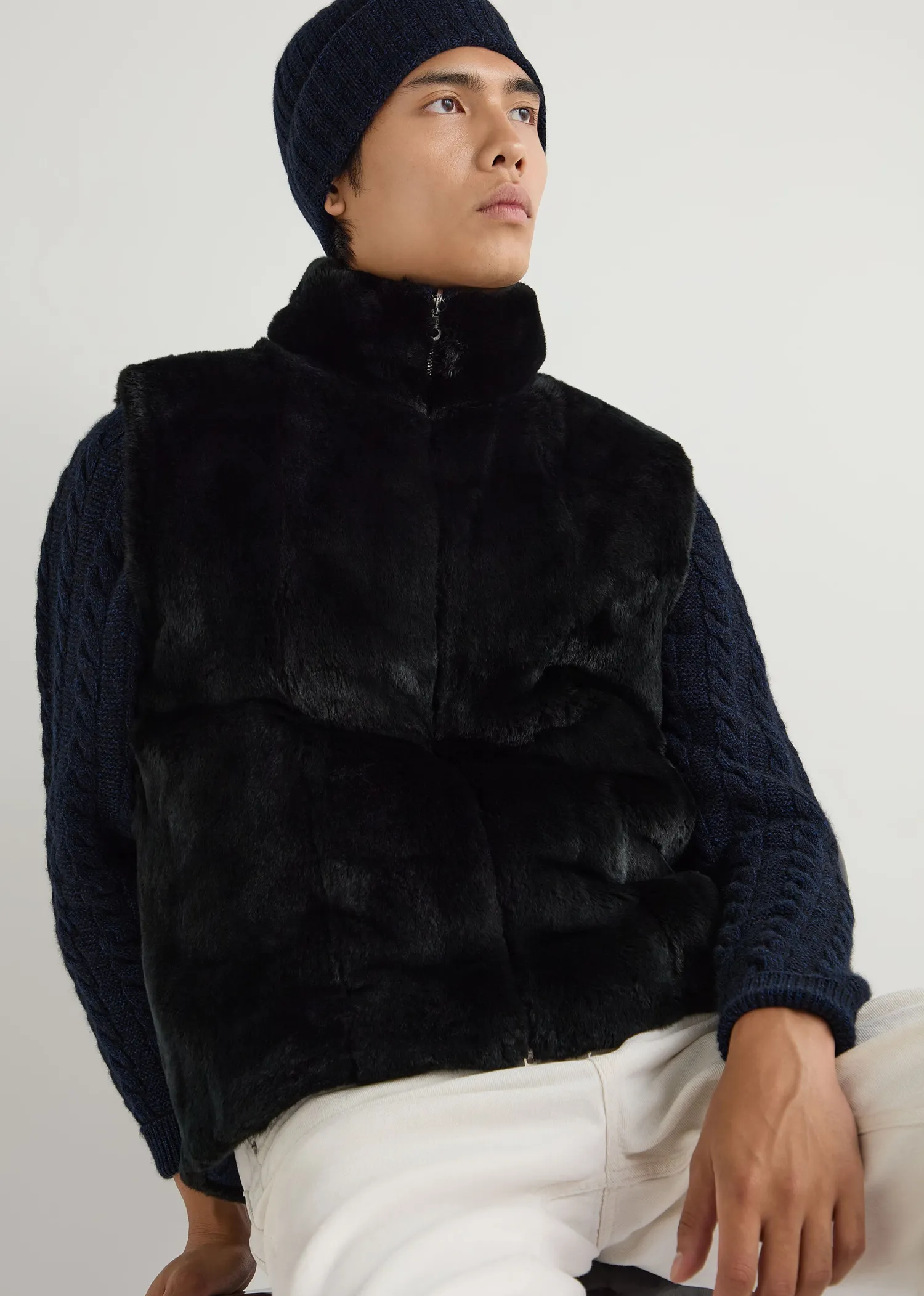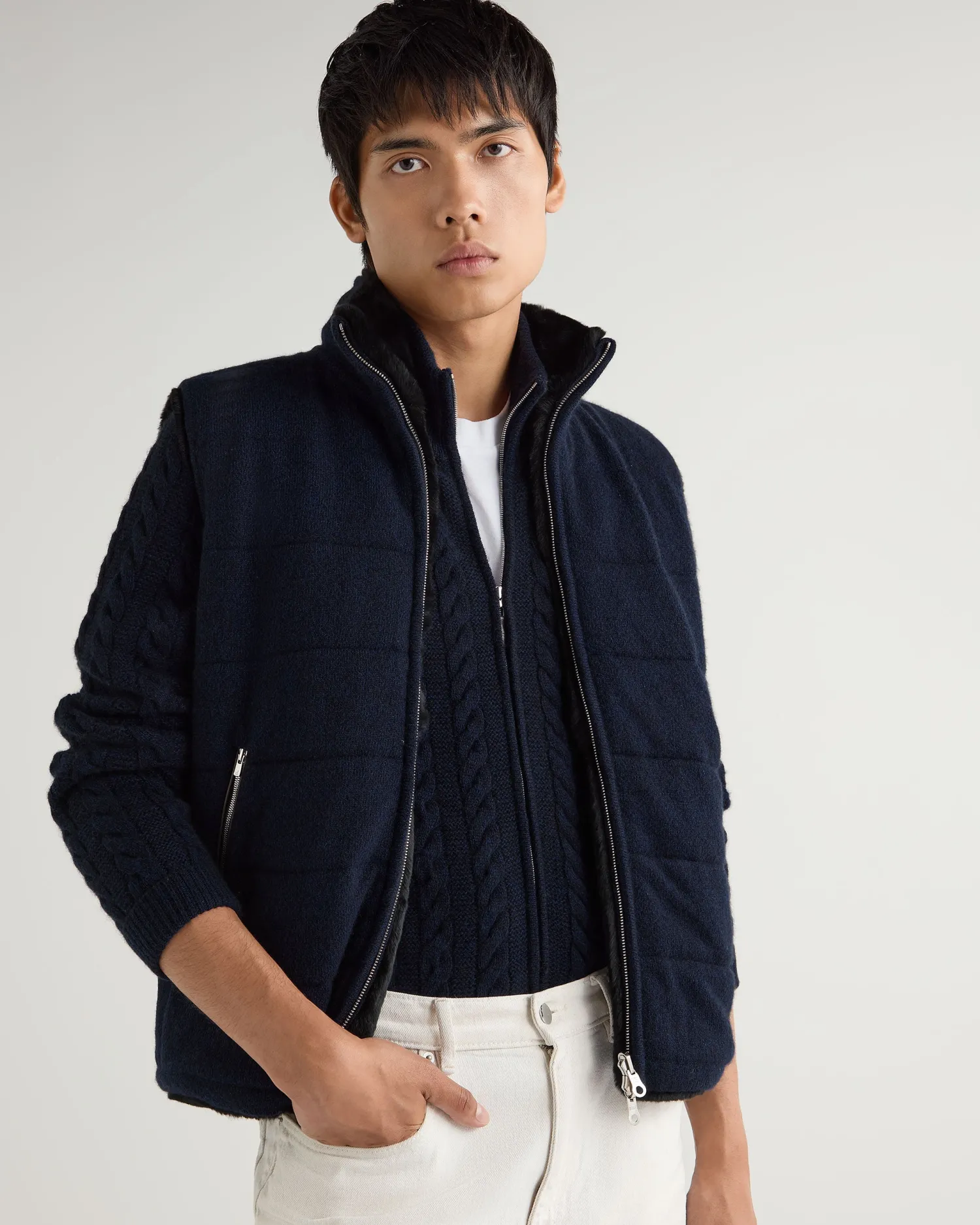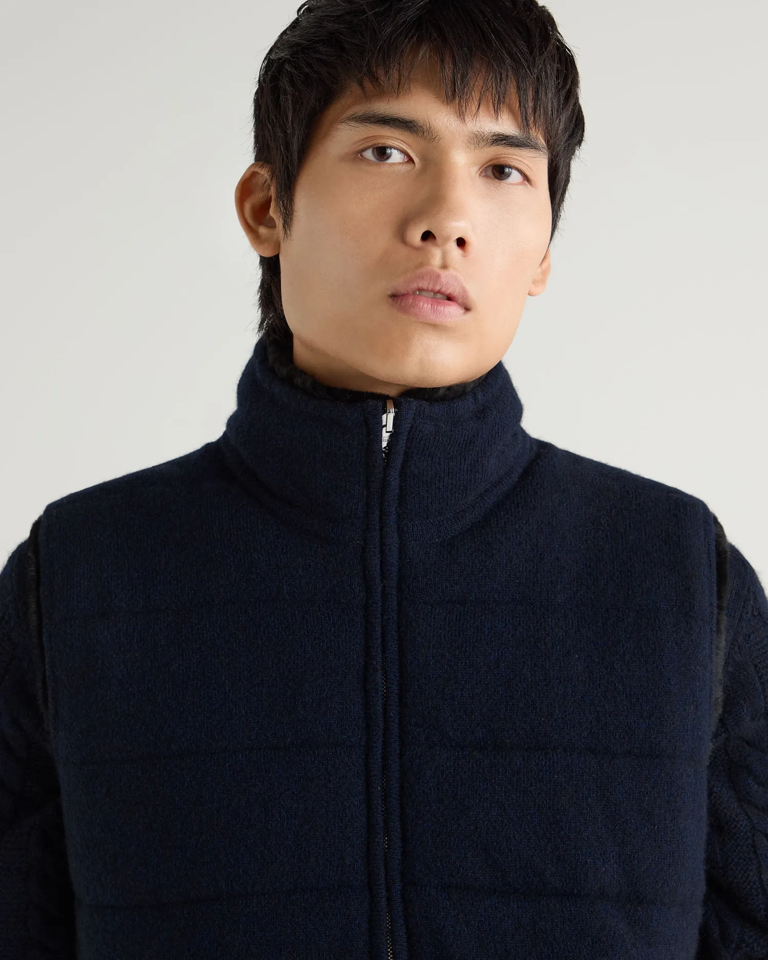 True luxury in a gilet – fur lined cashmere, what could be better? 100% cashmere and navy blue Rex fur – Quilted two layers of cashmere – Inner cotton down filling – Reverse in 100% rex fur with deep pile – Velvety texture – Fur attached by hand – Stunning gilet providing warmth, comfort and style – 1ply – Model is wearing size Medium – Care: Dry Clean Only