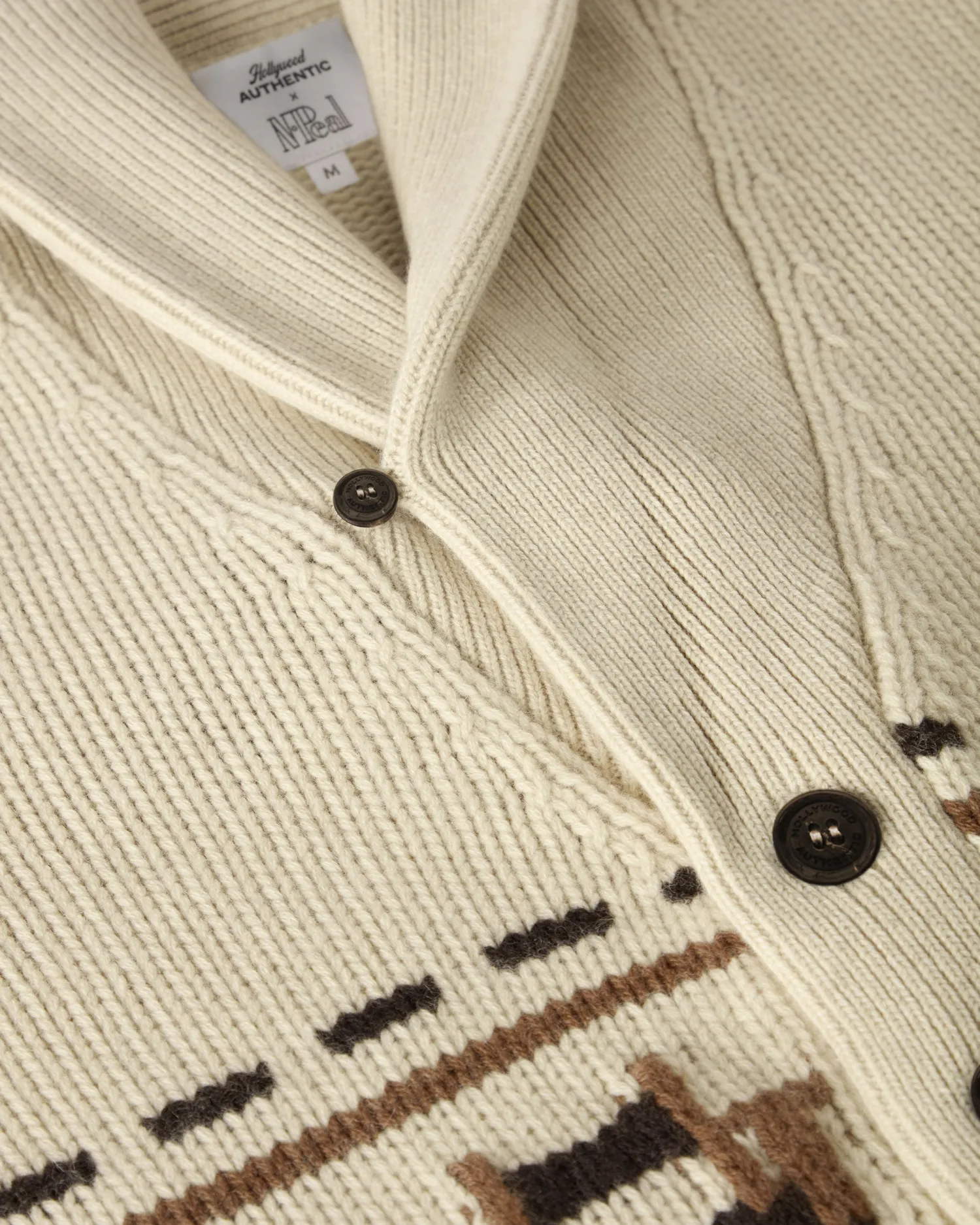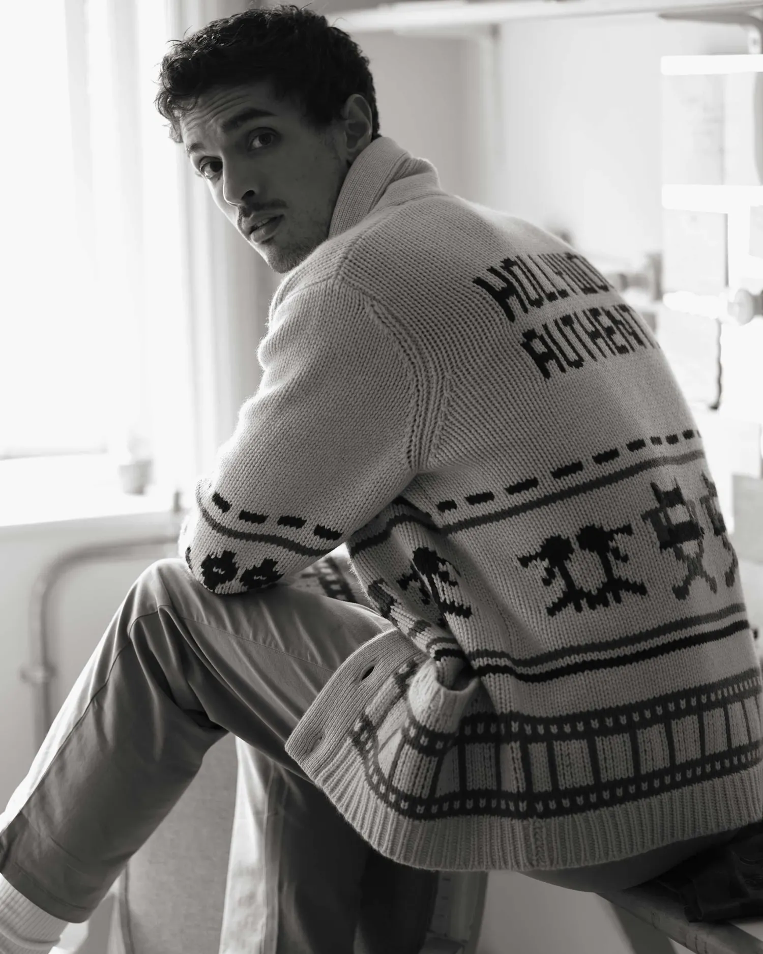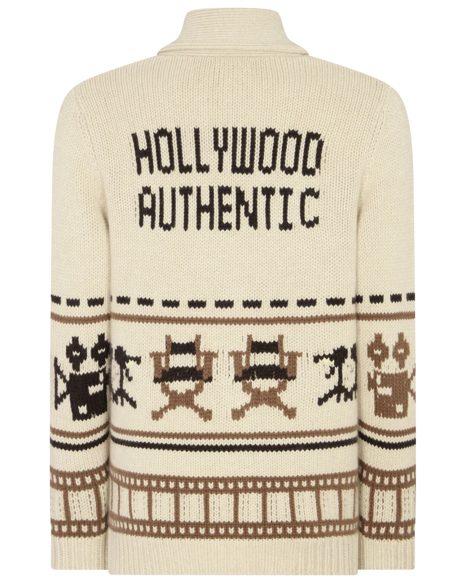 This shawl collar cardigan takes its inspiration from two diverse sources, from Jeff Bridges’ ‘The Dude’, to the shawl cardigan worn by Marilyn Monroe in her final photoshoot. The Hollywood Authentic Shawl Cardigan is an ode to the silver screen. Generous shawl collar style with five ‘Hollywood Authentic’ buttons to fasten and one on shawl collar- Expertly crafted from 100% organic Mongolian cashmere of the highest quality- `Hollywood Authentic’ intarsia detail on reverse- Intarsia design also features iconic Hollywood motifs: Director’s chair, Studio lights and celluloid film reel- Two hidden front pockets- 8ply- Hand Wash