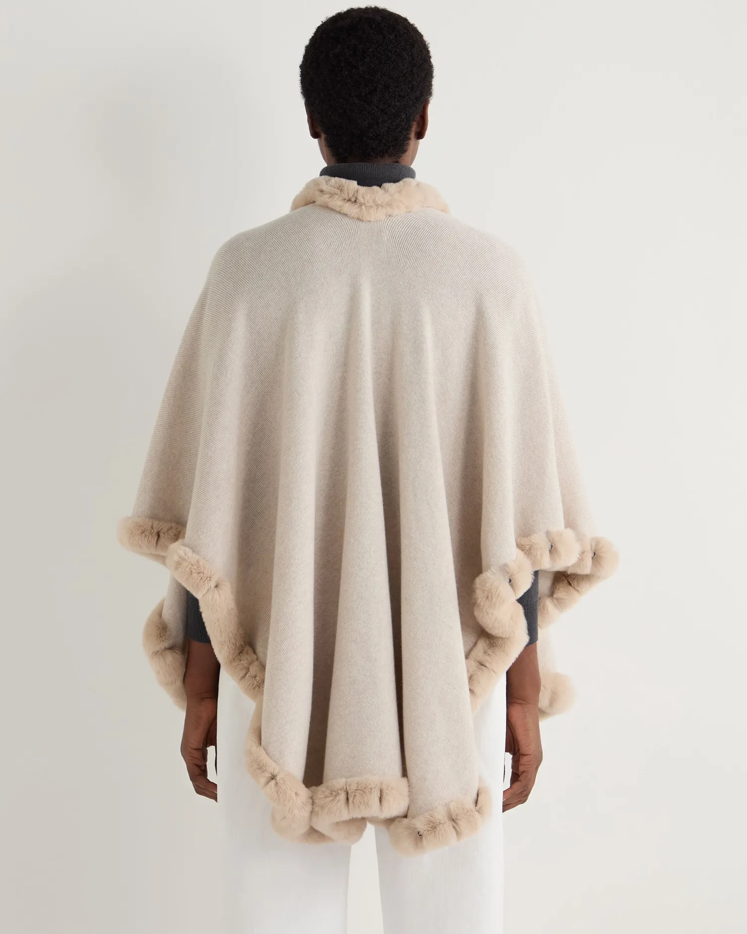 A fabulous cape embellished with a with fur trim edge. 100% Mongolian Cashmere and Rex Fur trim- Sand brown tipped Rex rabbit fur trim edging- Indulgent and luxurious- Traditionally elegant- 1Ply- Model is wearing size Small- Care: Dry Clean Onlyn