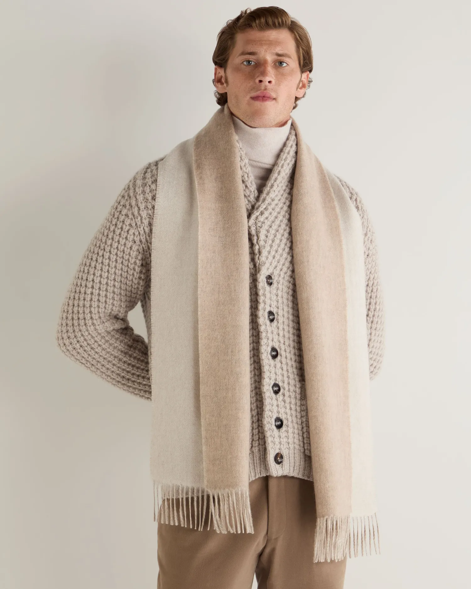 Double cashmere for double luxury, the ultimate scarf. Made from a double layer of 100% Mongolian woven cashmere – Measures a generous 175 x 30cm – The doubleface style gives a wonderful contrast colour look, in frost white and oatmeal brown- Woven rather than knitted for extra structure – Beautifully soft and warm – Delightfully soft against the skin – Care: Dry Clean Only