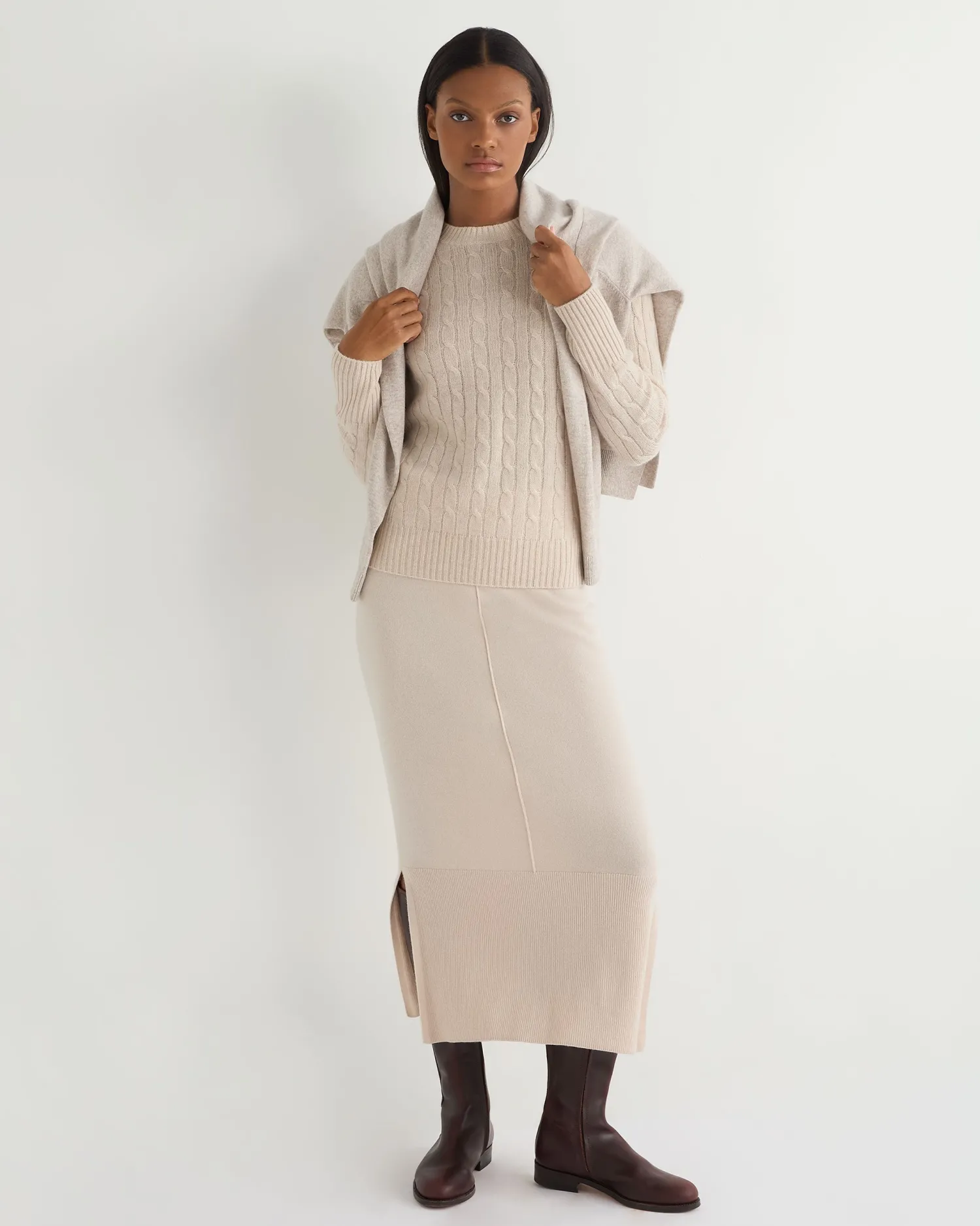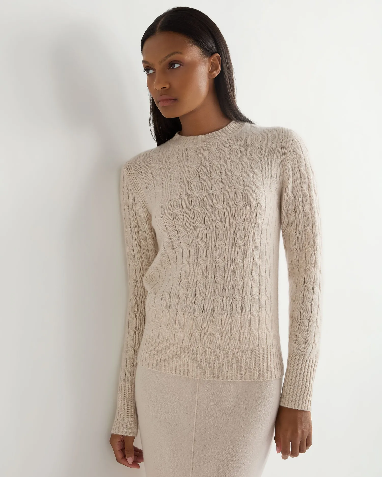 N.Peals new Adelyn cable round neck is a perfect blend of classic style and modern luxury. Made from the finest cashmere, this sweater features a beautifully intricate cable knit design that adds texture and elegance. Made from 100% Mongolian organic cashmere – Matching rib design on collar, hem and cuff – Classic, chic cable design – Incredibly soft and comfortable against the skin – 2ply – Model is wearing size Small – Care: Hand Wash Organic cashmere: organic dyes and detergents, free from fertilizer and pesticides, find out more here