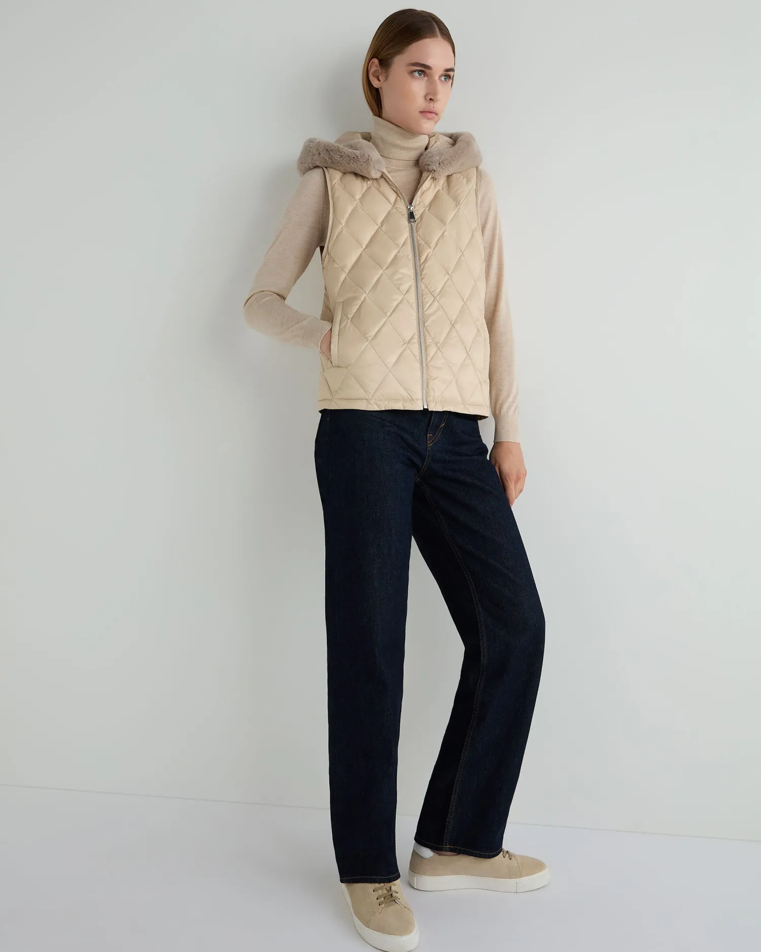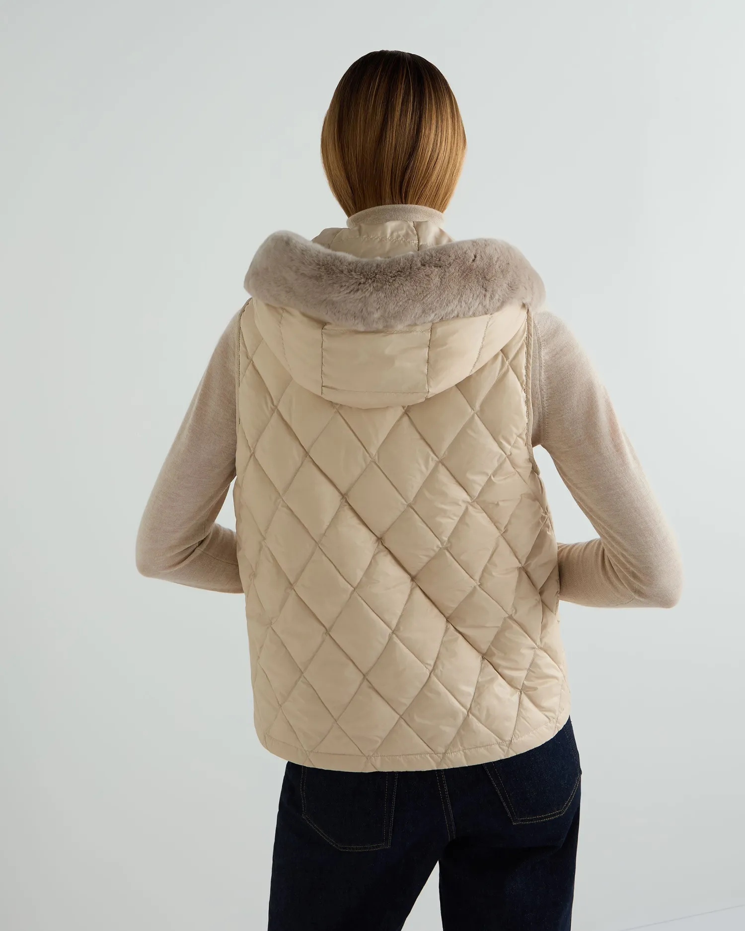 Stay stylishly warm with our new ladies down gilet with a gorgeous rex fur hood.n Made from 100% polyester outer with duck down membrane, and a 100% Rex fur trim Featuring a striking diamond stitch pattern across the body, adding texture and a refined touch to its design The beautiful fur hood offers an extra layer of warmth This gilet provides lightweight insulation without compromising on style This versatile design allows for effortless layering over your favourite sweaters Featuring a zip and side welt pockets Impeccably soft, comfortable and stylish Model is wearing size Small Care: Dry Clean Only