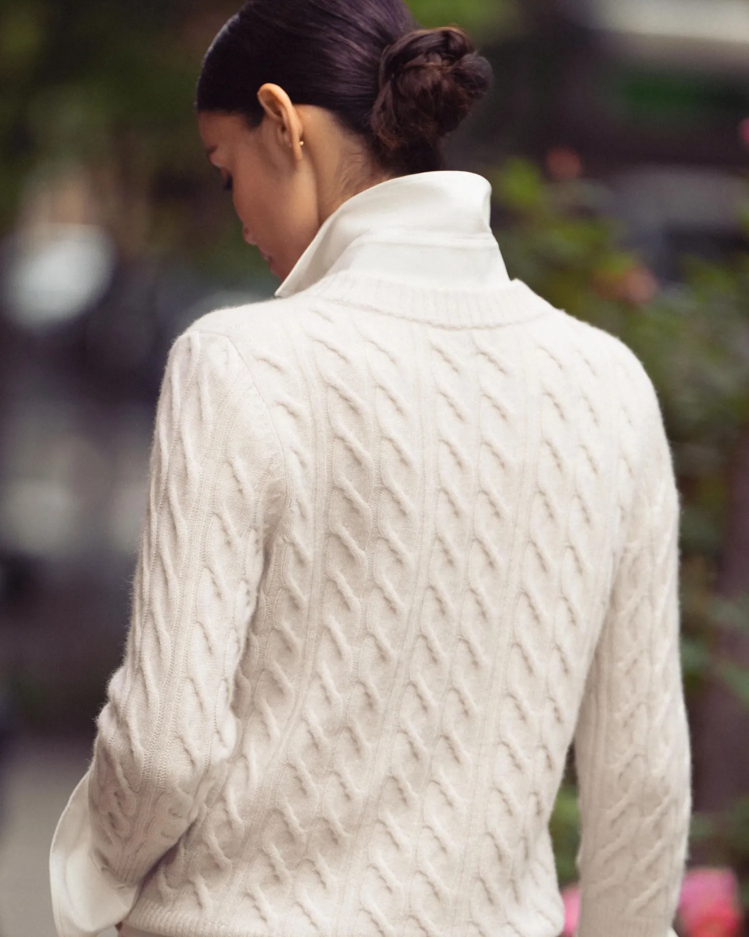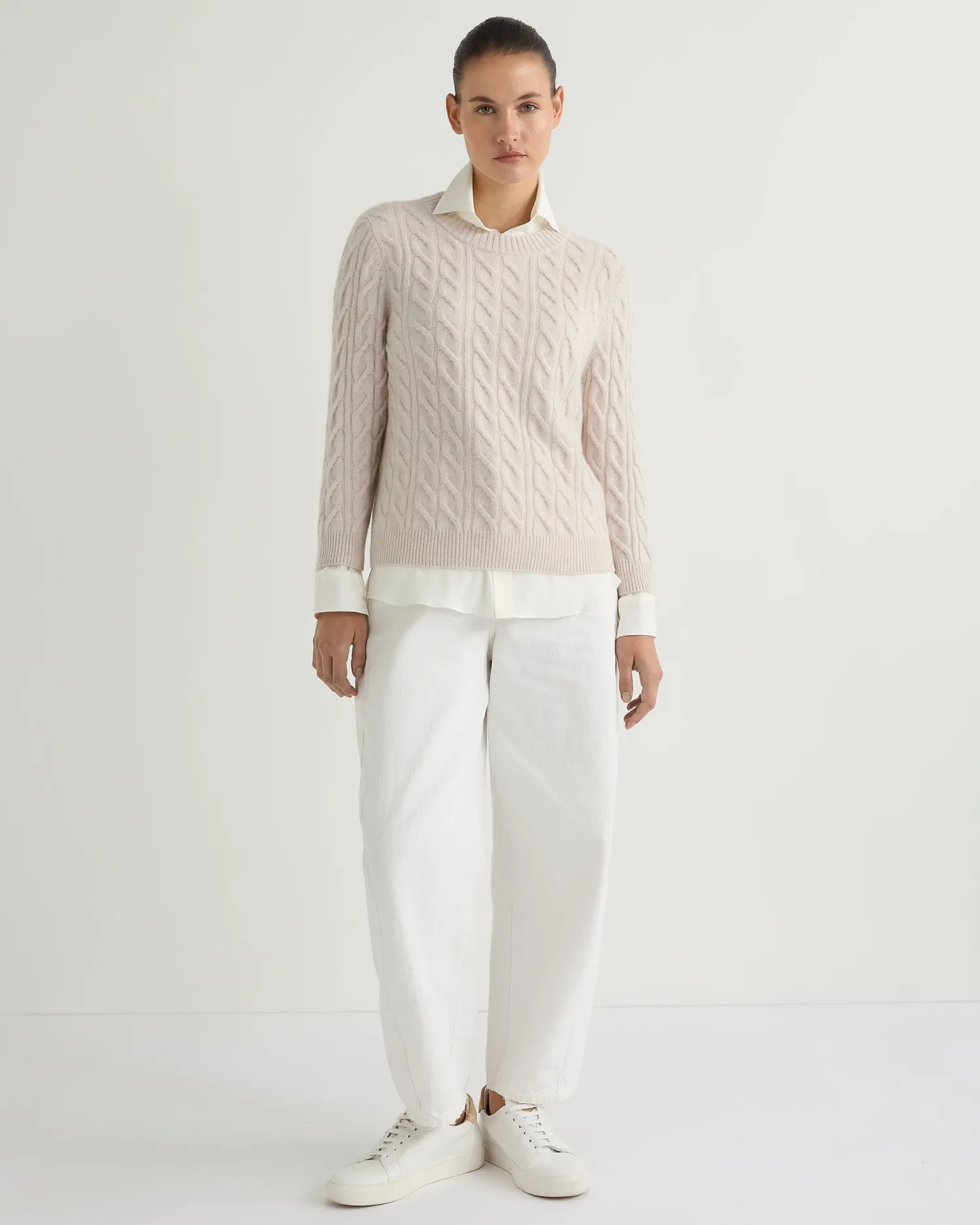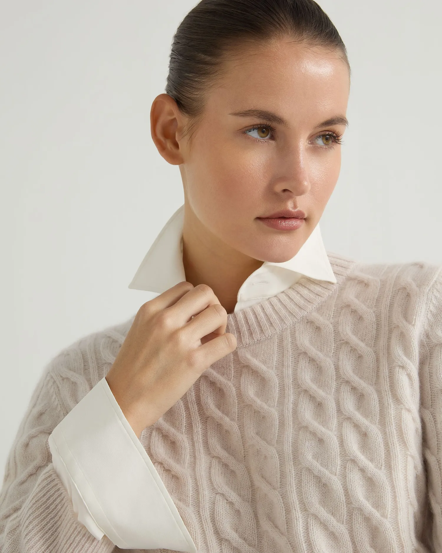 Take a look at this beautiful round neck sweater in cable cashmere. Crafted from 100% Mongolian organic cashmere – Modern look shorter boxy style – More contemporary fit – Modern cable knit pattern – 3/4 length sleeves – Matching rib cuffs and collar – Elegant ribbed round neck – 2ply – Model is wearing size Small – Care: Hand Wash Organic cashmere: organic dyes and detergents, free from fertilizer and pesticides, find out more here