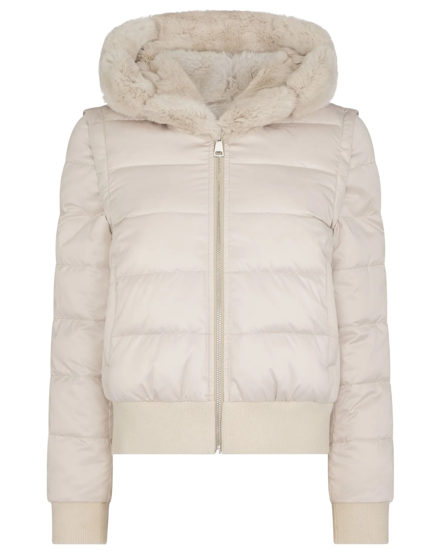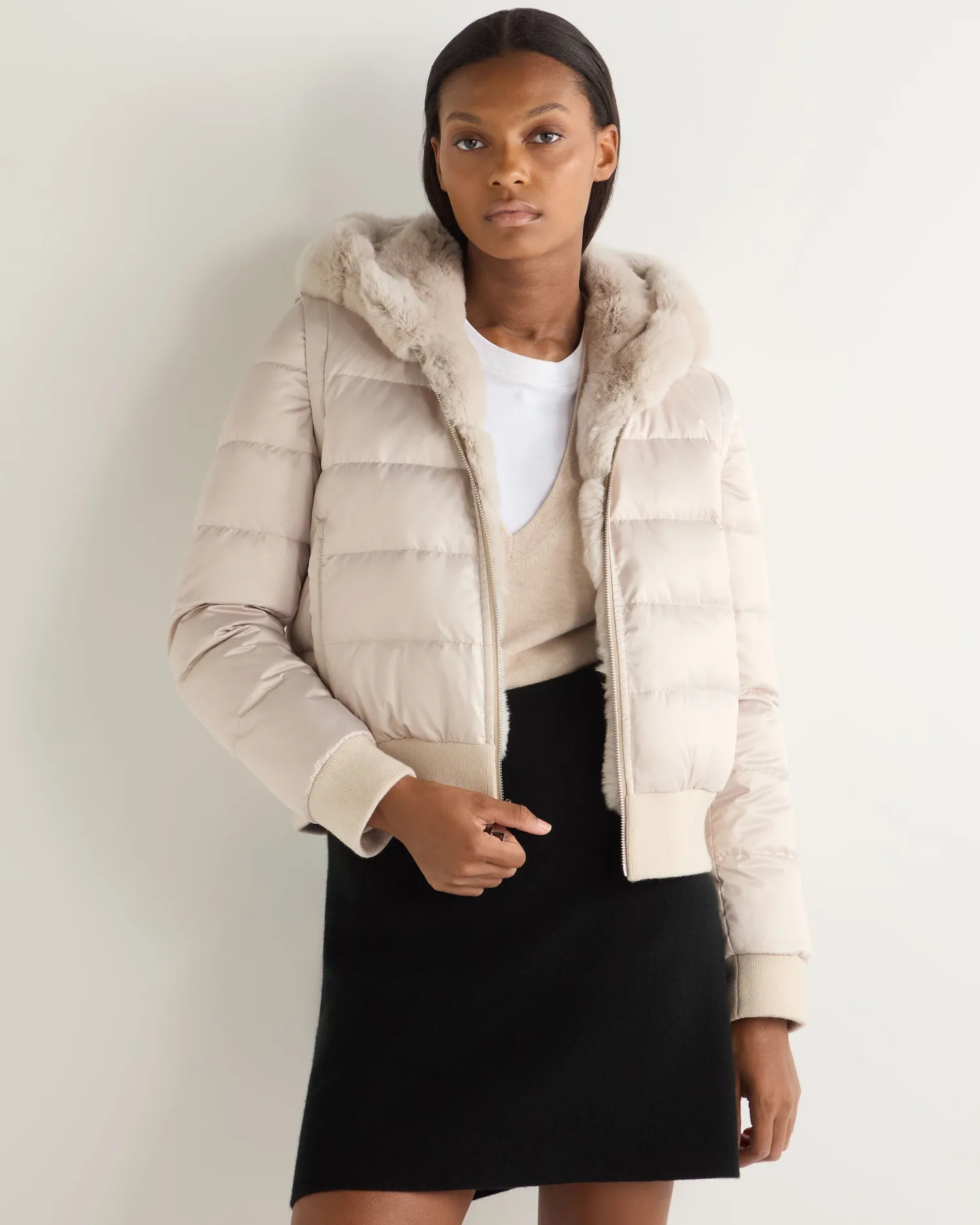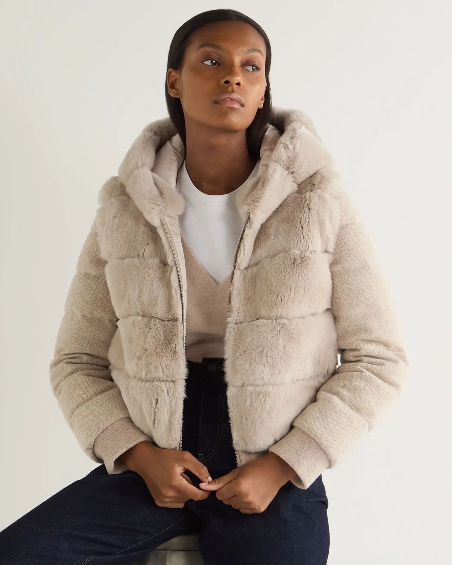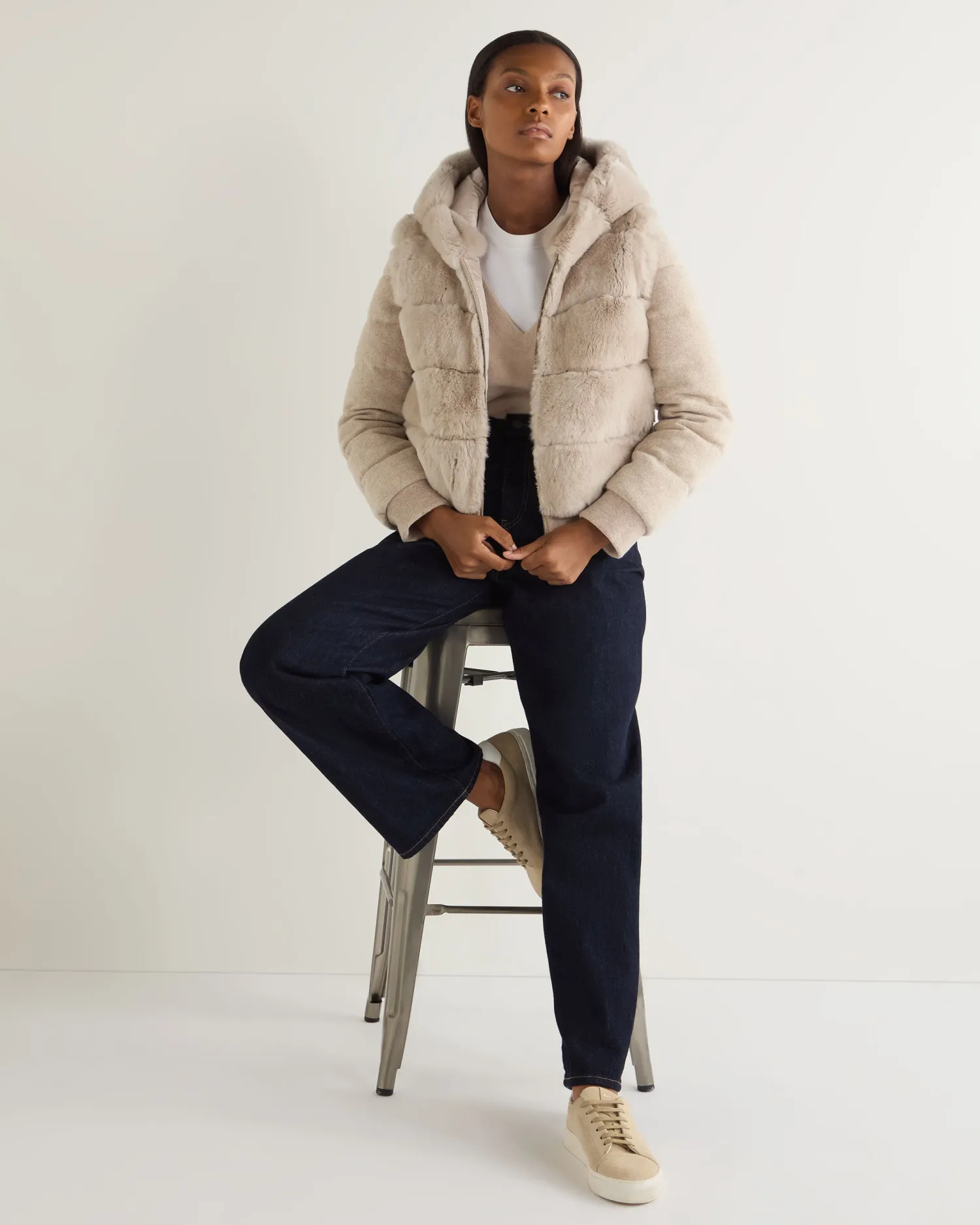 Step into a world where sophistication meets warmth with the Eva Birdseye fur hooded jacket, a masterpiece by N.Peal.n Made from 90% wool, 10% organic Mongolian cashmere and rex fur Luxuriously soft and comfortable, yet still so stylish Convenient zip to be either worn open or zipped up Gorgeous fur hood, ideal for the cold months Has detachable sleeves so can be worn as a jacket or gilet Reversible style with Rex fur one side and technical polyester on interior side Impeccably soft against the skin Model is wearing size Small Care: Dry Clean Only