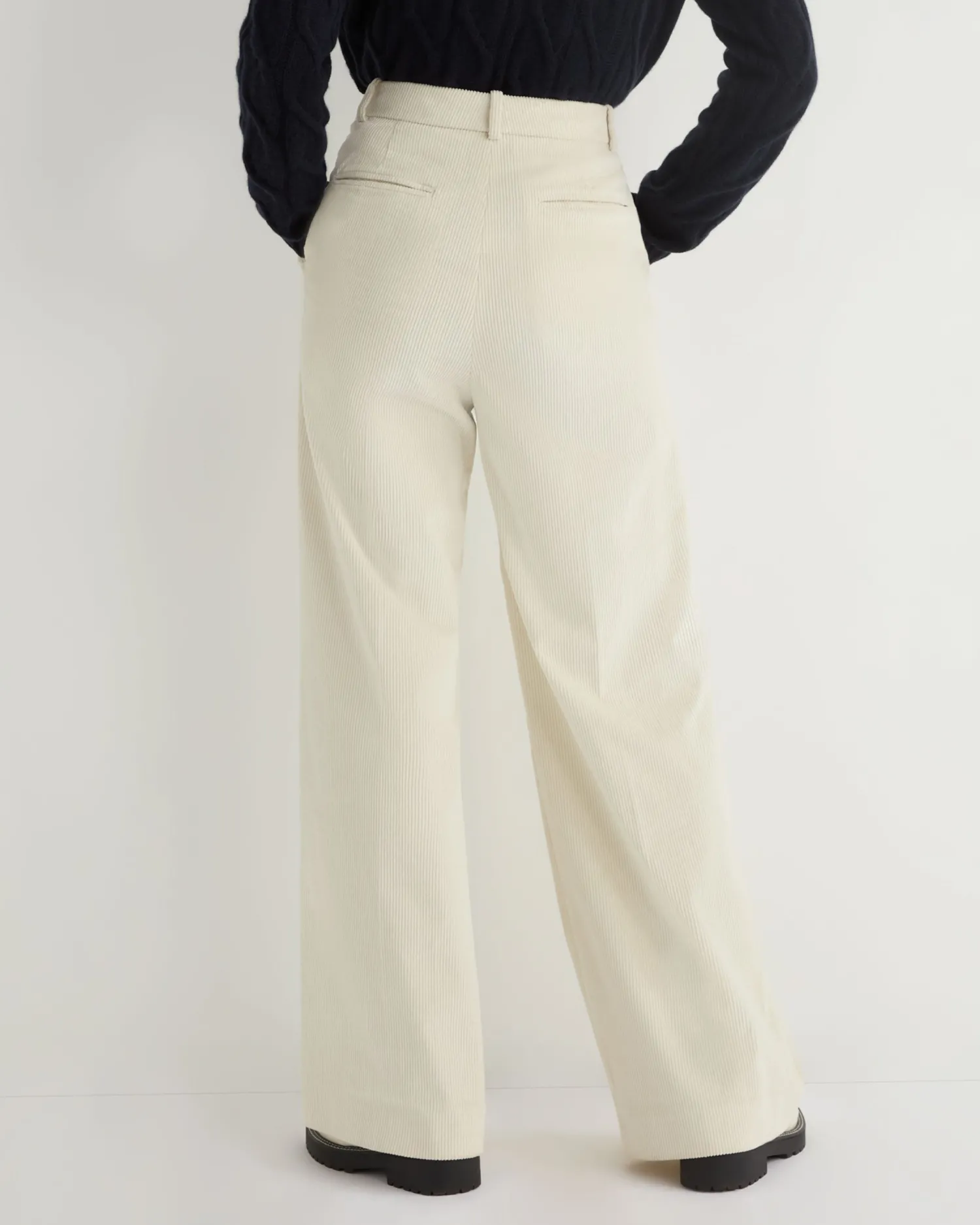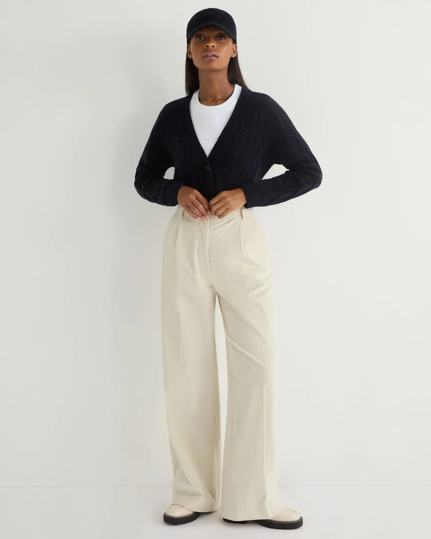 The N.Peal wide-leg pant is designed with a relaxed silhouette and strategically placed pleats that accentuate its high waistline. Crafted from a cotton cashmere cord produced by a leading Italian mill; the cashmere provides fluidity to the garment while the cotton provides softness. Made from 91% cotton, 7% cashmere and 2% elastane – Wide leg style, comfortable and loose fitting style – Hidden hook and zipper closure – Welt pockets with back flap pockets – Soft corduroy material – Model is wearing size Small – Care: Dry Clean Only