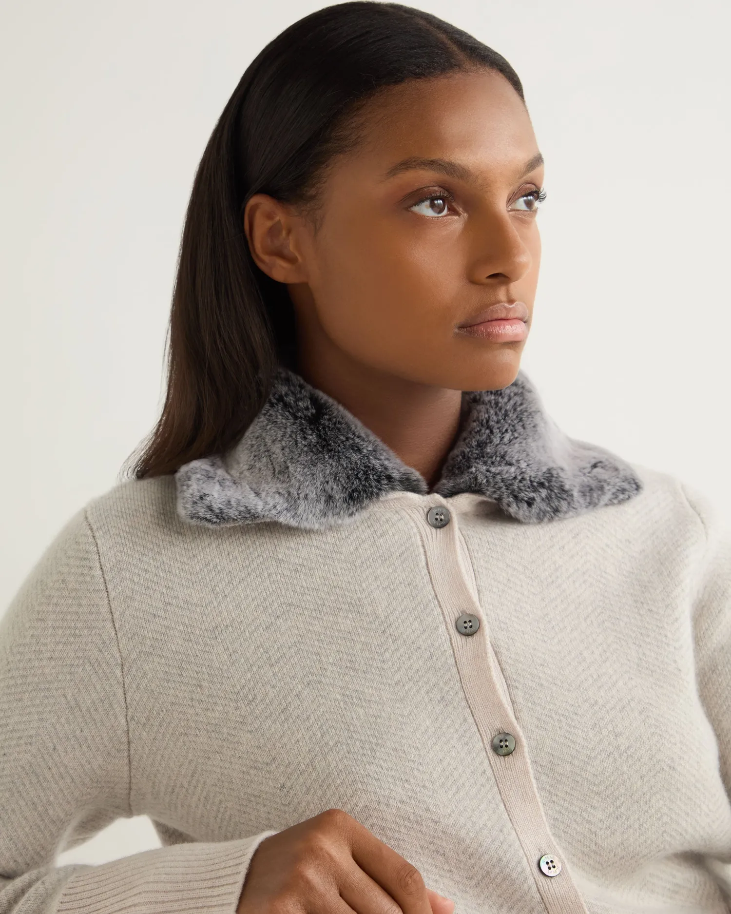 This style was so popular last winter that we have brought it back in a new colourway! Made from 100% Mongolian cashmere with a detachable white tipped rex fur trim – Delightful herringbone pattern in luxurious frost white and fumo grey- Matching deep ribbed cuffs and hem – Elegant design with luxe appeal – Fastens with elegant buttons, can be worn alone or as a layering piece – 1ply – Model is wearing size Small – Care: Dry Clean Only