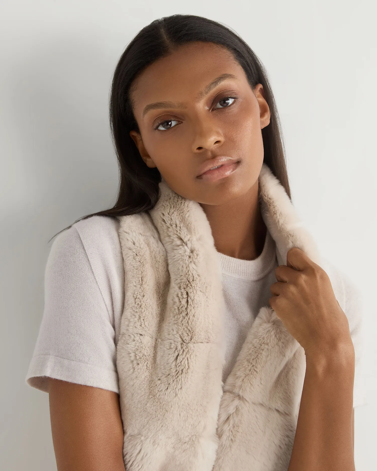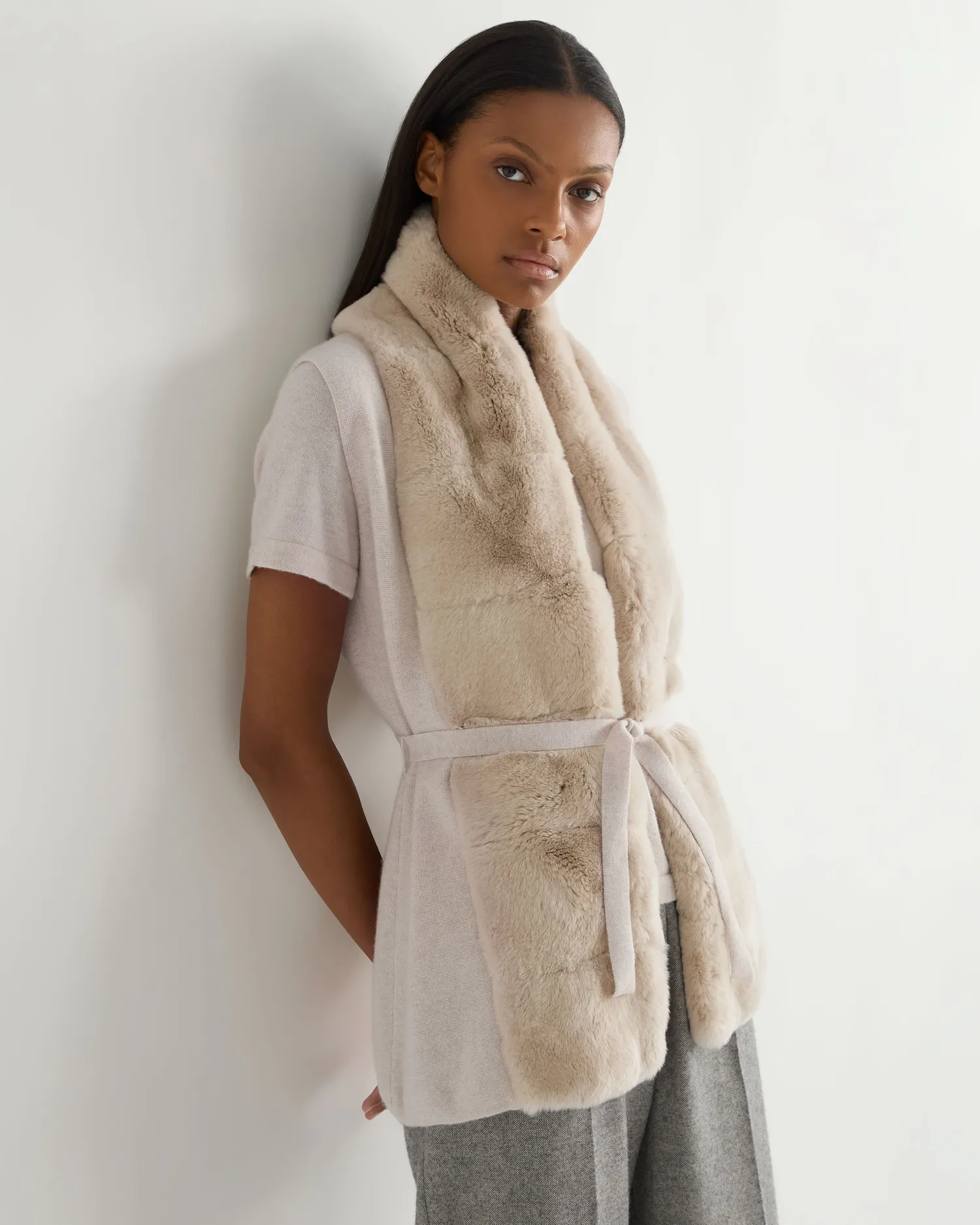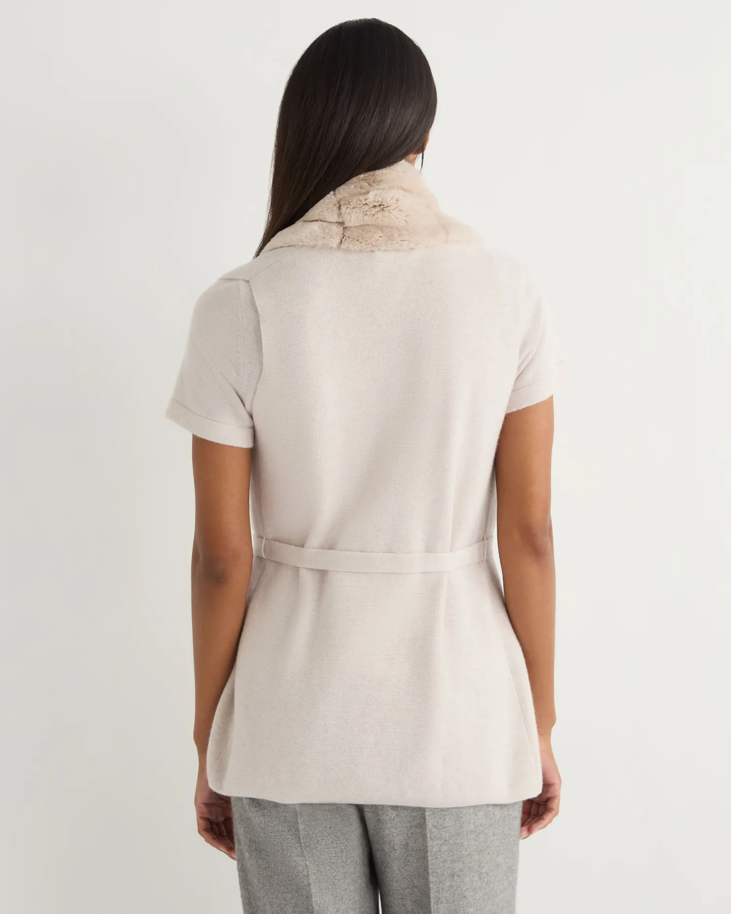 This popular style combines Milano stitch and fur trim – surely the perfect gilet? 100% Mongolian cashmere with Rex fur trim – Milano stitch cashmere for texture – Snow grey Rex rabbit fur placket trim – Stylish and flattering – 1ply – Model is wearing size Small – Care: Dry Clean Only
