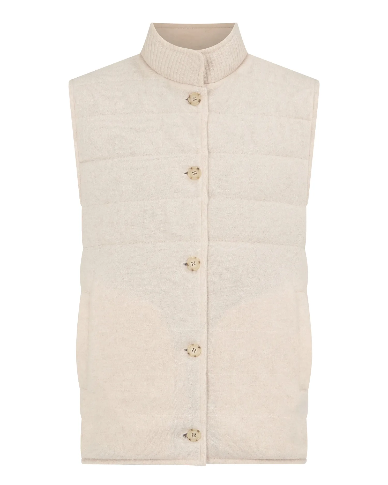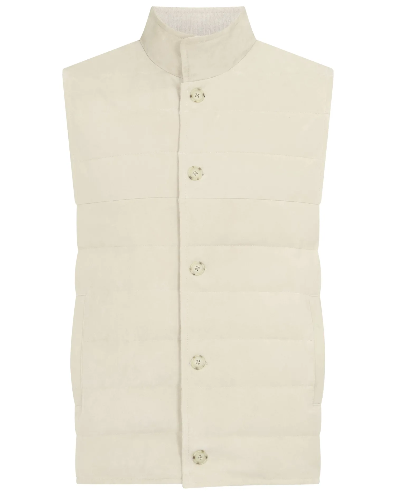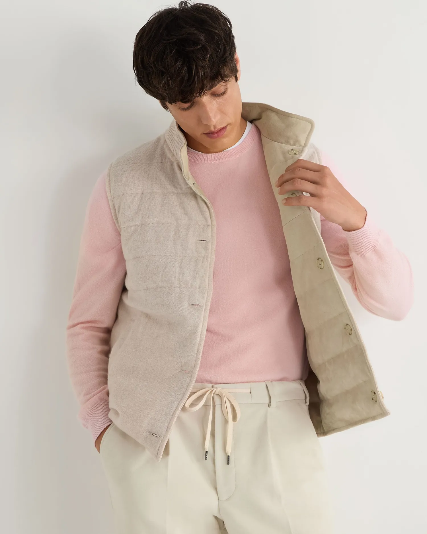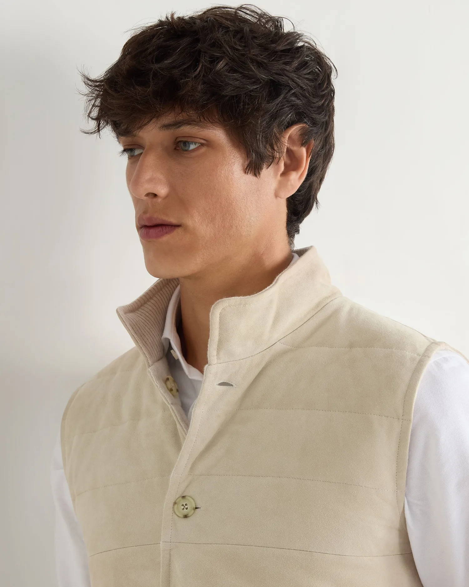 This luxurious gilet is crafted from the fine, velvety texture of suede for a sophisticated layering style. The exterior is designed with clean channel stitching and the interior is crafted in our refined organic cashmere. The inner membrane of light cotton padding ensures ultimate comfort. Reversible style, one side 100% suede and the other side 100% cashmere- Luxuriously soft gilet – Horizontal stitch design – Five smart buttons down the centre – Comfortable and stylish fit – Practical subtle pockets – Versatile piece, effortlessly works casually or more formal – Perfect for wearing with a T-shirt or layering up in colder weather – 1Ply- Model is wearing size Medium – Dry Clean Onlyn