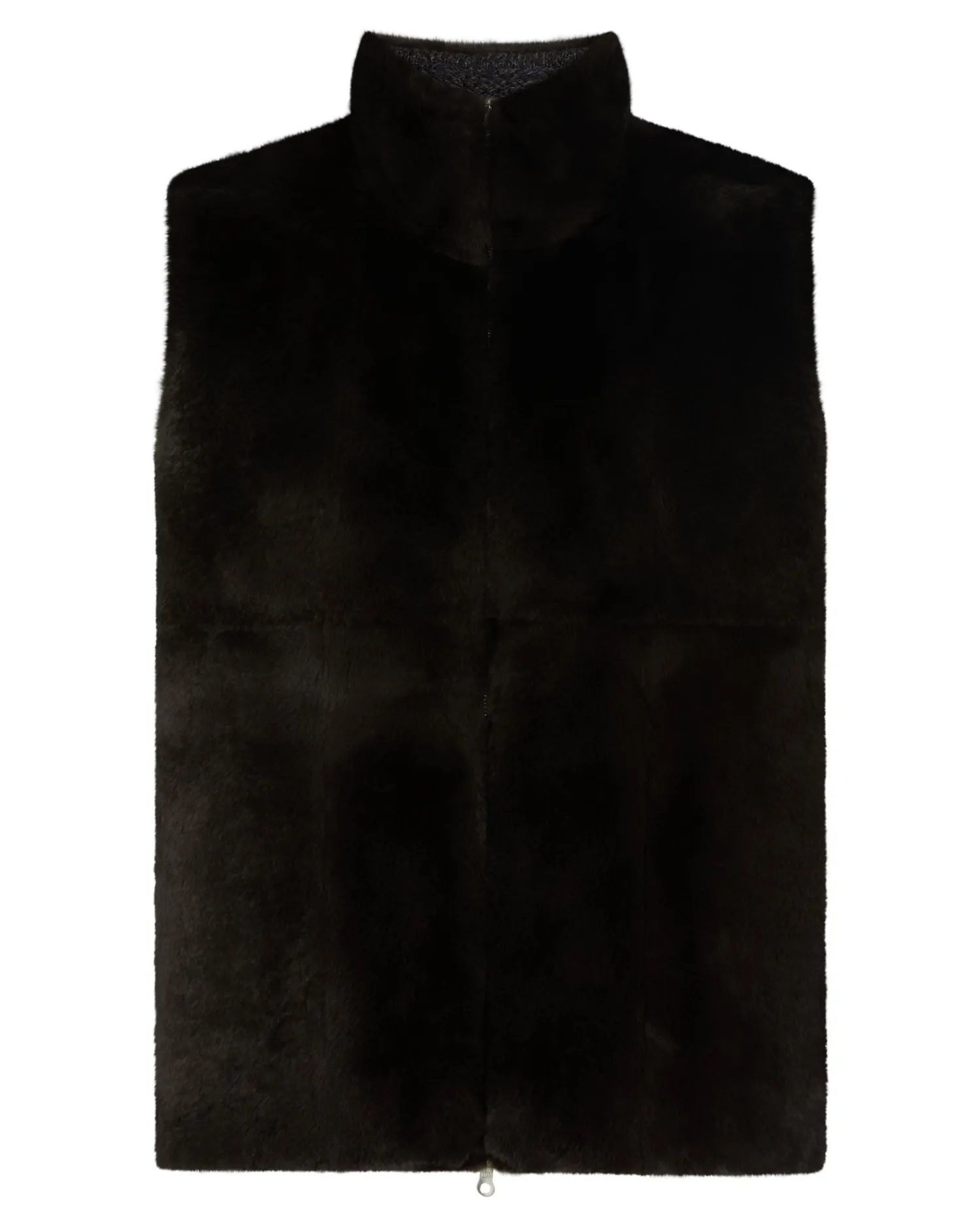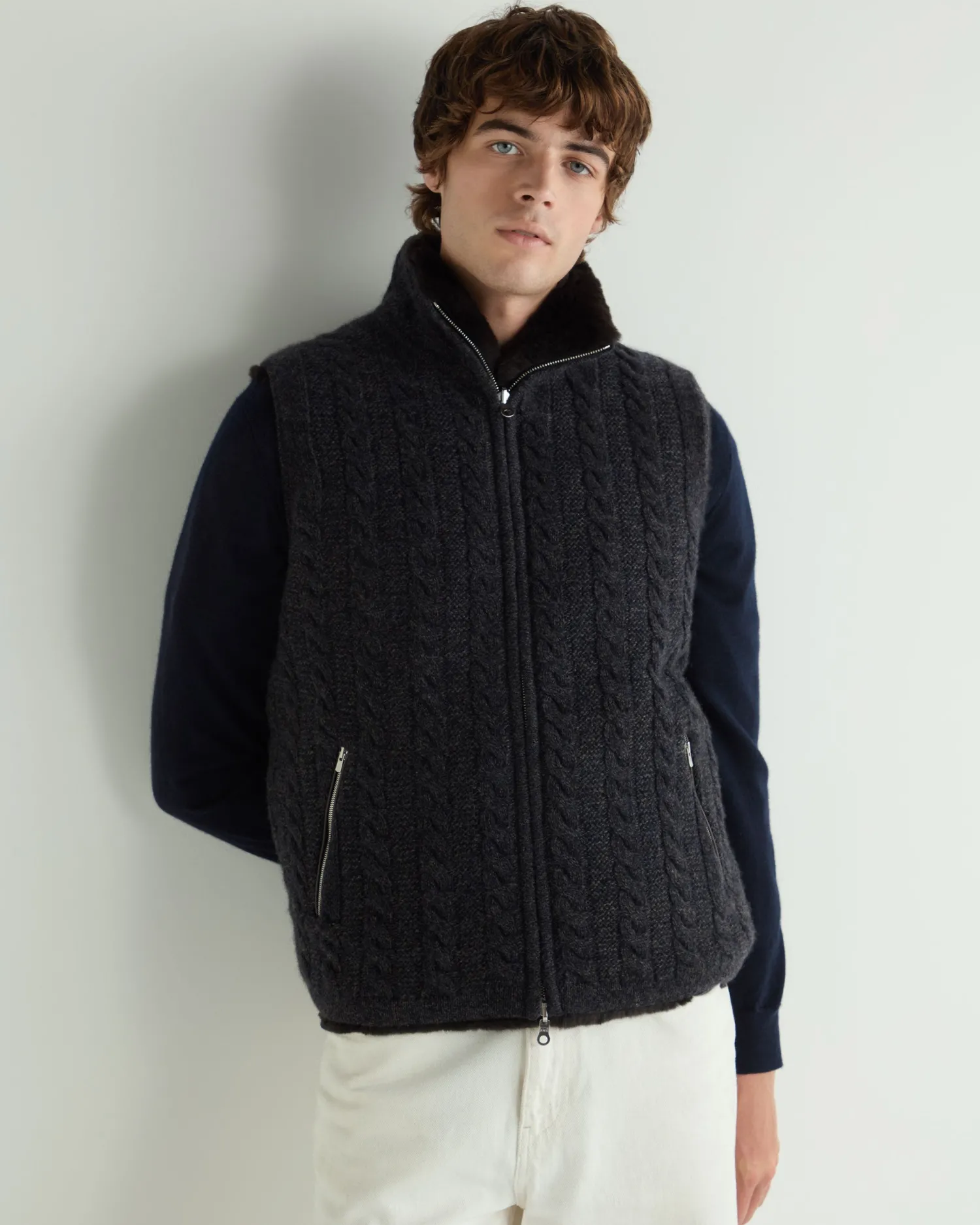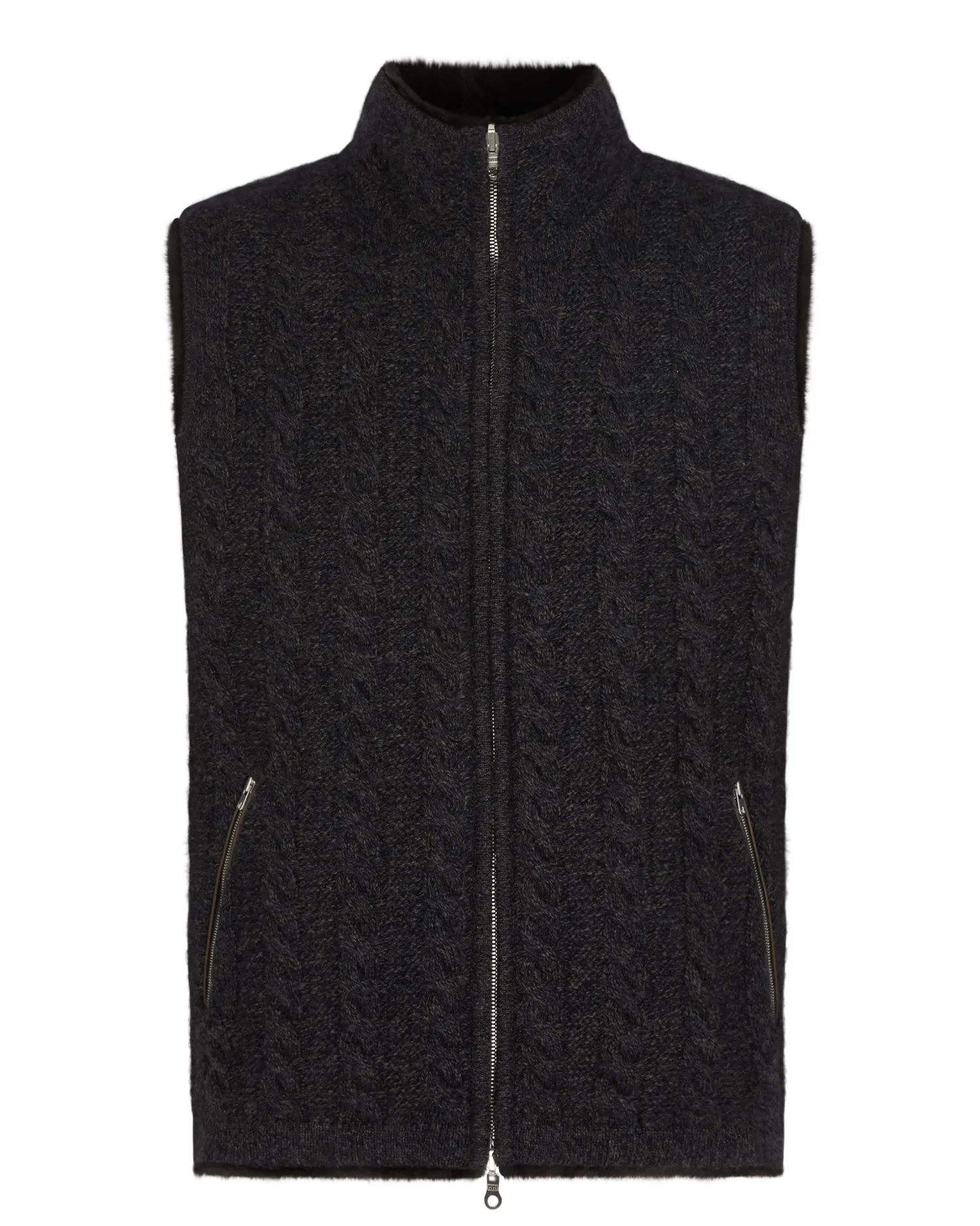 Cashmere and cable combine to make the finest possible fur lined gilet. 100% Mongolian cashmere with dark brown Rex fur lining – Beautiful cable knit cashmere – Full length two-way zip – Two zipped pockets – Perfect layering piece – Number one for comfort and style – 3ply – Model is wearing size Medium – Care: Dry Clean Only