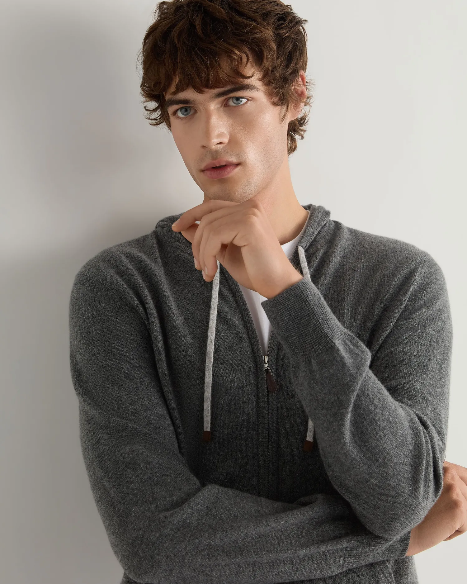 Leisure and luxury is combined here in a cashmere hooded zipped top. 100% Mongolian organic cashmere – Full length two-way zip – Smart leather toggle – Fumo grey contrast drawstring- Ultimate in casual cashmere – 1ply – Model is wearing size Medium – Care: Dry Clean Only Organic cashmere: organic dyes and detergents, free from fertilizer and pesticides, find out more here