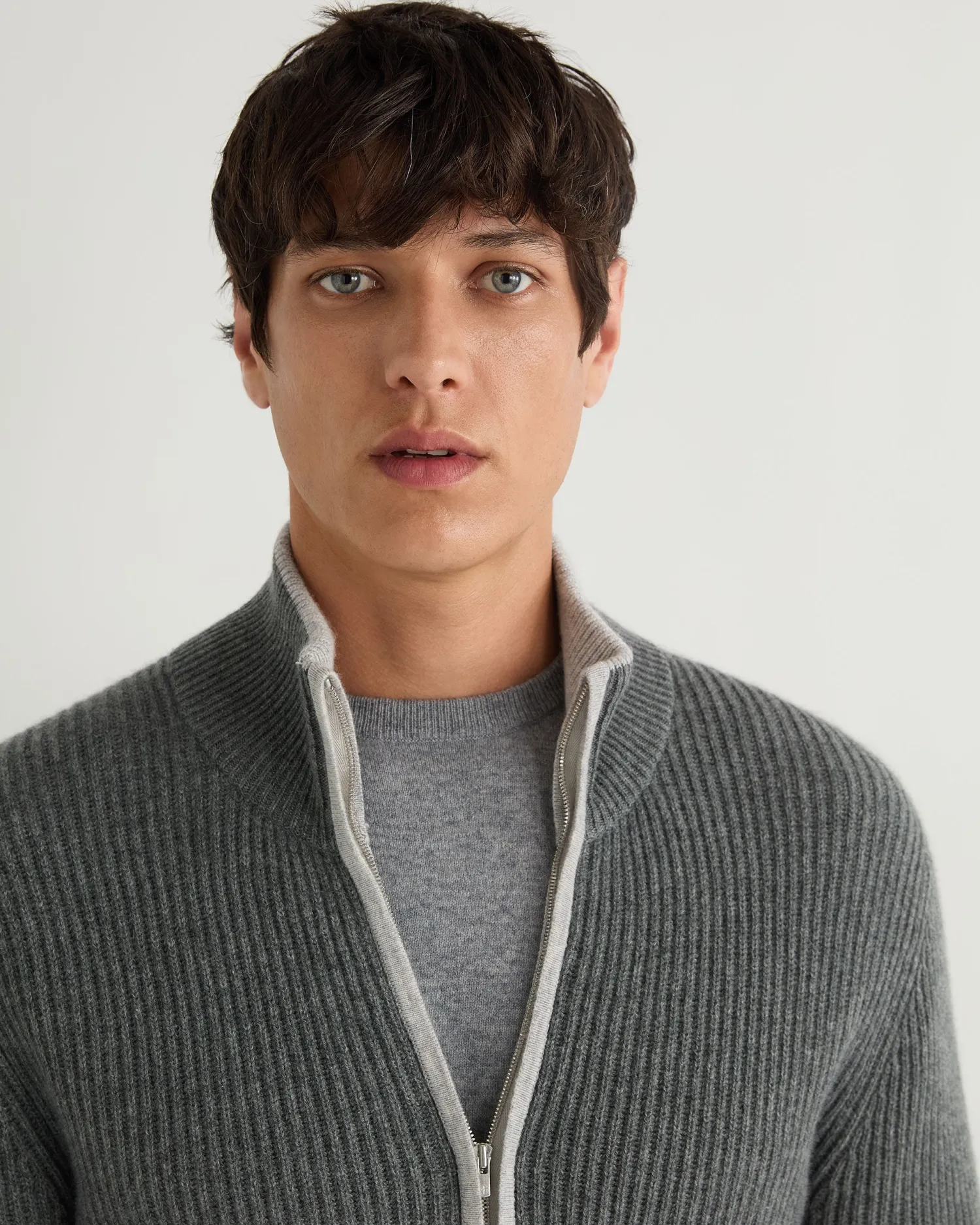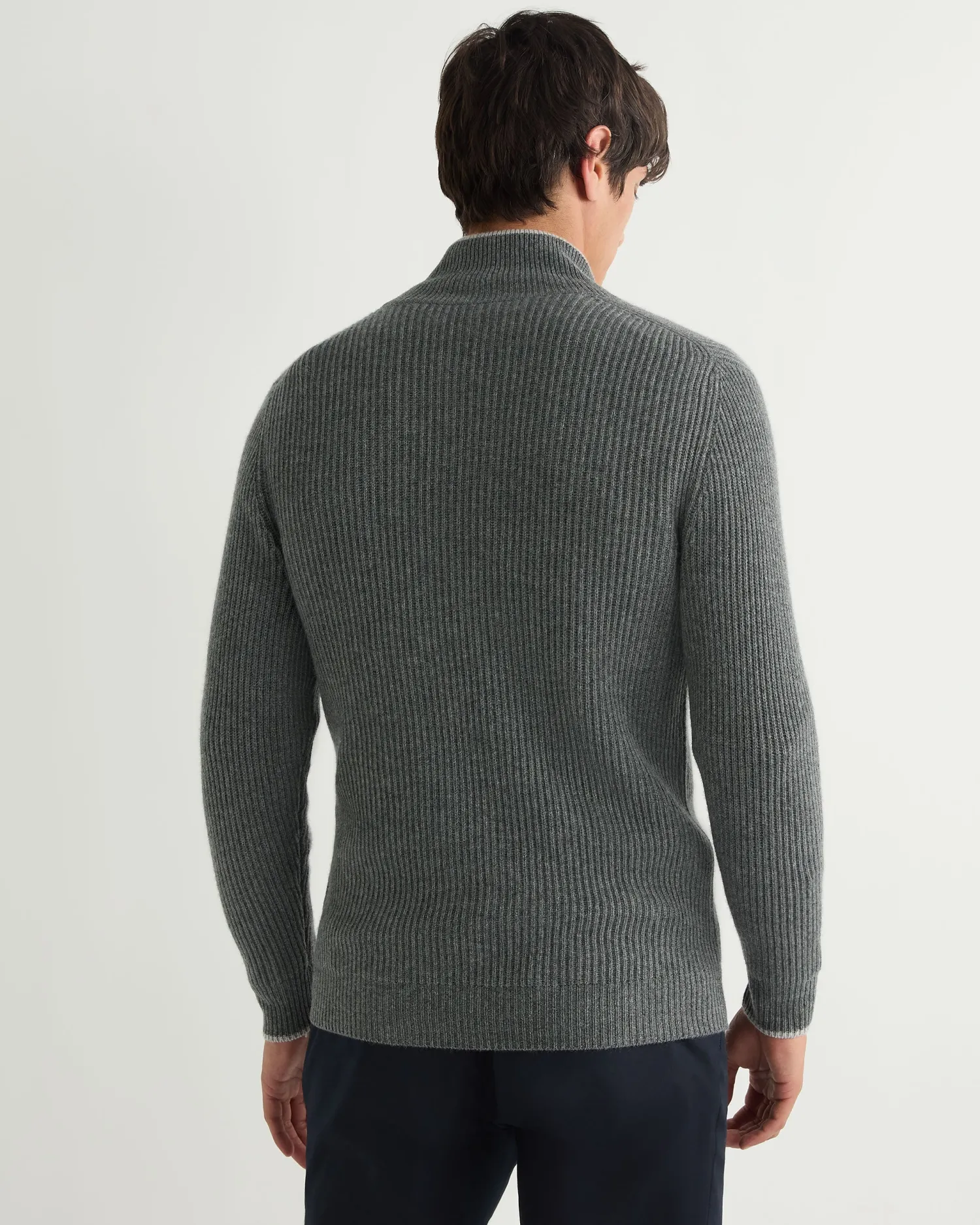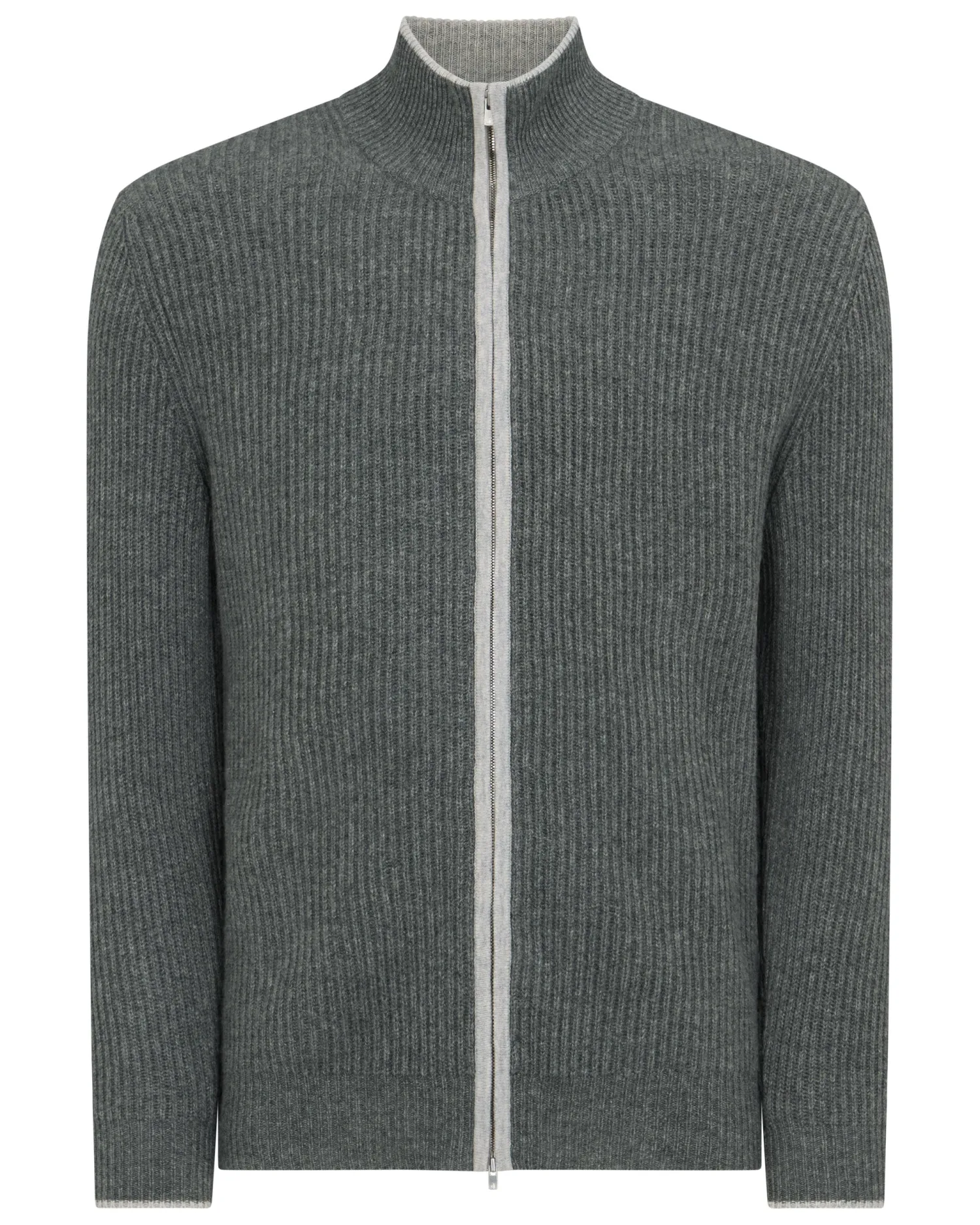 Another popular zip through cardigan style. Made from 100% organic Mongolian cashmere – Smart two-way zip – Enhanced with delightfully rib knitted cashmere – Great design and subtle stretch – Flattering vertical rib structure – Fumo grey contrast edging and collar – Great worn over our polo necks or a shirt/T shirt- 2Ply- Model is wearing size Medium – Care: Hand Wash Organic cashmere: organic dyes and detergents, free from fertilizer and pesticides, find out more here