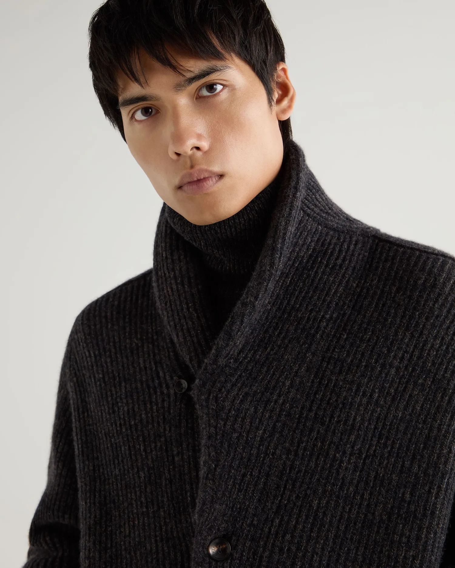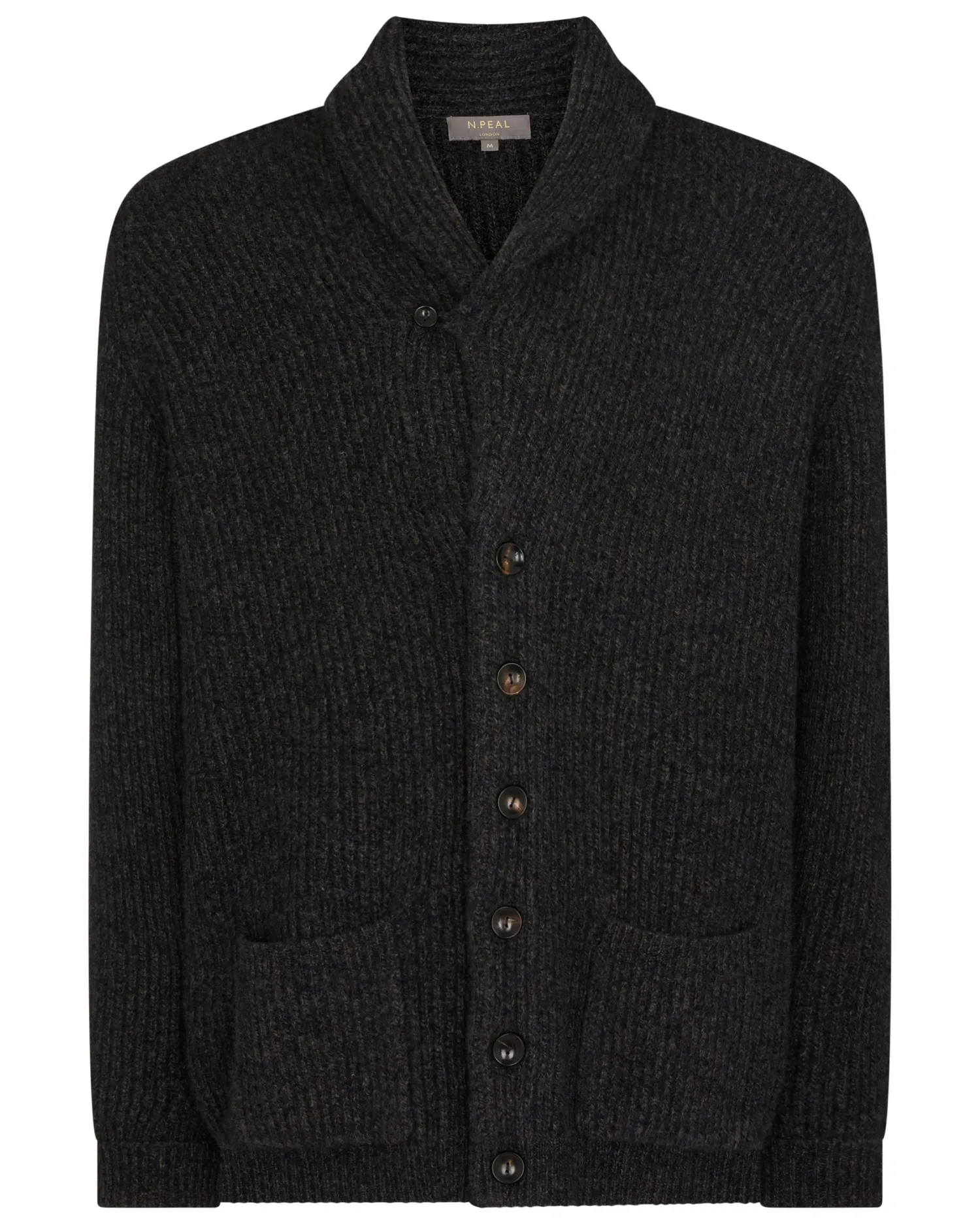 The ultimate in cashmere cardigans, utterly beautiful in design and creation. n Made from 100% Mongolian cashmere Heavy rib knit Smart button fastening Two patch pockets Generous and luxurious shawl collar design Turned up cuff 3ply Model is wearing size Medium Care: Hand Wash