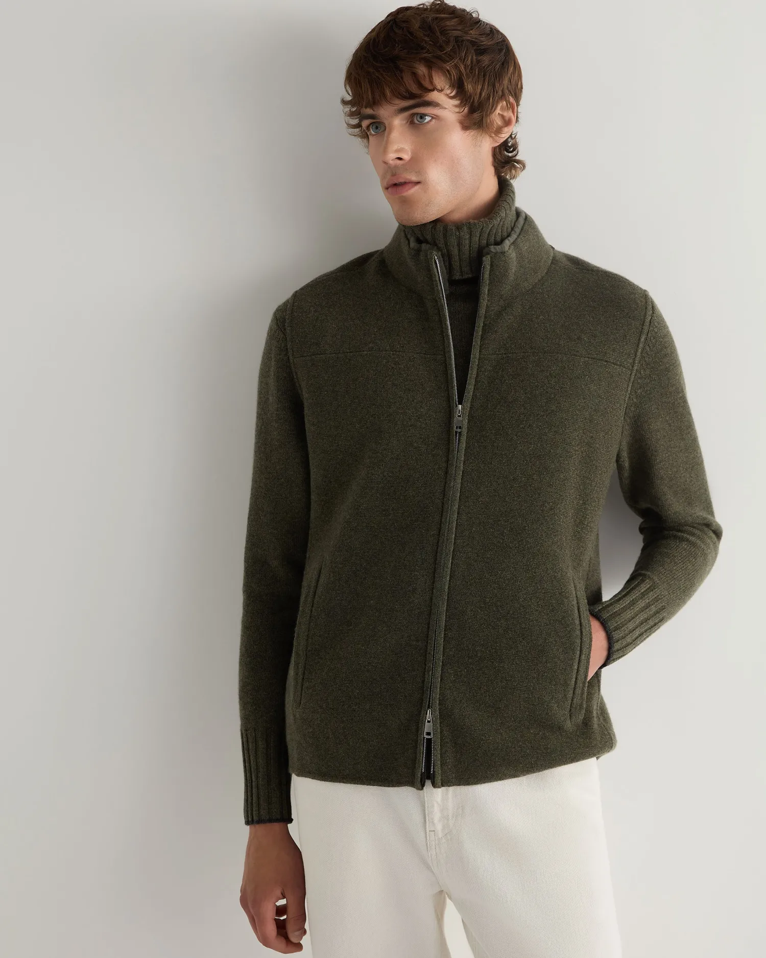 Our fabulous new Rex trim gilet, an essential piece that transforms any outfit. Made from 100% organic Mongolian cashmere and rex fur – The collar features a luxurious dark olive rex fur trim – A convenient two-way zip, allowing for versatile styling – Perfect for layering over a sweater in the cool months – Comfortable, soft, luxurious and easy to easy and style – This gilet features discreet pockets for convenience – An essential in for any wardrobe this winter – 1ply – Model is wearing size medium – Care: Dry Clean Only
