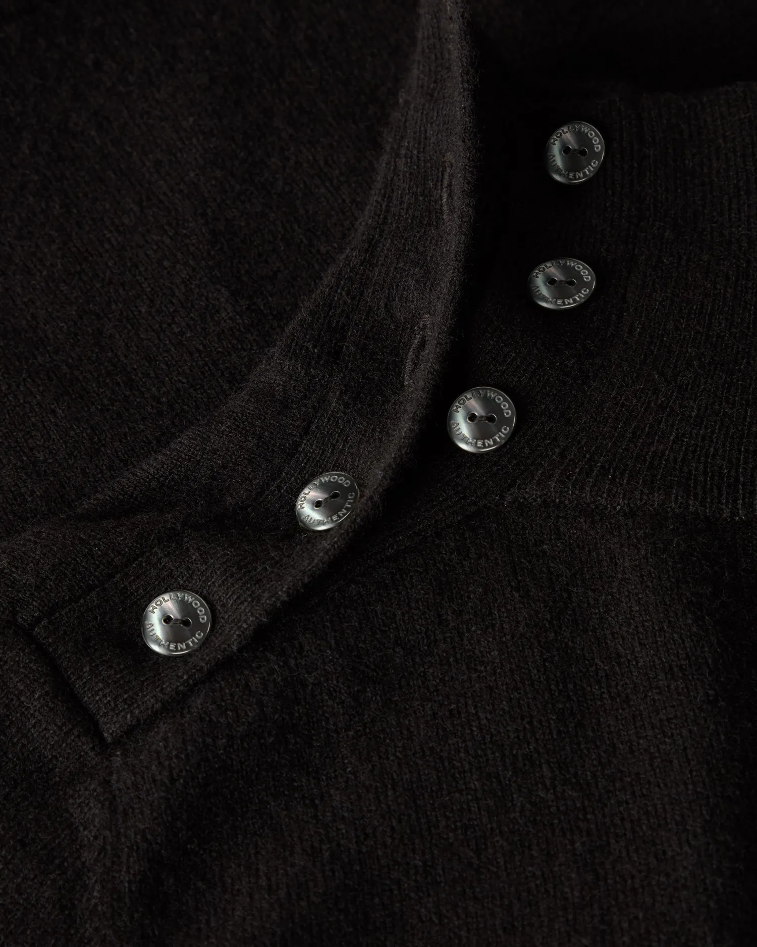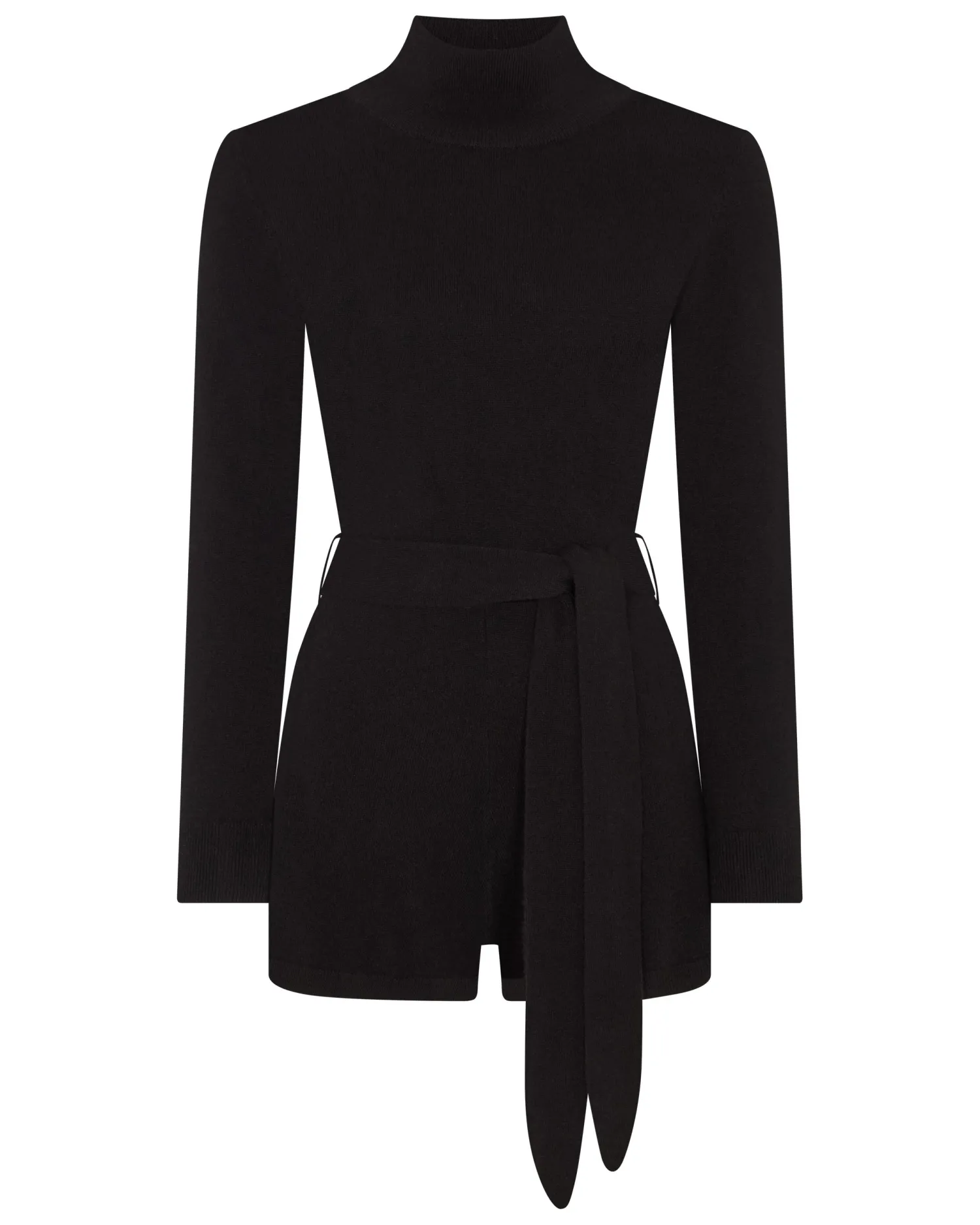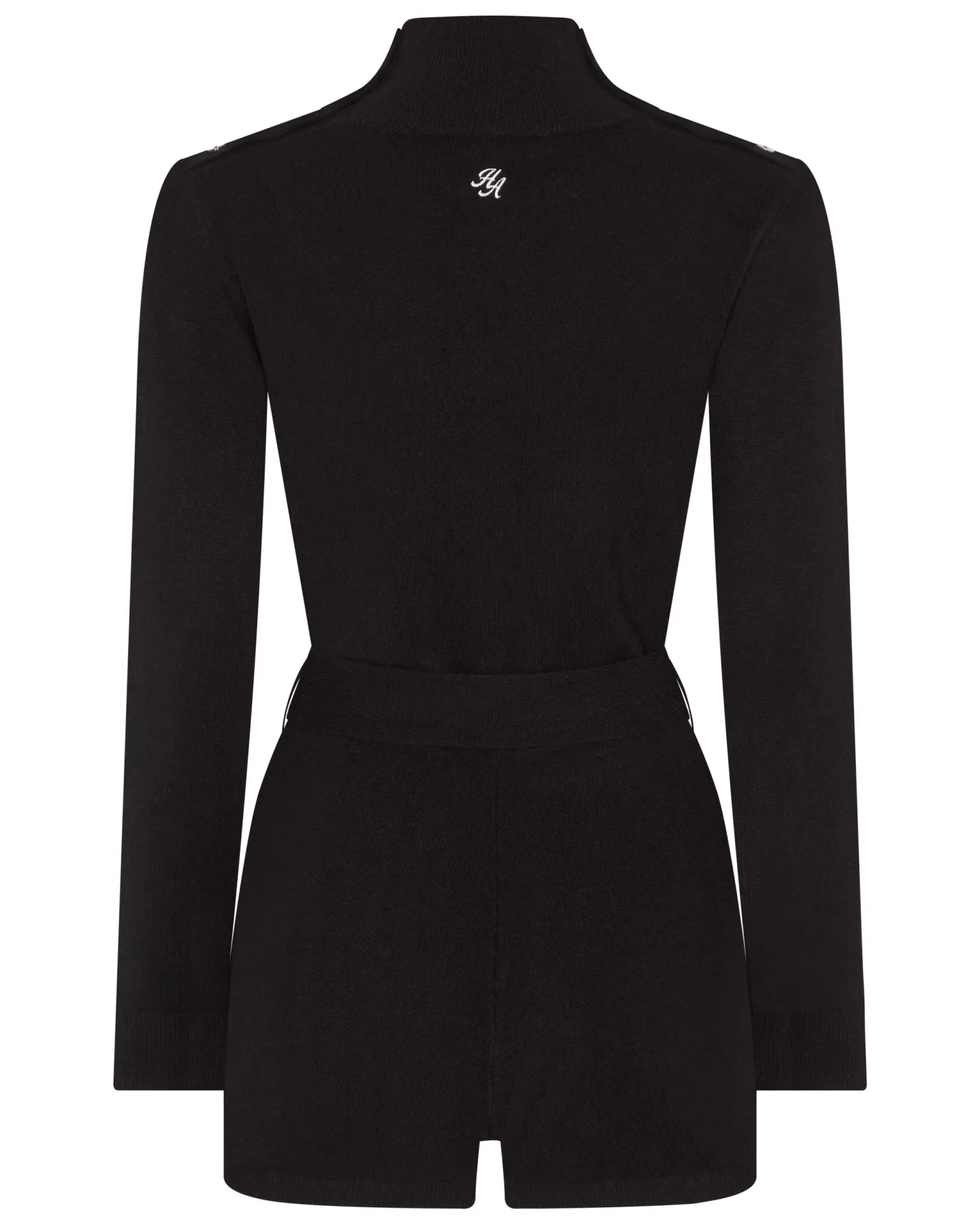 A staple of Film Noir, the Femme Fatale is a character whose beauty is matched by great power. Taking inspiration from two of cinema’s female trailblazers and N.Peal customers, Elizabeth Taylor u0026amp; Ava Gardner, this jet black play suit is crafted from 100% ultra-soft Mongolian cashmere. Made from 100% organic Mongolian cashmere – Incredibly soft against the skin- Button details at the neck – Optional matching knitted belt – Discreet ‘HA’ embroidery on rear neck- 1ply- Hand Wash