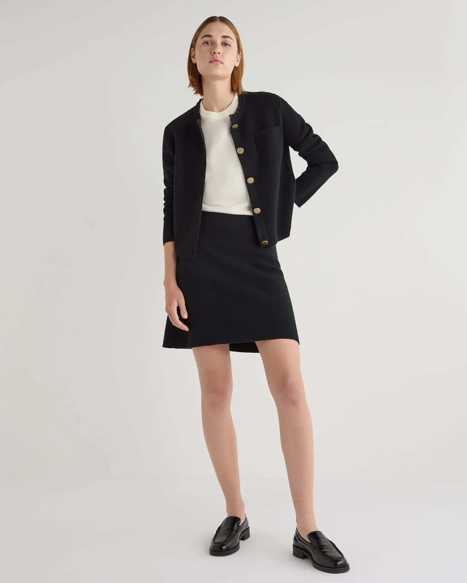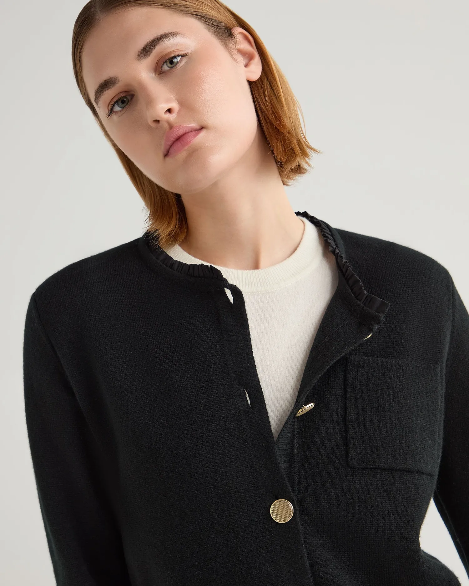 Made from the finest cashmere, our new ruffle collar jacket offers both style and comfort. Made from 100% organic Mongolian cashmere of the finest quality – Featuring a delicate 100% Cotton ruffle collar which sets it apart from the ordinary – Beautiful gold buttoned down front – Either could be worn over a dress for an evening out or paired with trousers with a chic daytime look – Luxuriously soft and comfortable, yet still so stylish – Perfect for layering in the cooler months – Featuring a convenient chest pocket – 1ply – Model is wearing size Small – Care: Hand Wash Organic cashmere: organic dyes and detergents, free from fertilizer and pesticides, find out more here