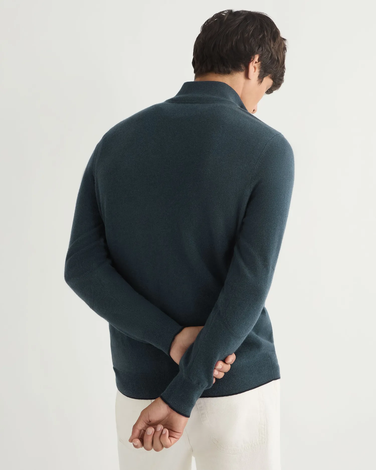 The Carnaby is shown here – a half zip cashmere sweater, beautiful in design and cut. 100% Mongolian Organic Cashmere- Elegant half zip- Alcantara piping- Smart leather toggle- Navy blue contrast trim- Perfect layering piece- Superb colour selection- 1ply- Model is wearing size Medium- Care: Dry Clean Only Organic cashmere: organic dyes and detergents, free from fertilizer and pesticides, find out heren