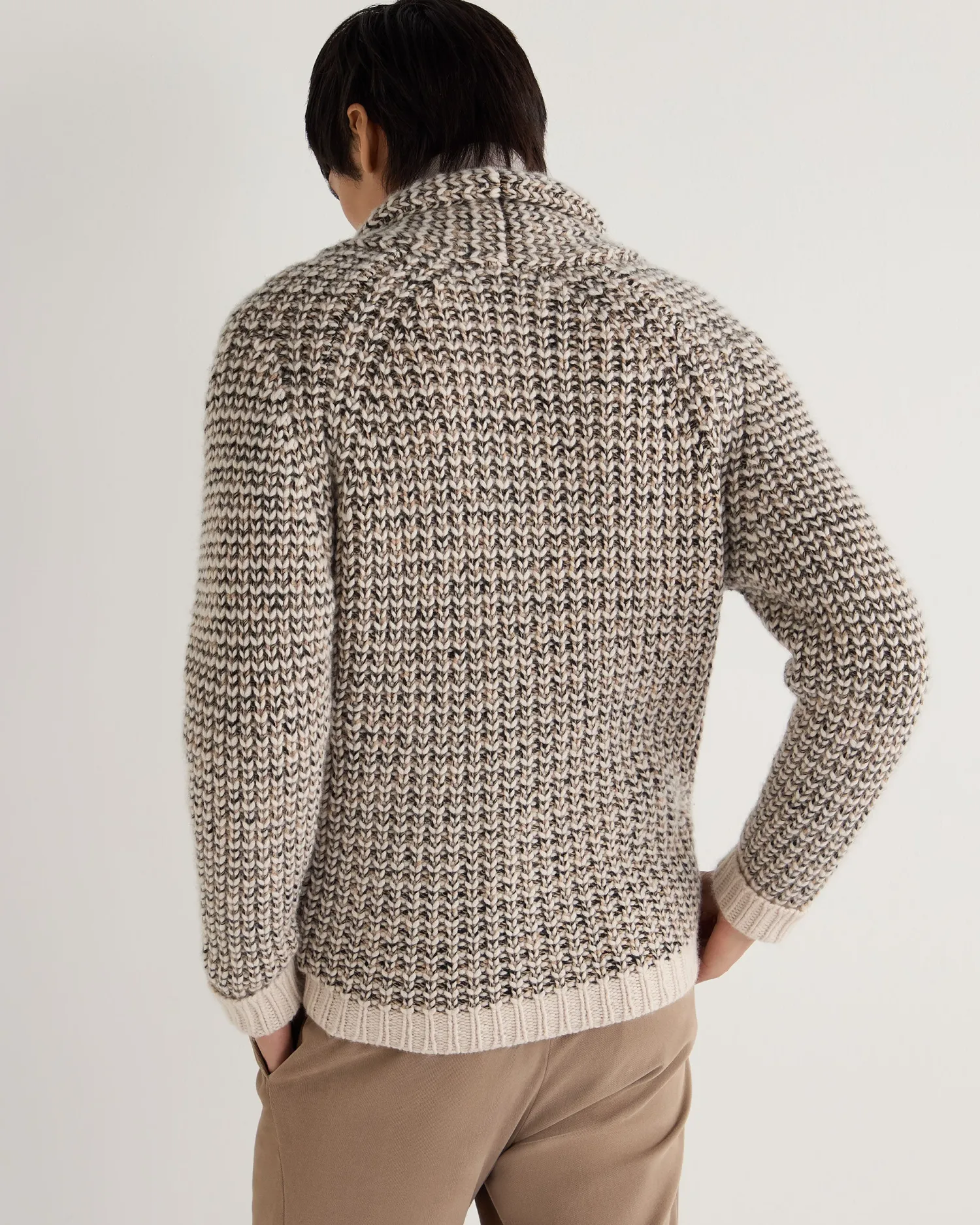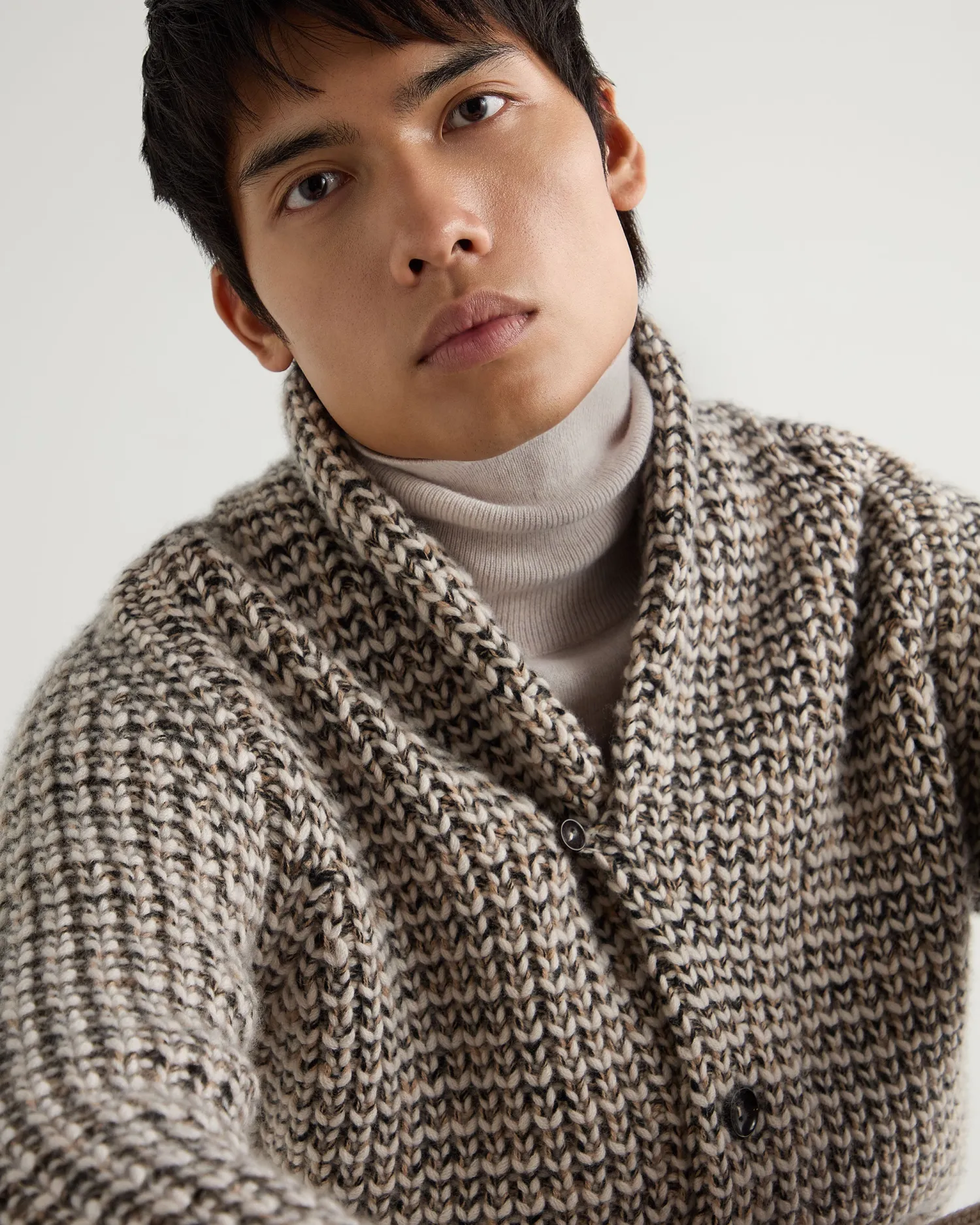 The new mens marl Kensington cardigan is a versatile piece which effortlessly transitions from casual to smart occasions. Made from 100% organic Mongolian cashmere – Unparalleled level of softness and warmth – Featuring ribbed cuffs and hem – Button down front – Ideal for layering over a crisp shirt for the office or a simple T-shirt for relaxed weekends – An essential addition to any wardrobe – The unique marl texture adds depth and character in a blend of ecru, black and camel- 10ply – Model is wearing size Small-Medium – Care: Hand Wash Organic cashmere: organic dyes and detergents, free from fertilizer and pesticides, find out more here