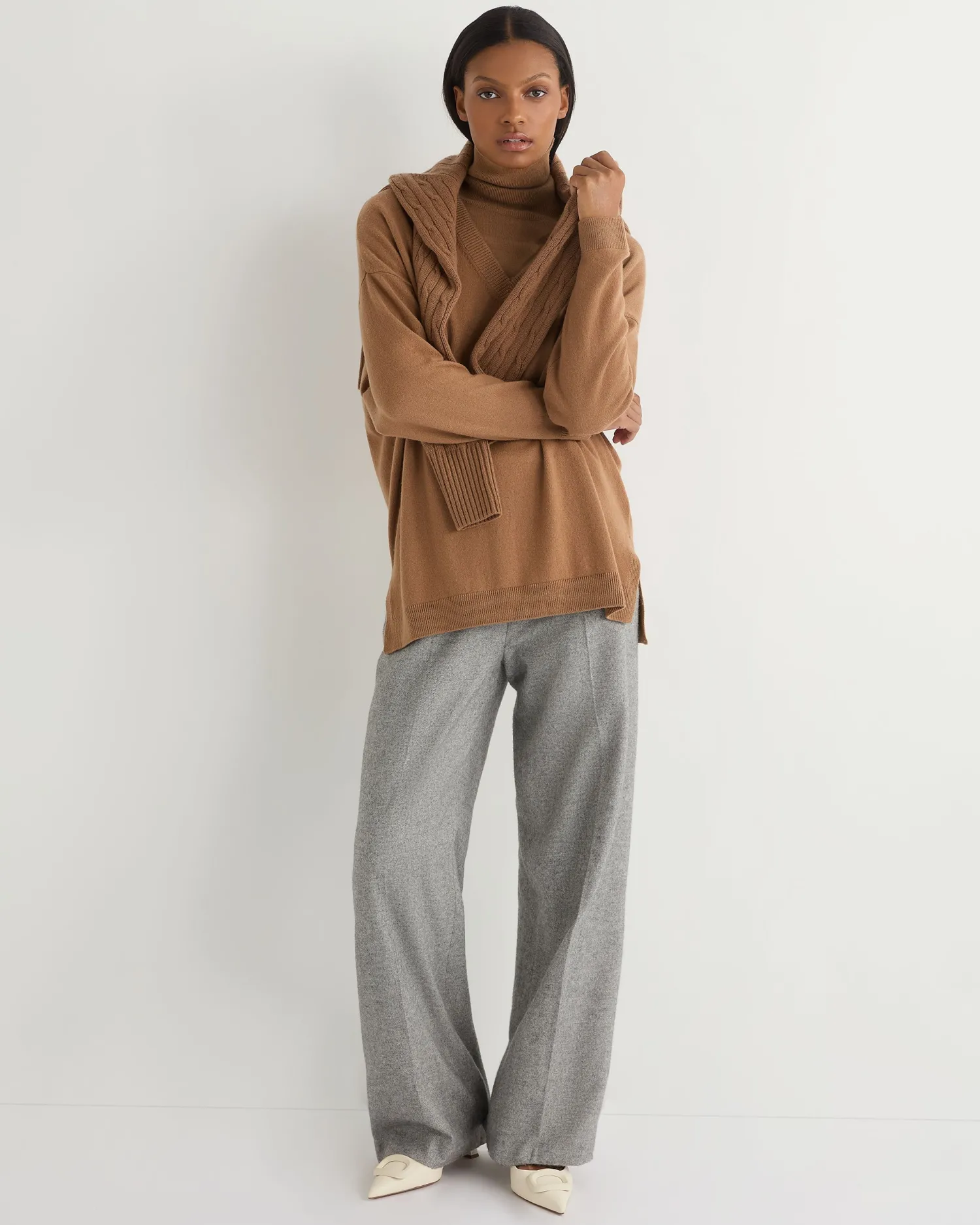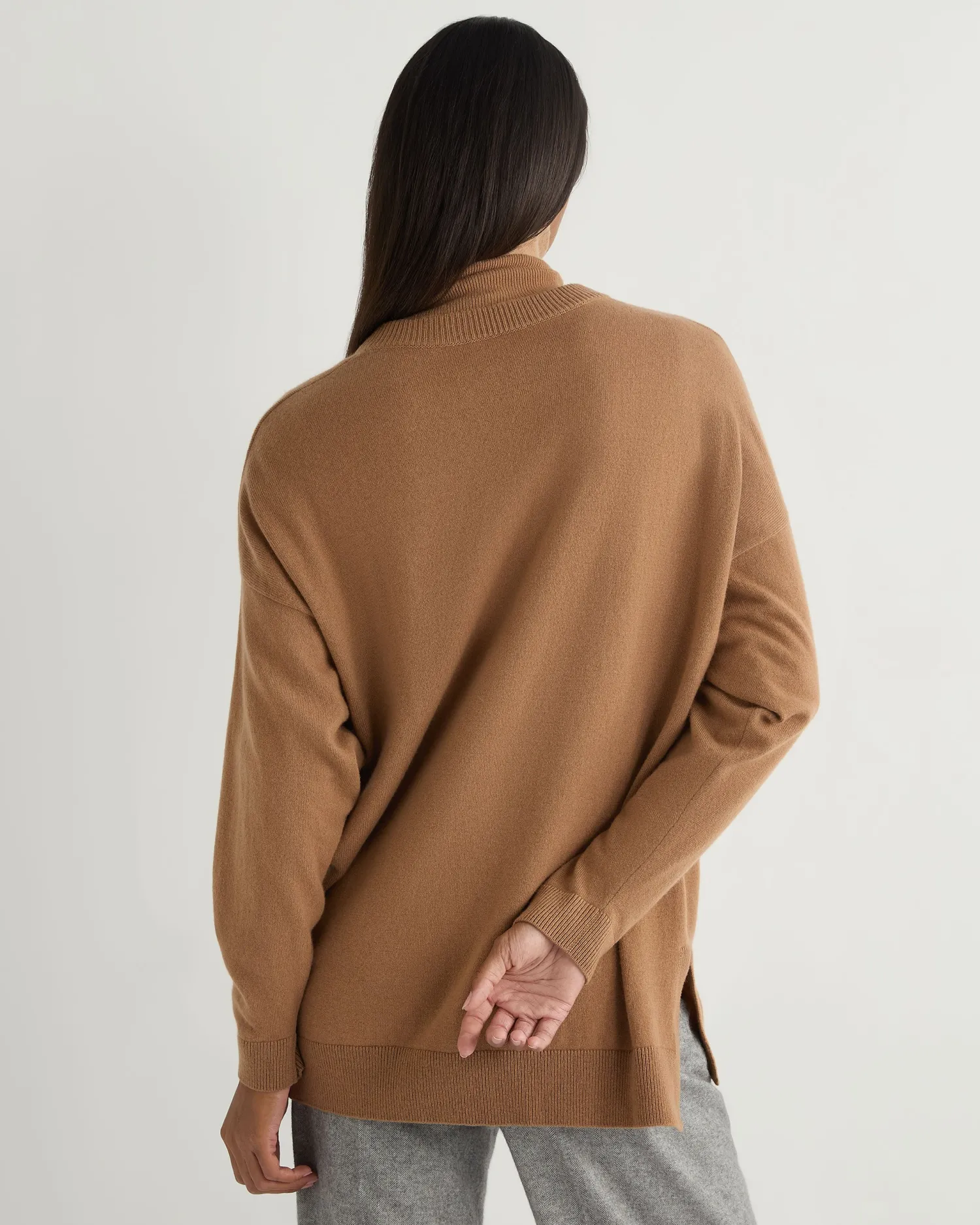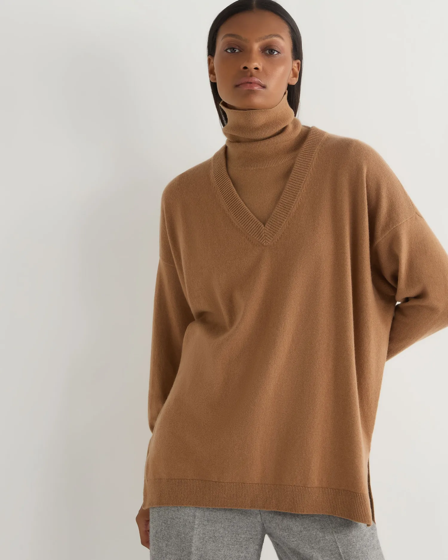 Introducing our new longline V- Neck sweater. The longline silhouette and flattering V- neck design create a sleek, elongated look, making it an ideal piece for layering or wearing on its own. Made from 100% Mongolian organic cashmere – Chic oversized fit – V-neck style, the ultimate layering piece – Looser fit, to gently skim the body – Matching rib design on the hem, cuff and v- neck – 2ply – Model is wearing size Small – Care: Hand Wash Organic cashmere: organic dyes and detergents, free from fertilizer and pesticides, find out more here