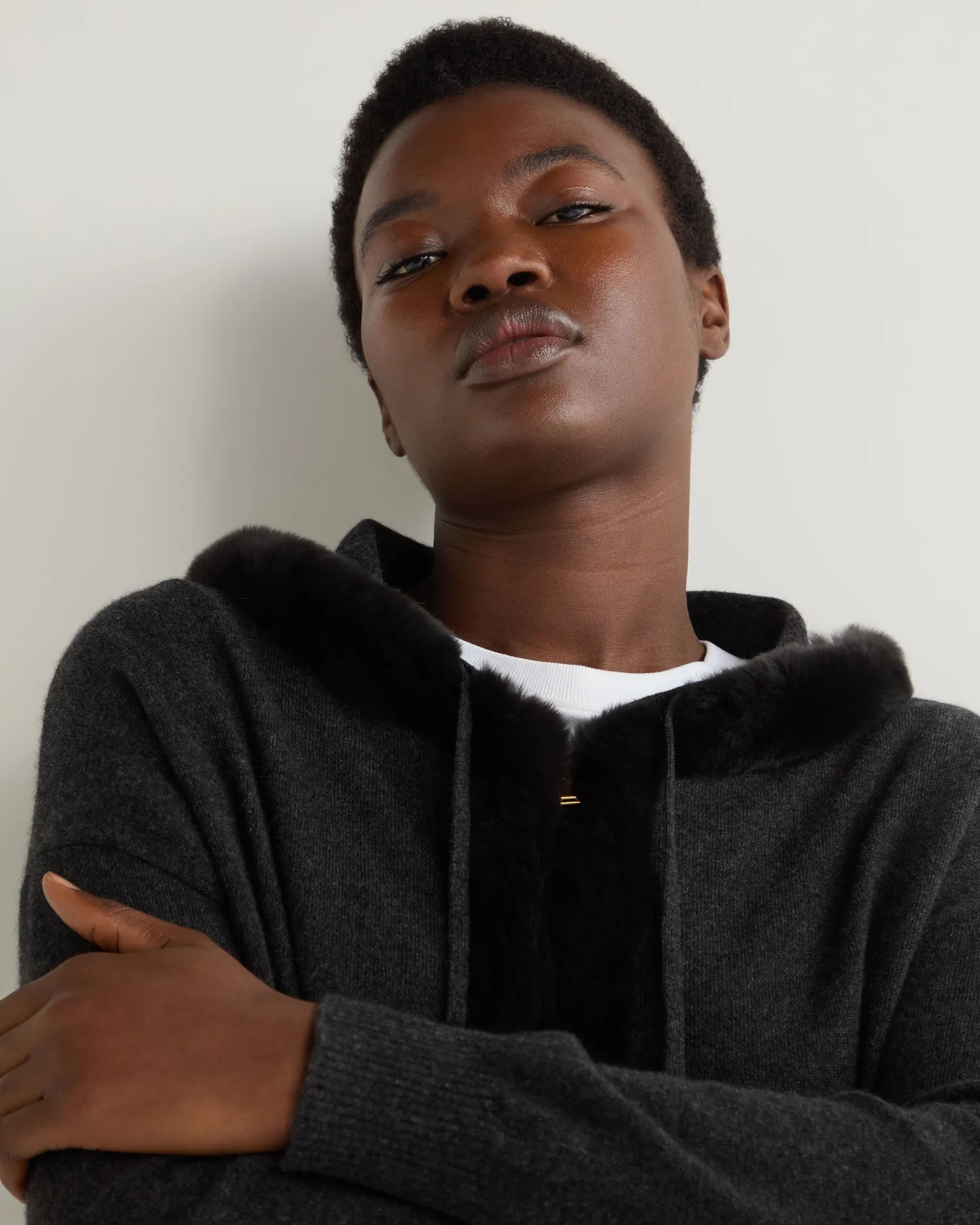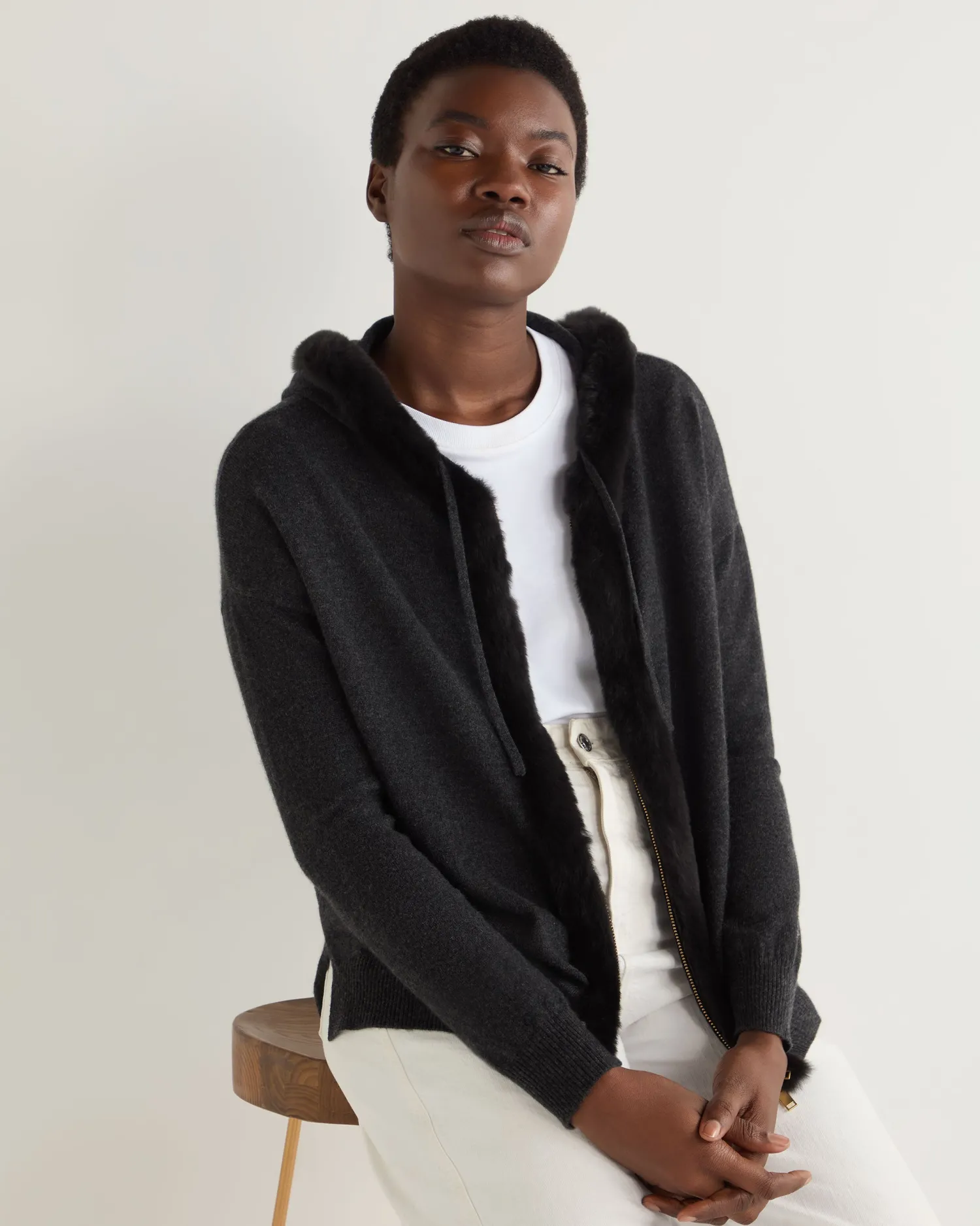 A generous new hoodie style with a Rex fur trim. Made from 100% Mongolian cashmere with a dark grey Rex fur trim – Lovely hooded style with a gentle drawstring – Full length two-way zip – Lighter loftier knit, weightless against the skin – Fabulously versatile and useful piece, great around the house, casually with jeans or after the gym – 1ply – Model is wearing size Small – Care: Dry Clean Only