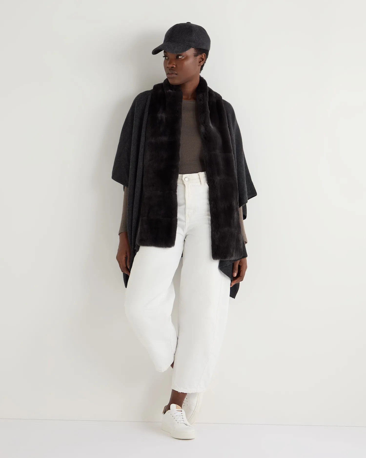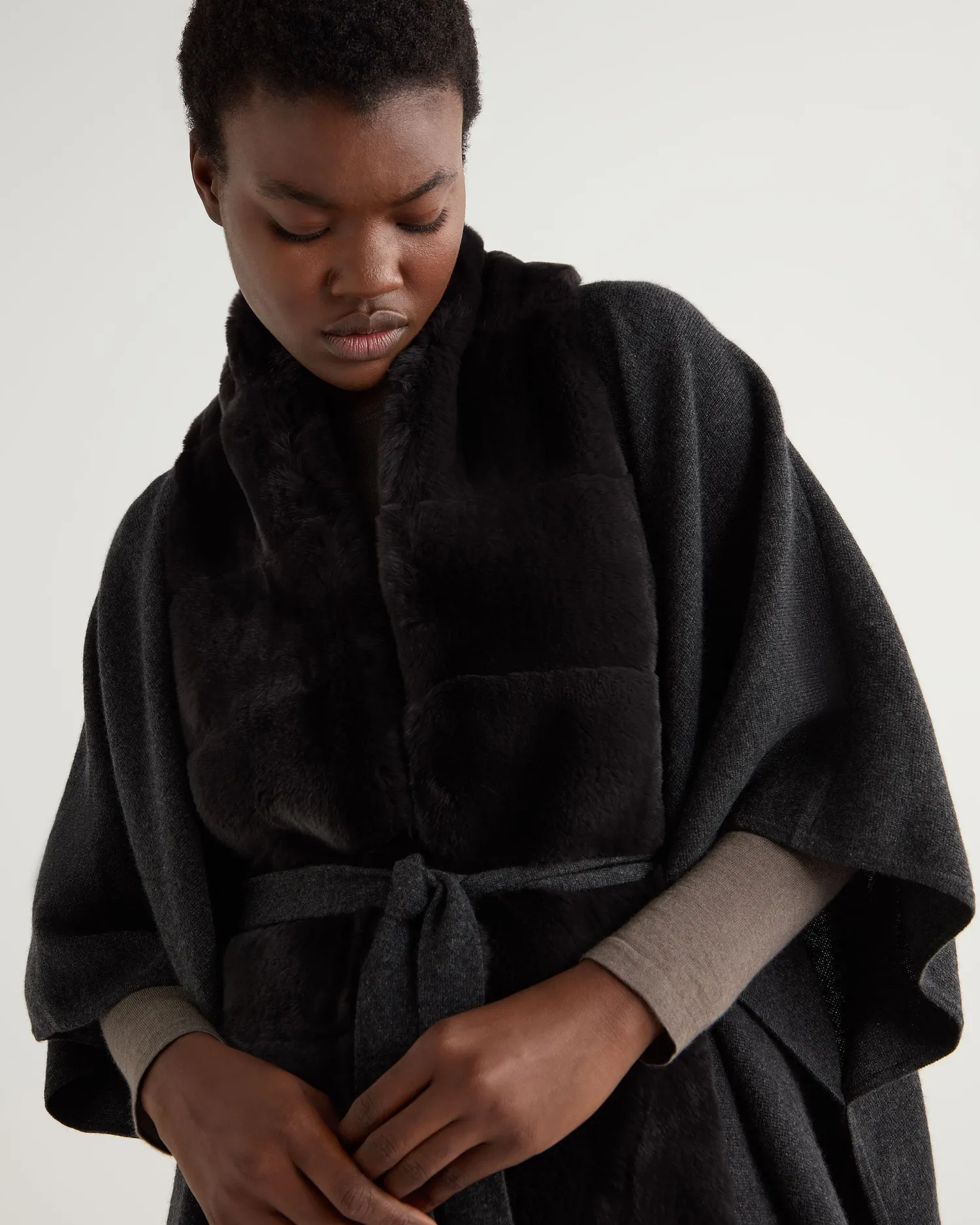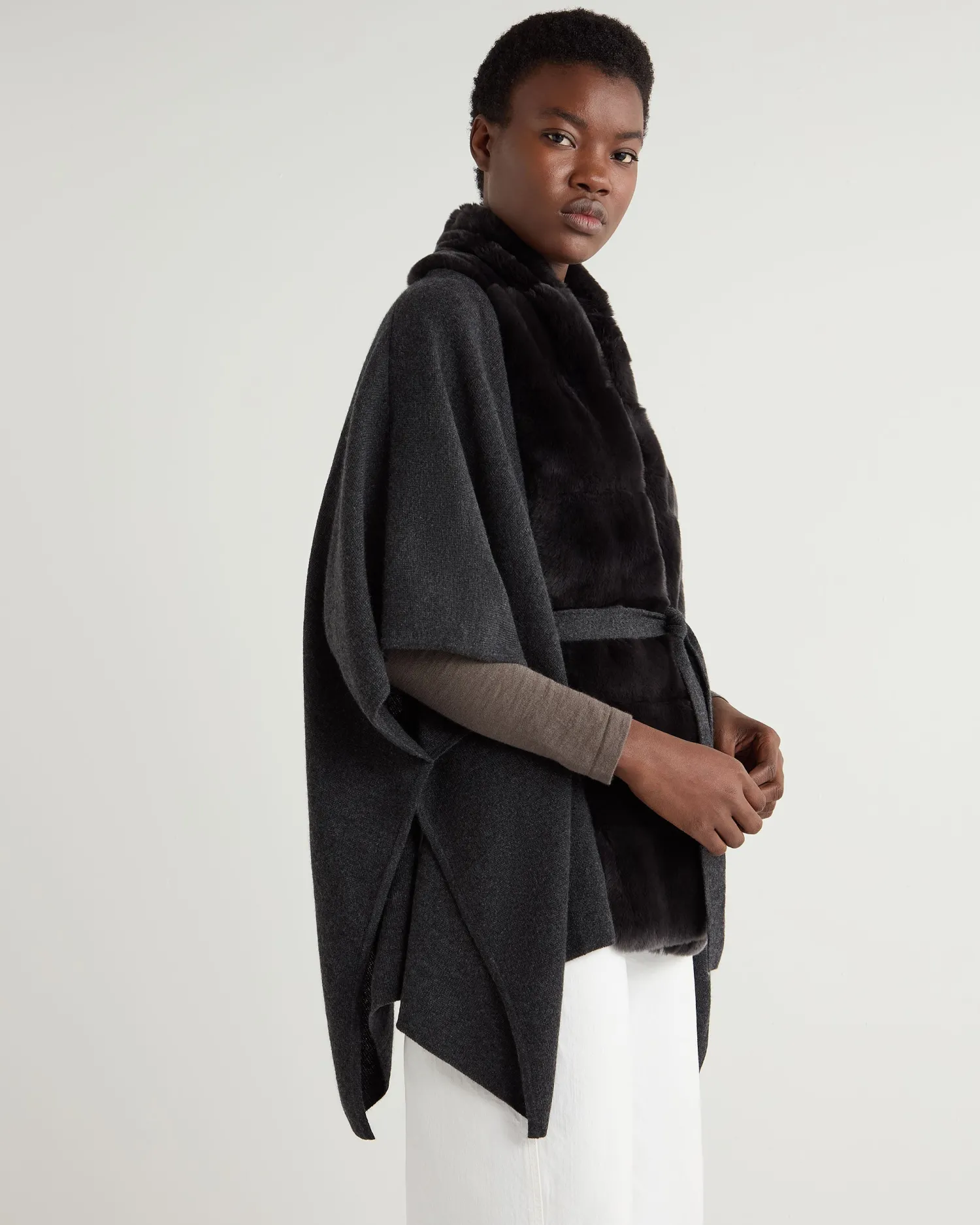 A generously sized and luxurious cape. Made from 100% Mongolian cashmere with a Rex fur trim – Extravagant cape style – Beautiful dark grey Rex placket trim – Matching knitted belt with slits to feed it through – Fabulous worn over a smart dress – Equally at home with jeans and boots – Perfect for those colder days – Perfect layering piece – 1ply – Care: Dry Clean Only