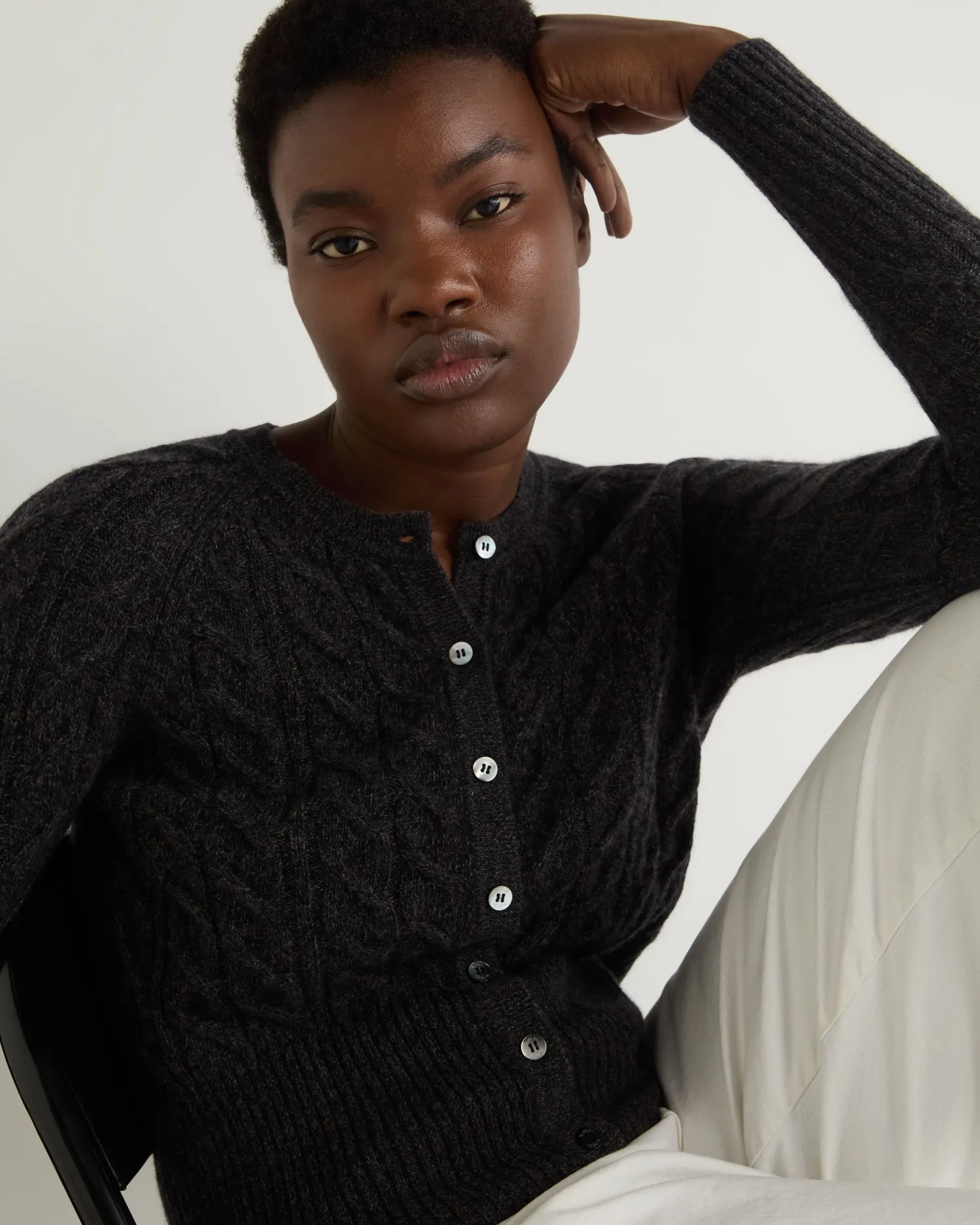A wonderfully simple and stylish cable cashmere cardigan. n Crafted from 100% Mongolian cashmere Popular cropped cardigan style Modern cable texture Mother of pearl buttons Deep ribbed hem and matching cuffs 2ply Model is wearing size Small Care: Hand Wash