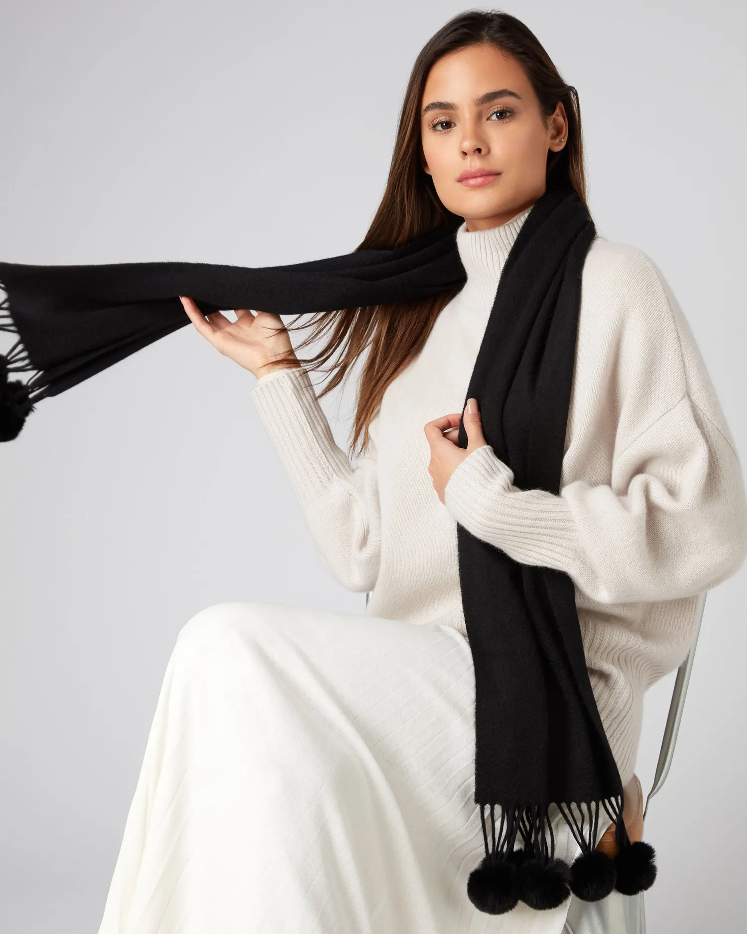 Our fabulous fur bobble woven scarf, a great favourite with many. Made from 100% Mongolian Cashmere – Black Rex fur bobbles on tassels at both ends – Measures 150x30cm plus the tassel/bobble – Beautiful high quality product – Can be worn casually with jeans – Equally great with a smarter outfit – Would make a wonderfully generous gift- Care: Dry Clean Only