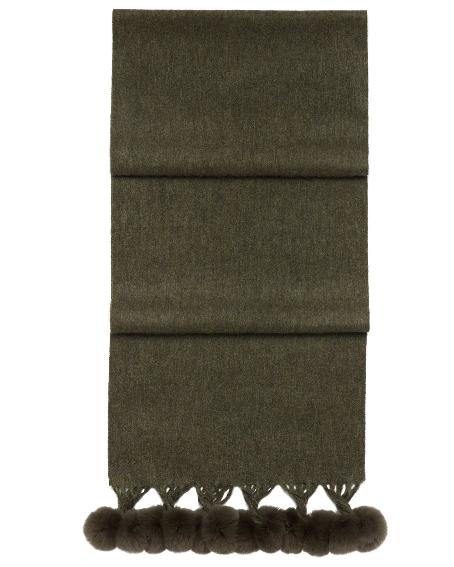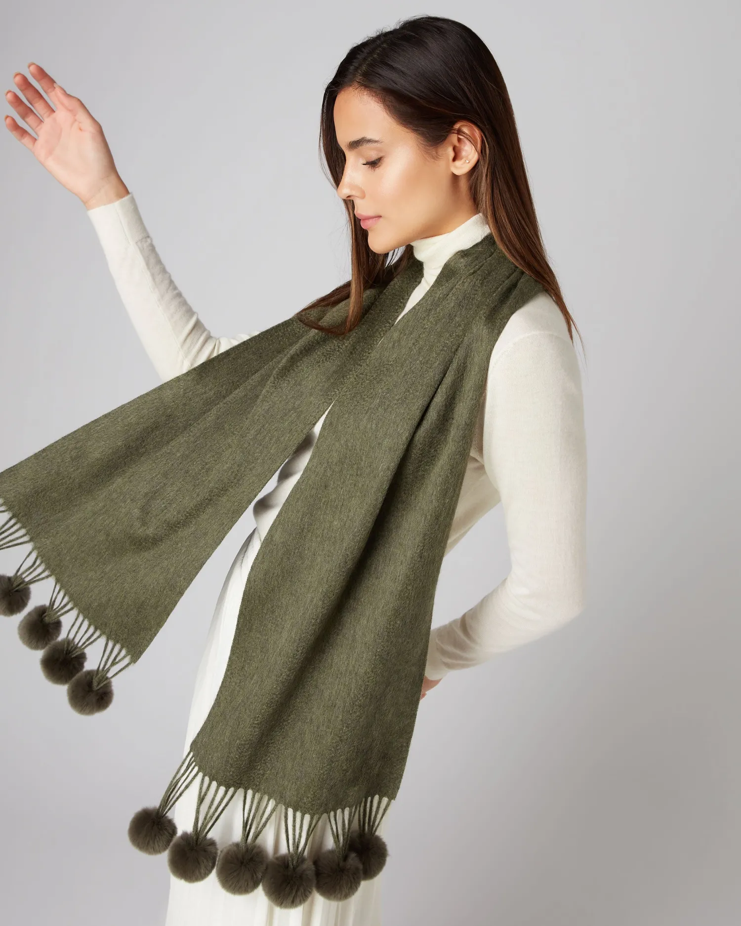 Our fabulous fur bobble woven scarf, a great favourite with many. Made from 100% Mongolian Cashmere – Dark olive green Rex fur bobbles on tassels at both ends – Measures 150x30cm plus the tassel/bobble – Beautiful high quality product – Can be worn casually with jeans – Equally great with a smarter outfit – Would make a wonderfully generous gift- Care: Dry Clean Only