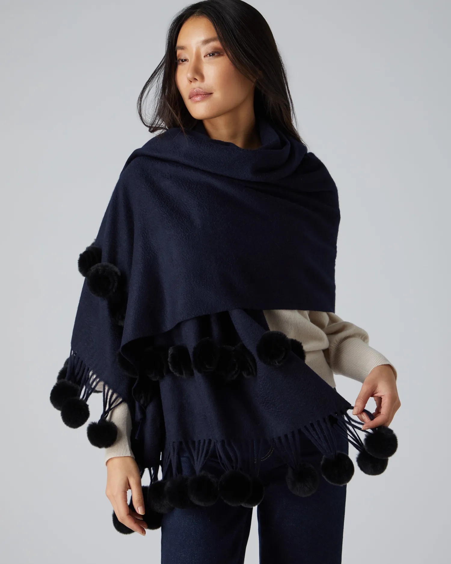 Envelop yourself in luxury – here we see the fur bobble woven shawl. 100% Mongolian Cashmere with Rex Fur trim – N.Peal classic woven shawl – Embellished with navy blue Rex fur bobbles – Makes an amazing gift- Care: Dry Clean OnlynFind our full range of Women’s Cashmere Scarves here.