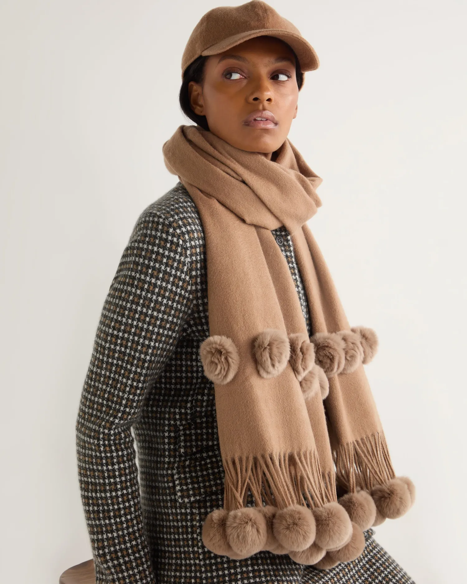 Envelop yourself in luxury – here we see the fur bobble woven shawl. 100% Mongolian cashmere with Rex fur trim – N.Peal …