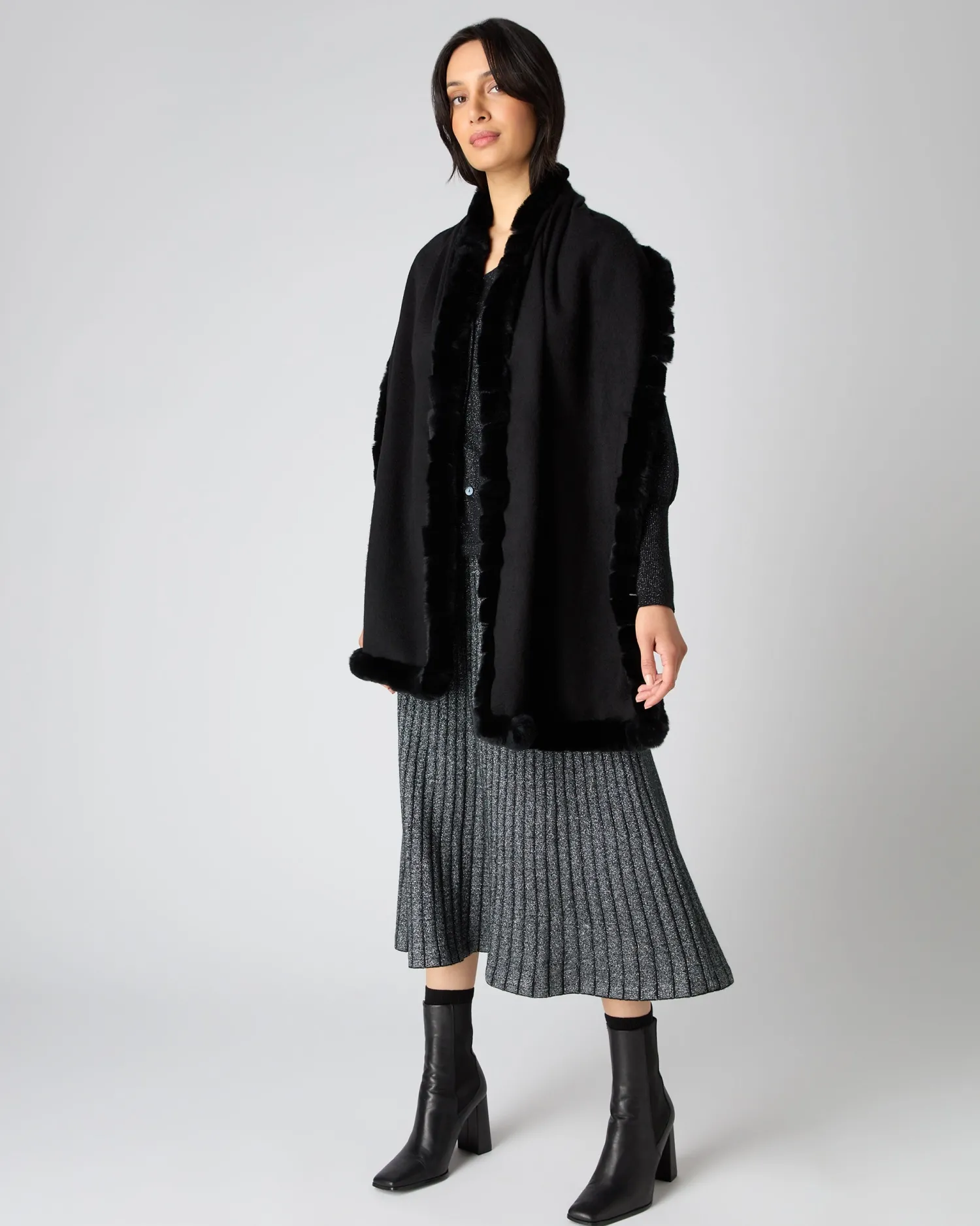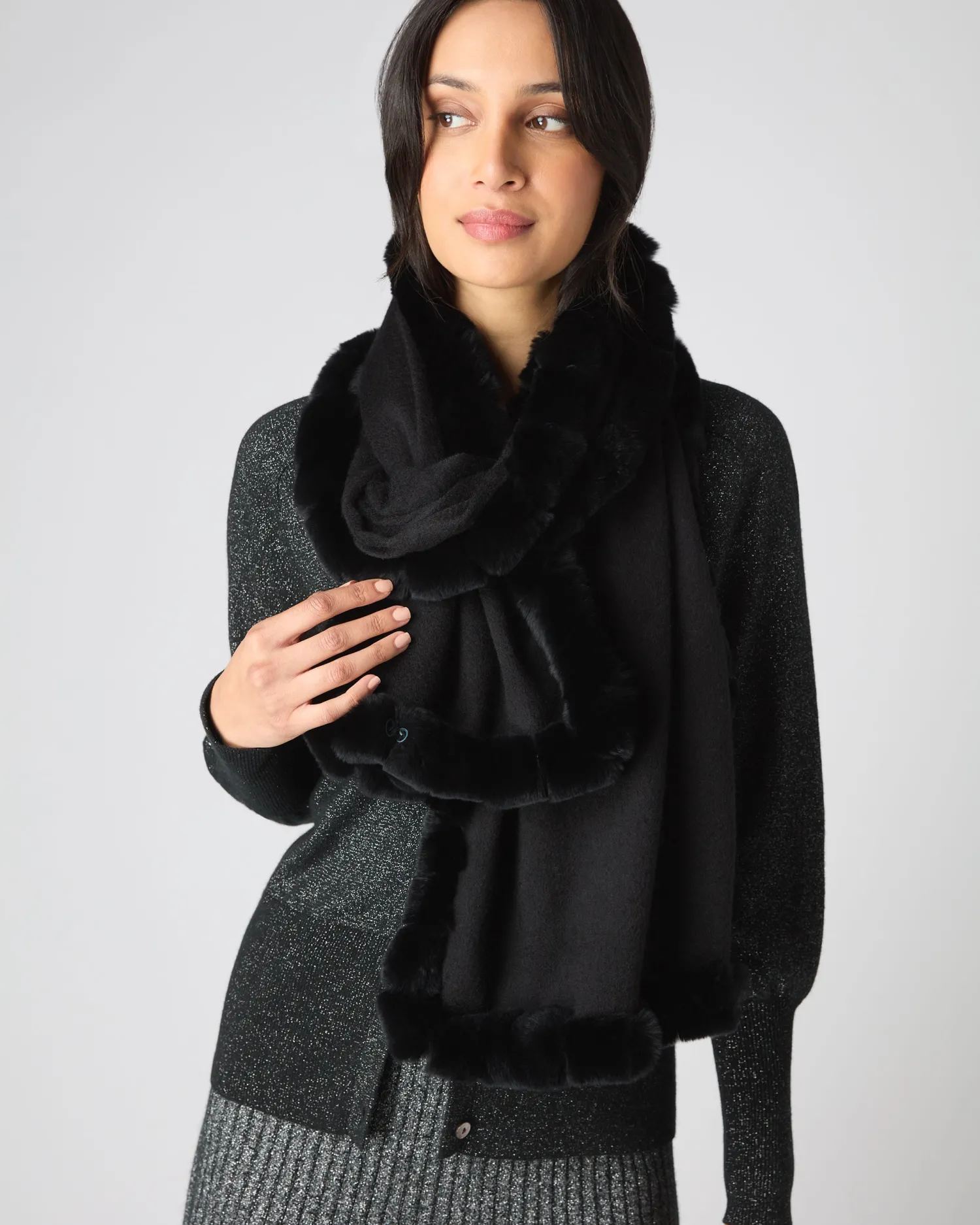 Luxury is personified here in our woven cashmere scarf with Rex fur trim to all sides. 100% Mongolian Cashmere body with wrap around black Rex Fur – Measures 180×37.5cm – Fabulous worn casually with jeans – Great worn with a smarter outfit – Beautiful versatile N.Peal style – Would make a wonderful gift- Care: Dry Clean Only