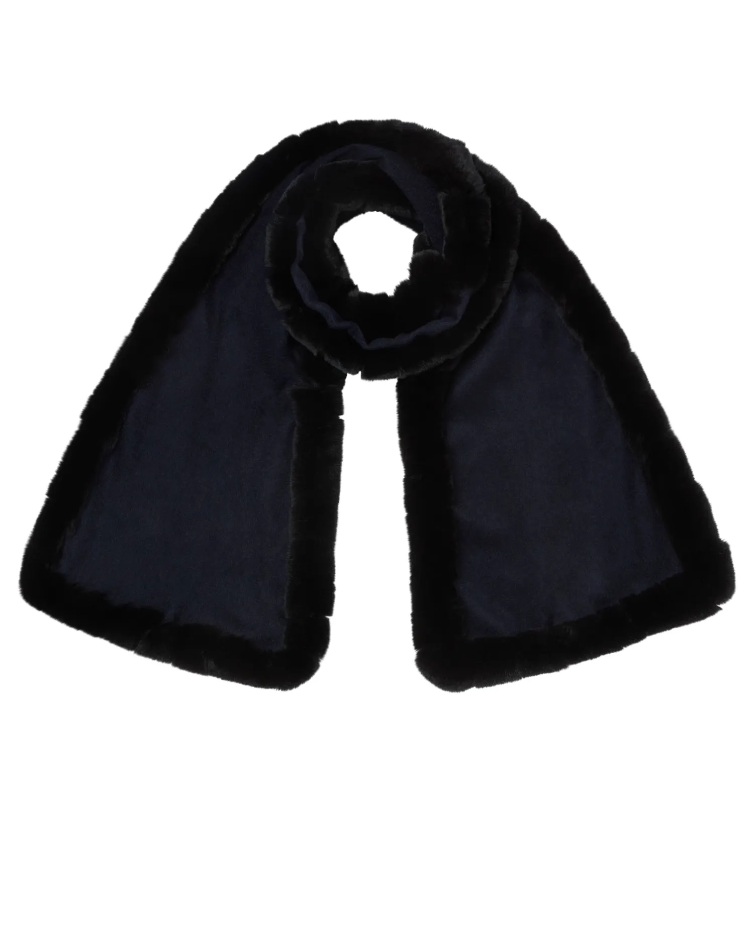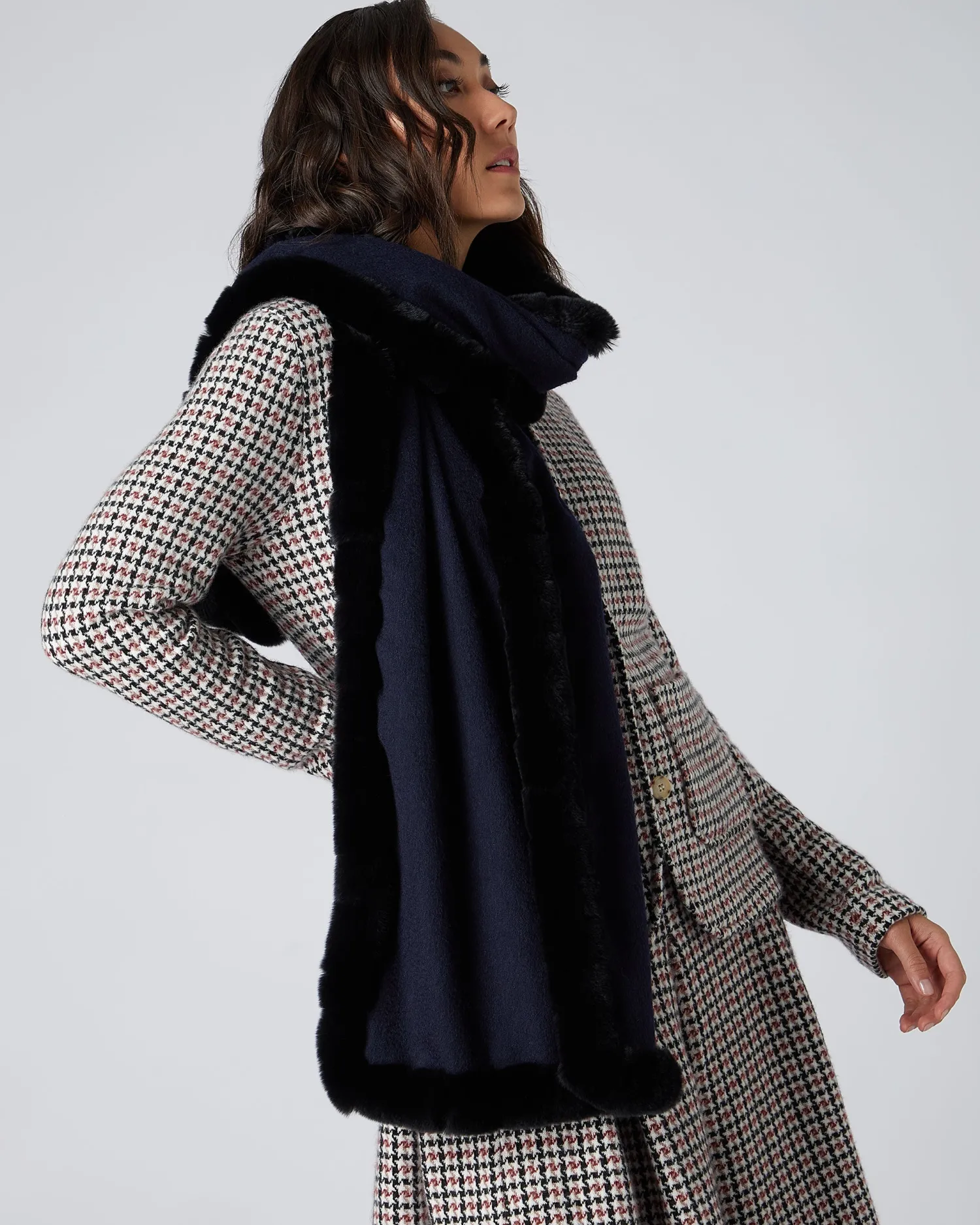 Luxury is personified here in our woven cashmere scarf with Rex fur trim to all sides. 100% Mongolian Cashmere body with wrap around navy blue Rex fur – Measures 180×37.5cm – Fabulous worn casually with jeans – Great worn with a smarter outfit – Beautiful versatile N.Peal style – Would make a wonderful gift- Care: Dry Clean Only