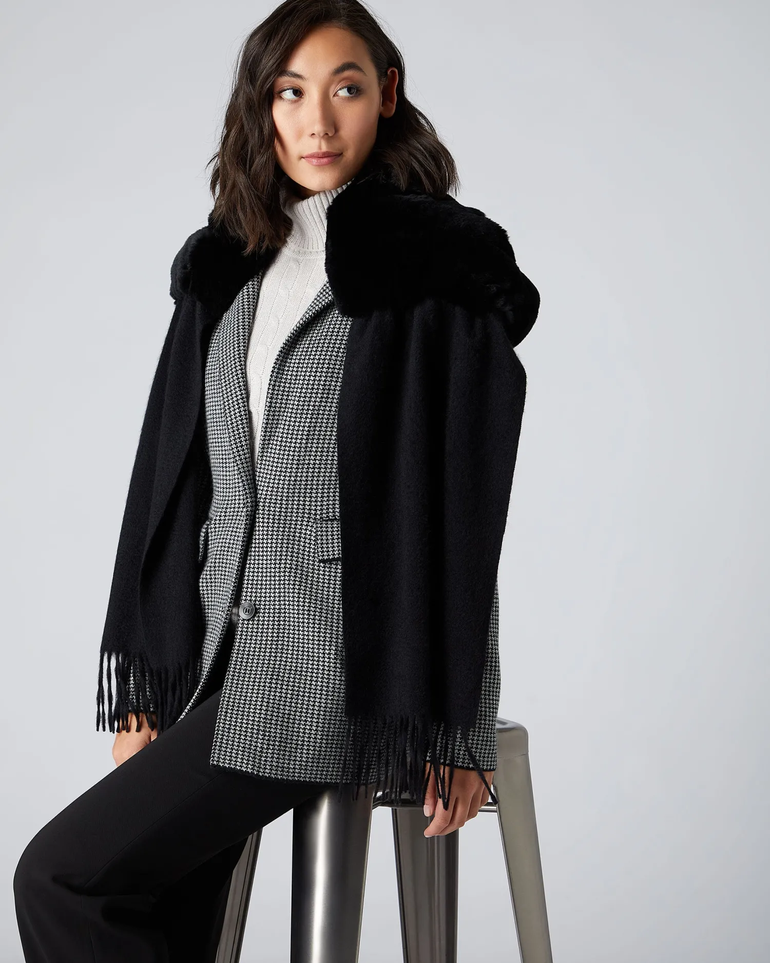 A super soft and deep pile Rex rabbit fur scarf. 100% Mongolian Cashmere with black Rex Fur trim – Woven scarf – Deep pile fur attached by hand – Fur ‘ripple’ look via small incisions – Popular style in great colourways- Care: Dry Clean Only