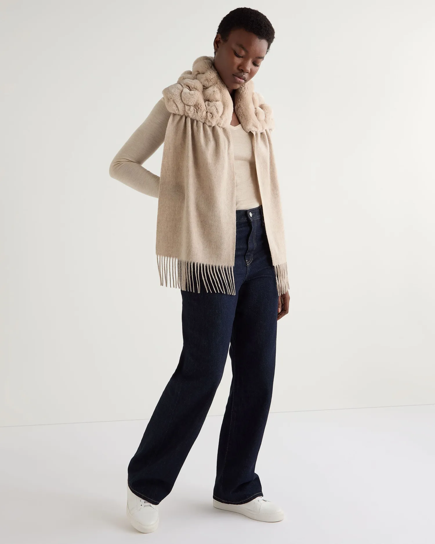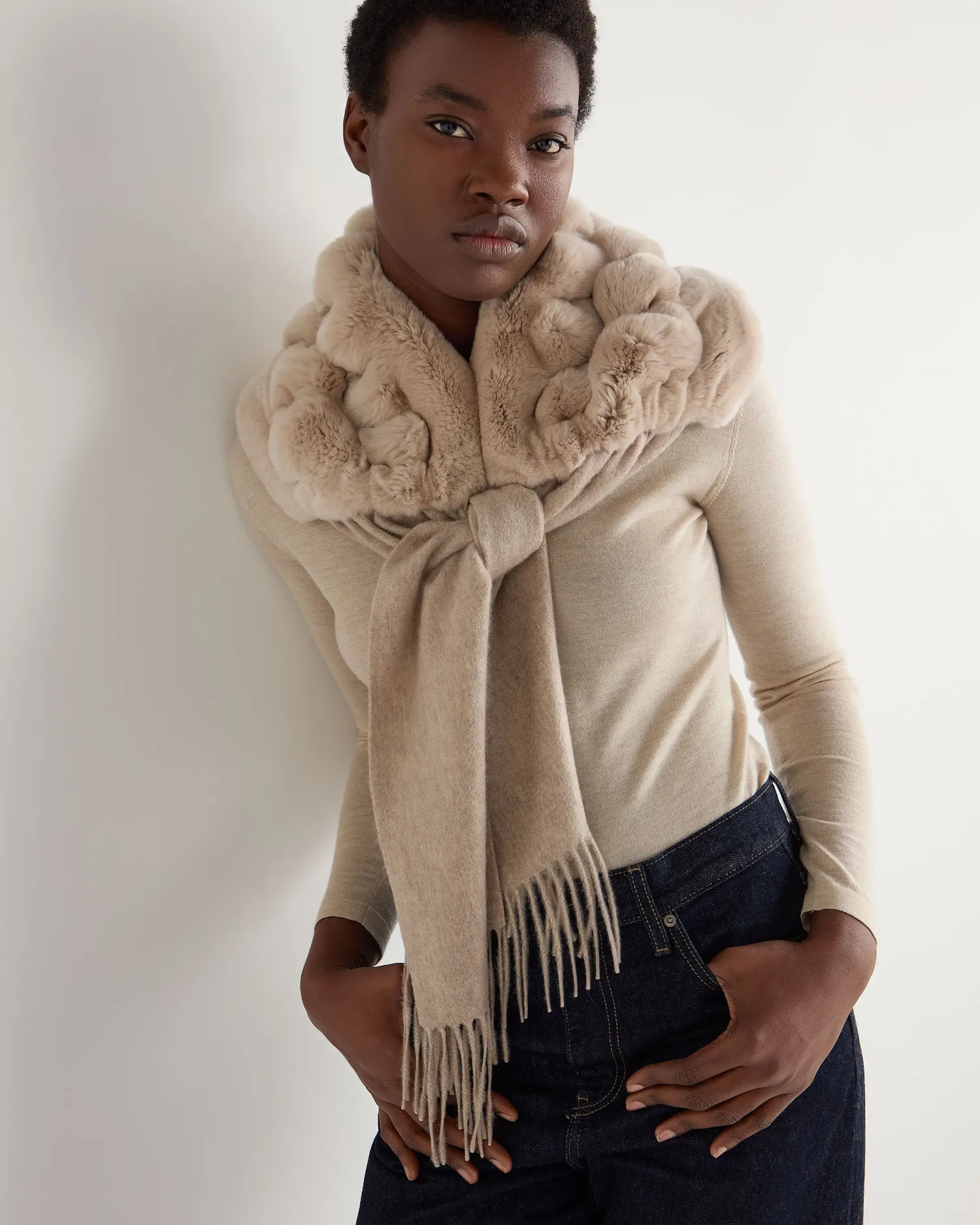 A super soft and deep pile Rex rabbit fur scarf. 100% Mongolian cashmere with sand brown Rex fur trim – Woven scarf – Deep pile fur attached by hand – Fur ‘ripple’ look via small incisions – Popular style in great colourways – Care: Dry Clean Only
