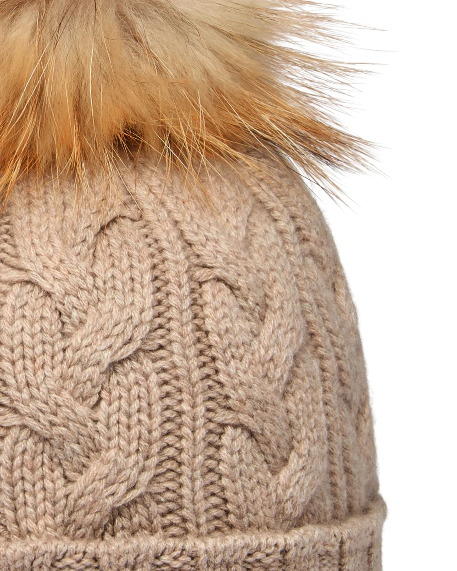 Here we see the chunky cable raccoon pom hat, a popular design. n Made from 100% Mongolian cashmere Delightful cable knit with ribbed hem Detachable raccoon pom (to enable gentle wash and to allow you to swap pom colours) Warm, comfortable and on trend Would make a fabulous gift Matching gloves and scarf available 1ply Care: Dry Clean Only
