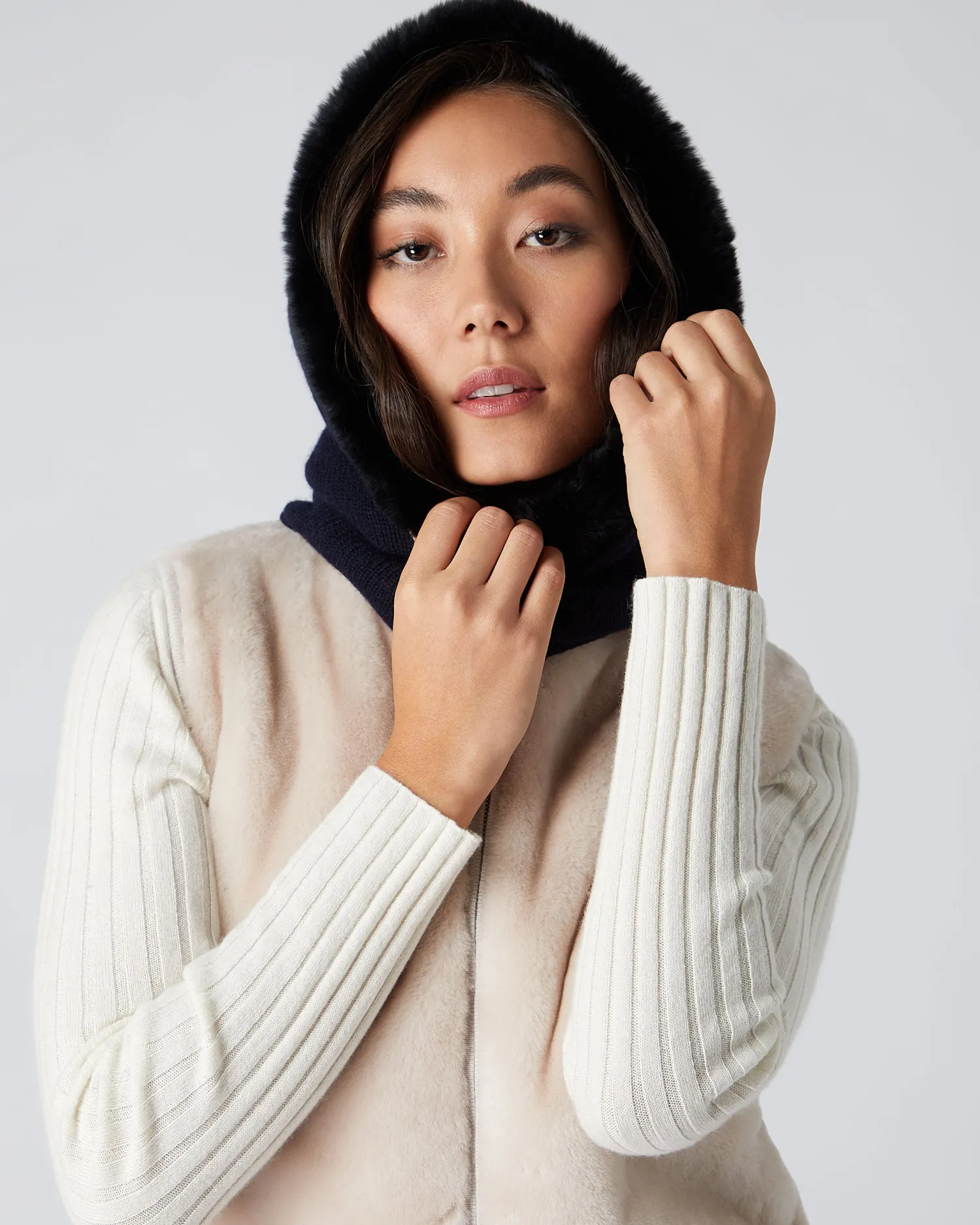 A wonderful and super soft ski hood, suitable for all outdoor occasions. Made from 100% Mongolian Cashmere with navy blue Rex fur trim – Hood style to wear with any outfit – Would make an interesting gift- 2Ply- Care: Dry Clean Only