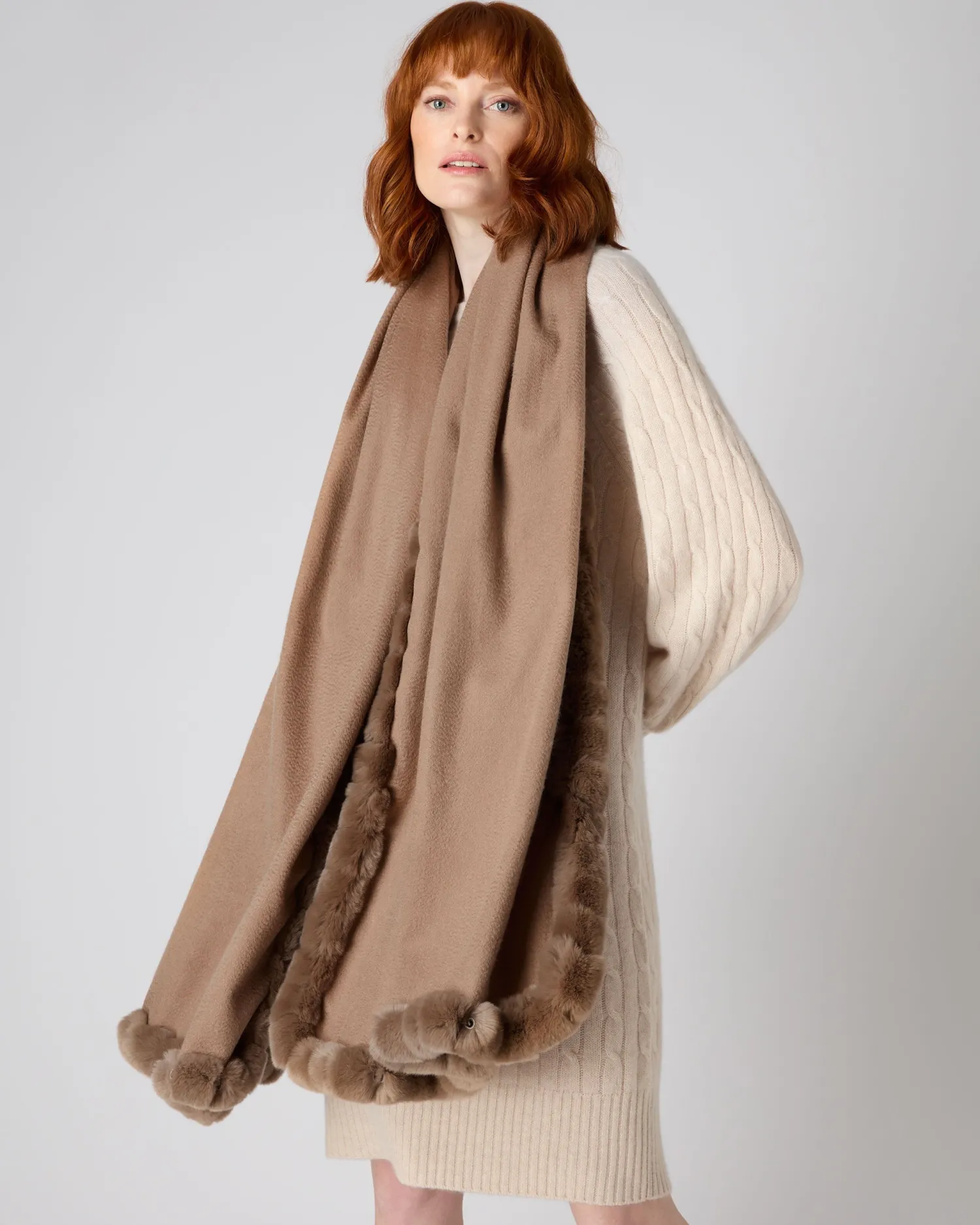 Wrap yourself in the sheer luxury of a trim woven shawl. Made from 100% Mongolian Cashmere with Rex fur trim – Generously sized at 200x75cm – Dark tan Fur trim around all edges – Can be worn casually with jeans or dressed up – Would make a fabulous gift – Care: Dry Clean Only