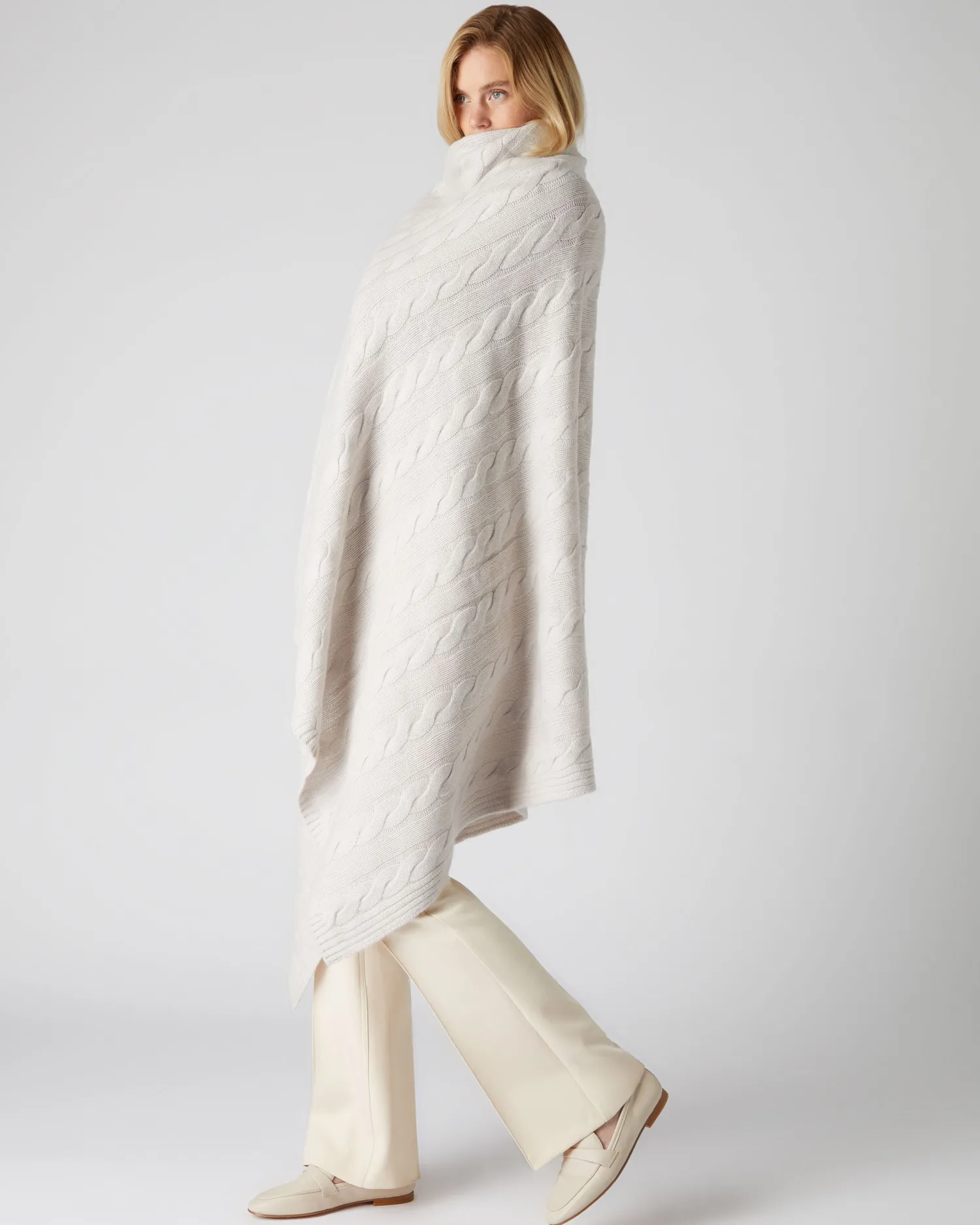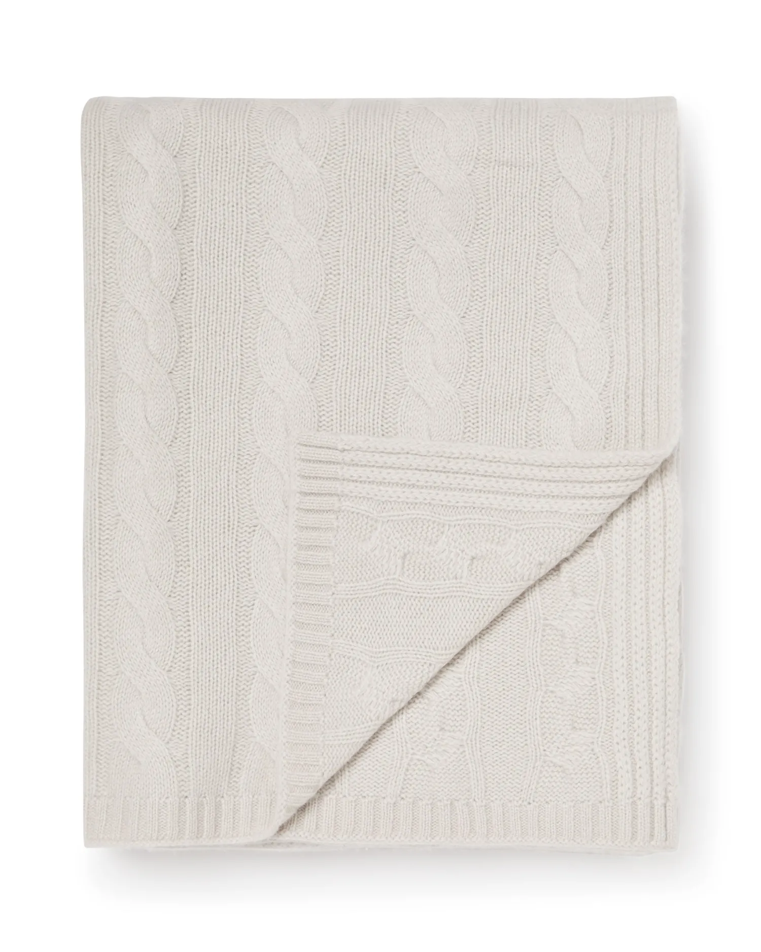 The wow factor for your bed or sofa – a cable cashmere throw. n Made from 100% Mongolian Cashmere Beautiful cable pattern knit Perfect over a sofa or across a bed Measures 177x122cm – Care: Hand Wash