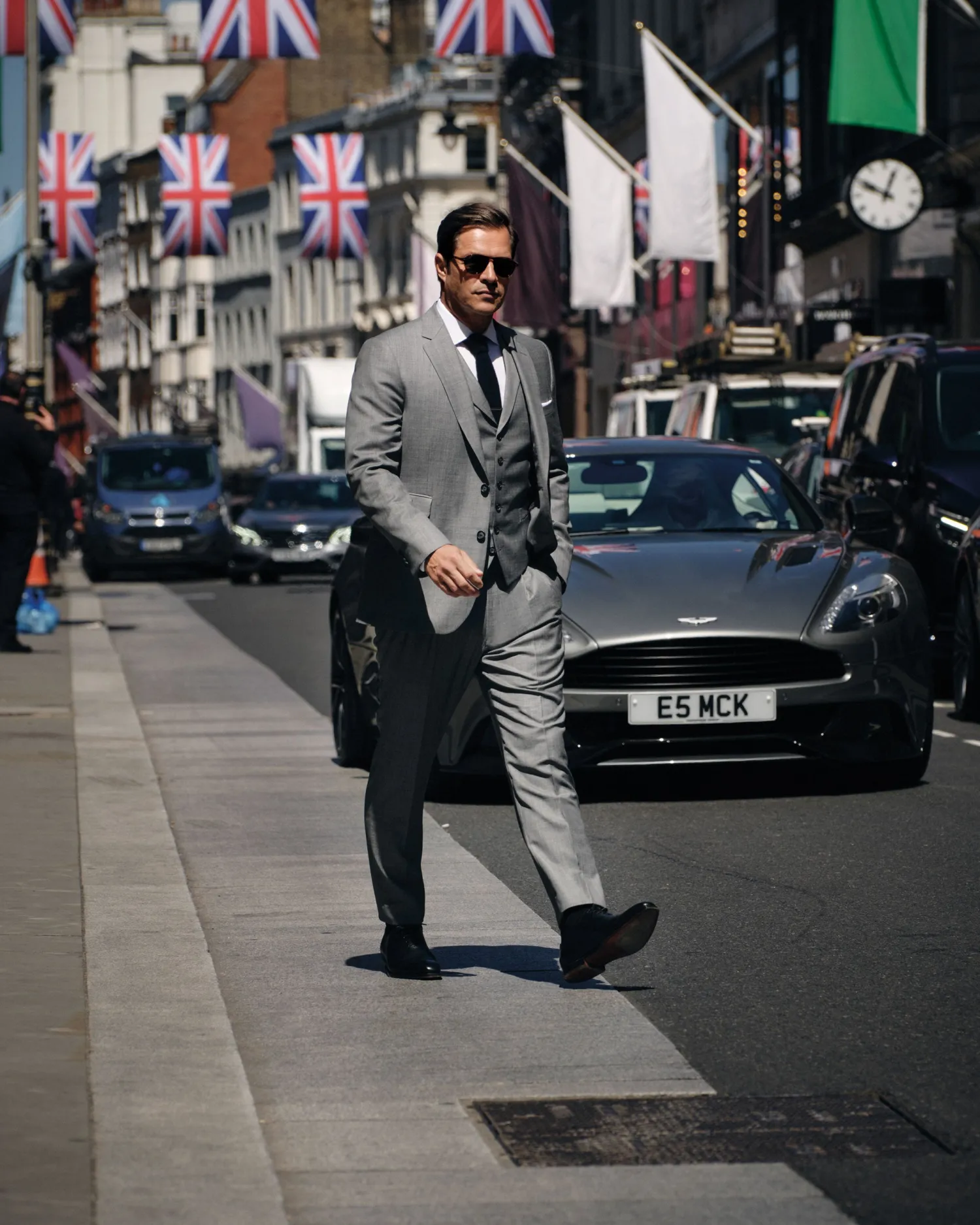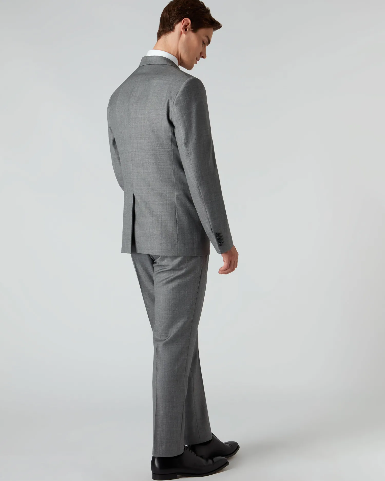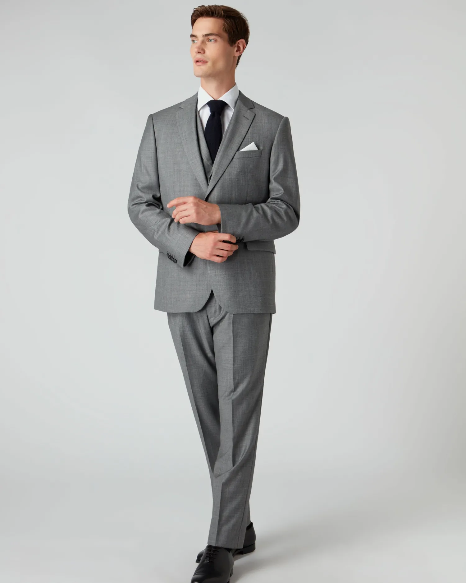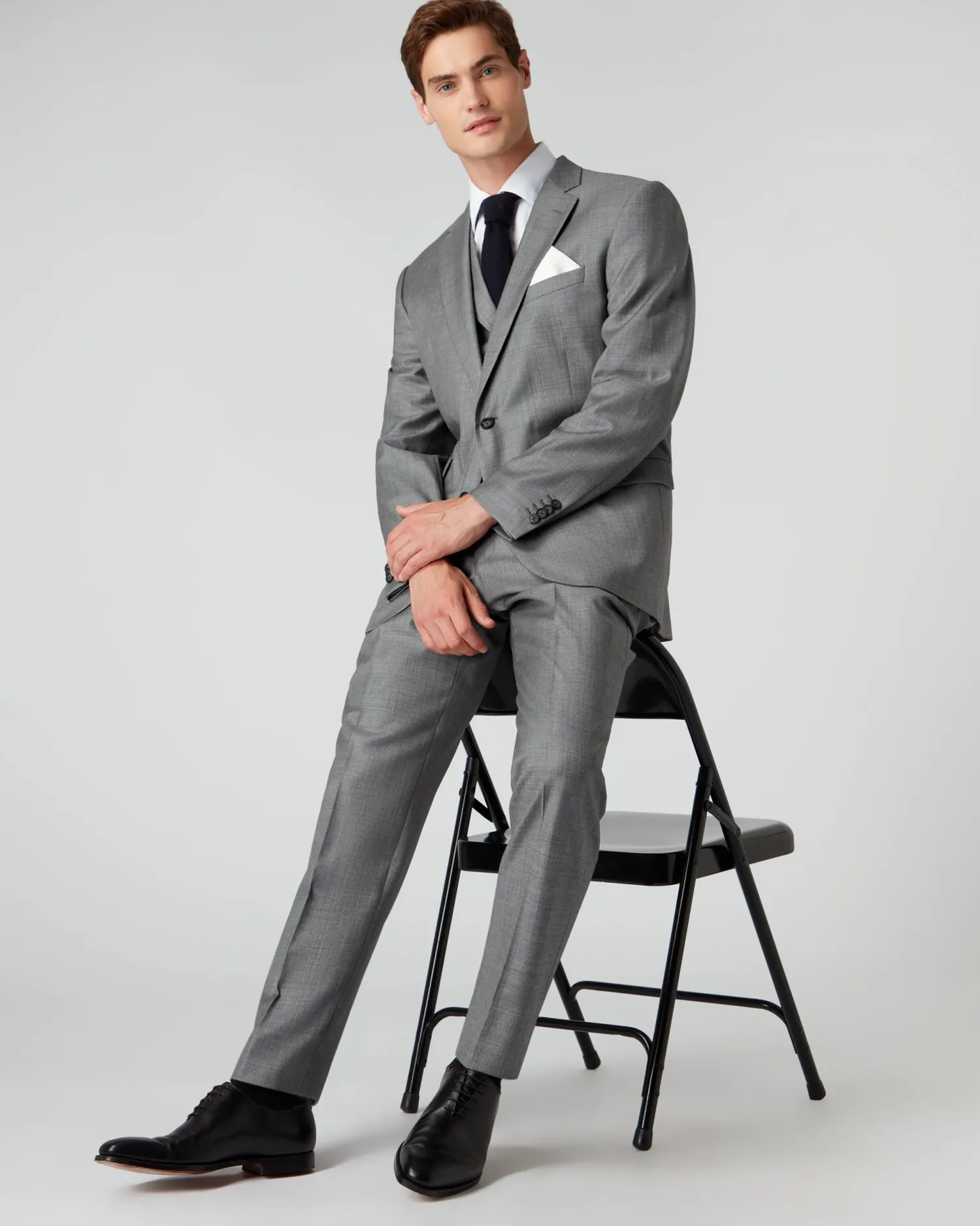 A first for N.Peal, but an obvious choice as worn so elegantly by Bond in GOLDFINGER (1964).- Made from 100% Wool, woven expertly for a fine finish – Exquisite detailing to reflect the original worn in the movie- Available only as a full 3 piece suit – jacket, trouser and waistcoat- Jacket: single breasted, relaxed fit, grey viscose satin lining, two button fastening, notch neck lapel, central back vent, interior pockets, front flap and ticket pockets, four buttons on each sleeve- Trouser: slim leg, double pleated front, slanted side pockets, back jetted pockets, regular rise, zip fly, belt loops, unfinished leg length so they can be altered, waistband suitable for alteration- Waistcoat: single breasted, six button fastening, grey viscose satin lining, notch neck lapel, welt pockets, standard back strap with buckle adjuster- This style will be delivered in a suit carrier instead of our bespoke Bond packaging, this is to ensure the product arrives with you in the best possible condition- Model is wearing size 42 suit (size 42 jacket and waistcoat, size 36 trouser)- Care: Dry Clean OnlynInspired by the scene in GOLDFINGER (1964) where after narrowly avoiding death by high powered laser at the hands of GOLDFINGER, a drugged Bond wakes to find himself on GOLDFINGER’S private jet where he meets the pilot, Pussy Galore.n007 and related James Bond Indicia © 1962-2024 Danjaq and MGM. 007 and related James Bond Trademarks are trademarks of Danjaq. All Rights Reserved.