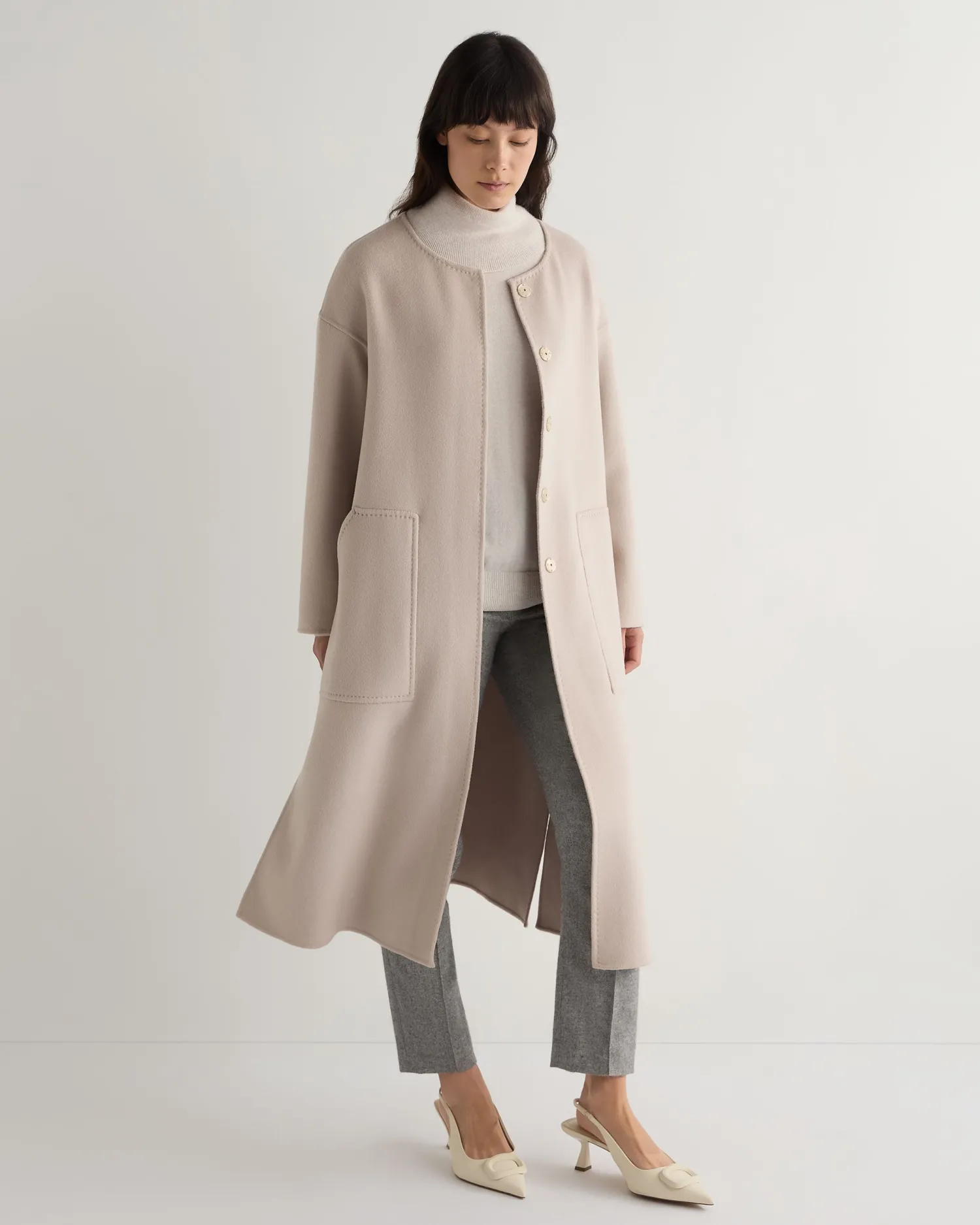 Our new round neck woven coat is a masterpiece of timeless elegance and contemporary design. Made from 70% wool, 20% silk and 10% Mongolian cashmere – The most perfect coat for colder weather – The longline silhouette provides a flattering fit – Perfect for both casual and formal occasions – Ideal for layering over a sweater in cold weather – Model is wearing size Small – Care: Dry Clean Onlyn