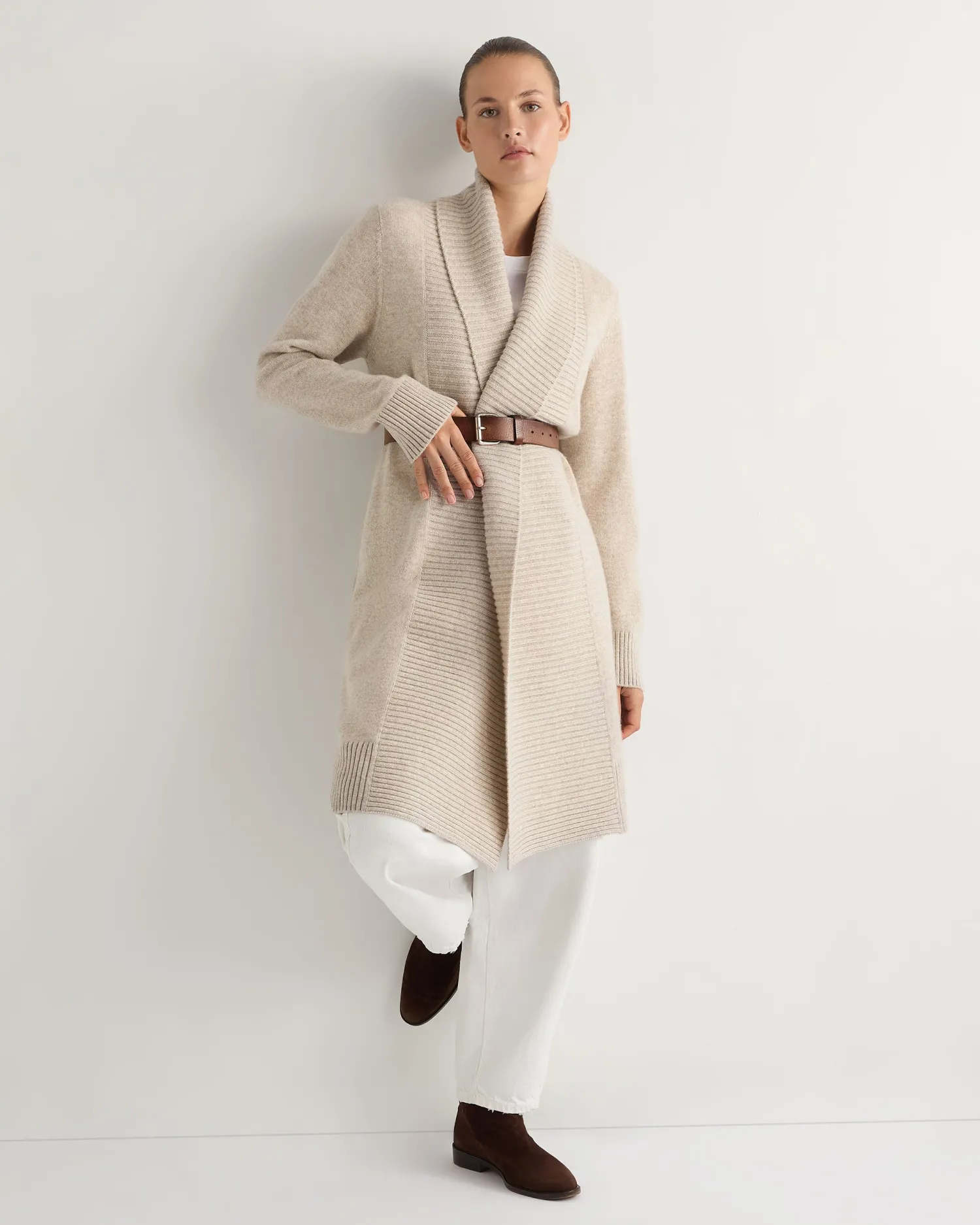 A new longer line cardigan with strong detailing, perfect for layering. Made from 100% organic Mongolian cashmere of the highest quality – Shawl collar style, comfort and warmth guaranteed! – Smart wide rib detailing on the edge to edge plackets with matching hem and cuffs – Great worn loose or can be belted for a modern twist – 3ply – Model is wearing size Small – Care: Hand Wash Organic cashmere: organic dyes and detergents, free from fertilizer and pesticides, find out more here