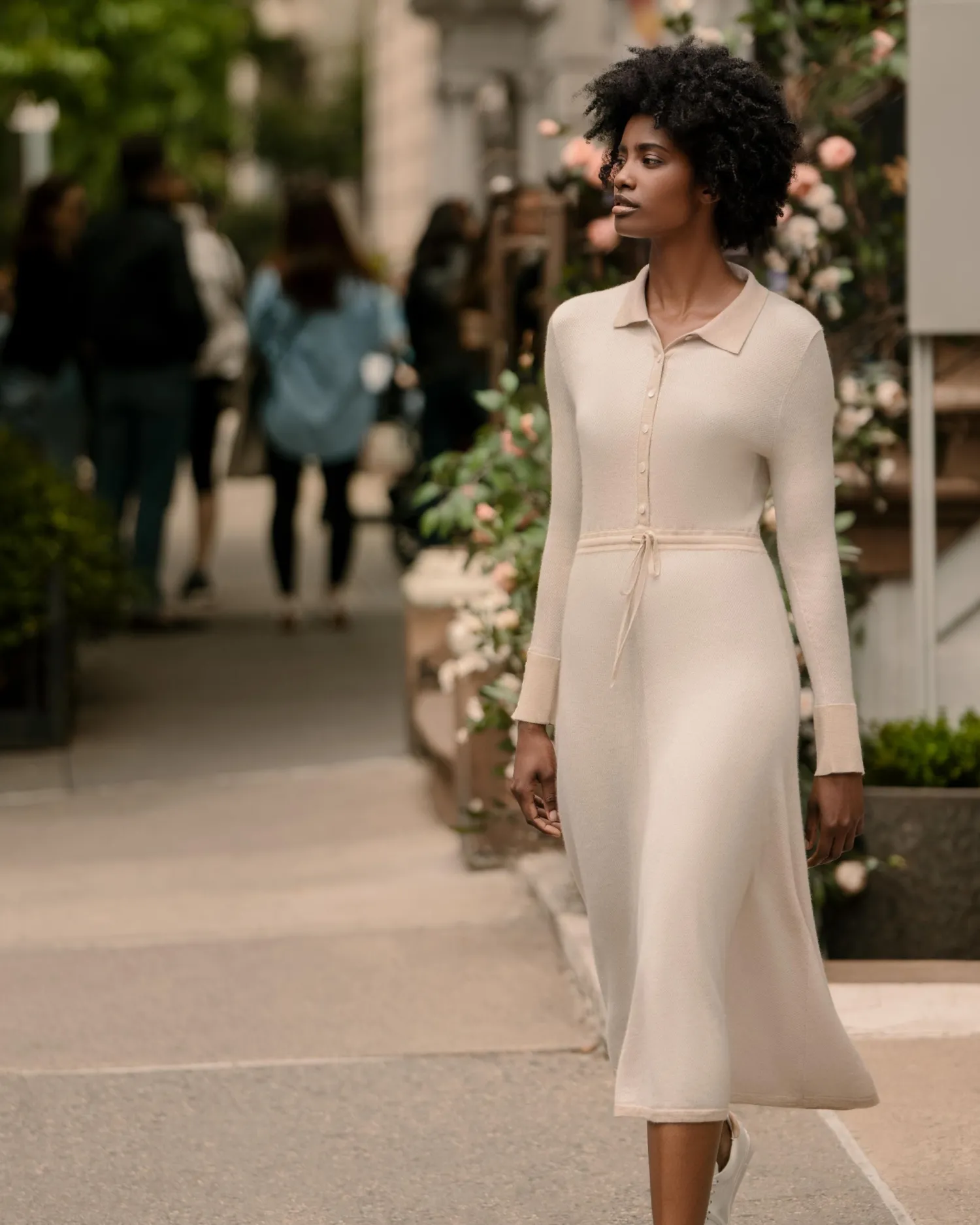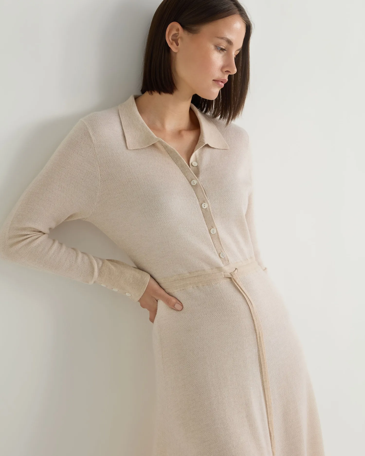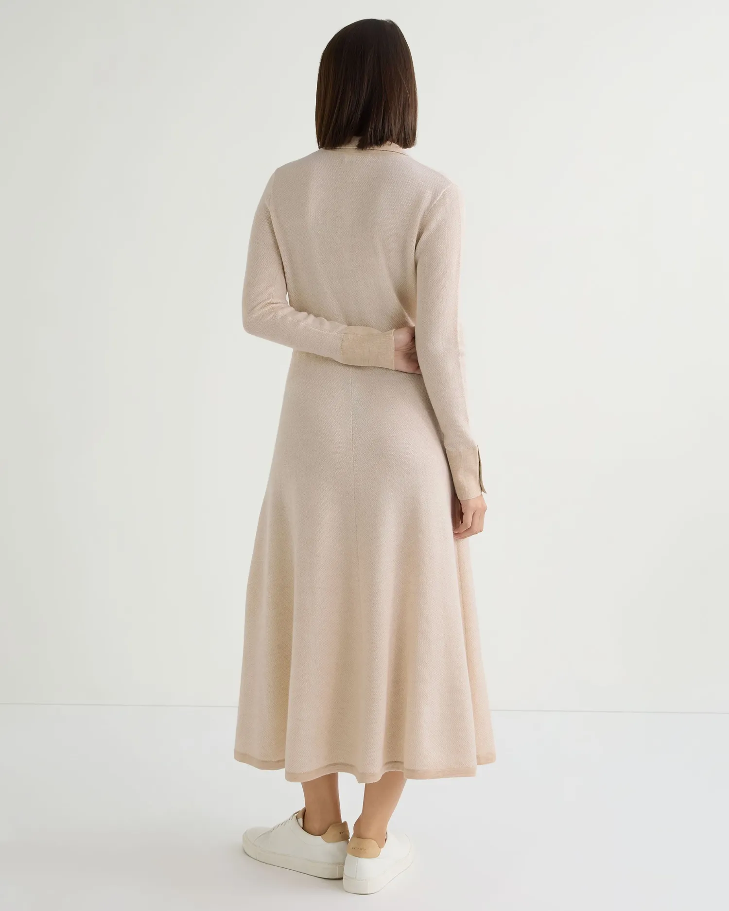 Our favourite dress design in a super elegant new colourway. – Made from our signature blend of 70% cashmere and 30% silk- In a beautiful sandstone brown and new ivory white Birdseye design – Elegant polo collar style dress with gentle drawstring waist – Sensationally soft against the skin, delightful to wear – 1ply- Model is wearing size Small – Care: Dry Clean Onlyn