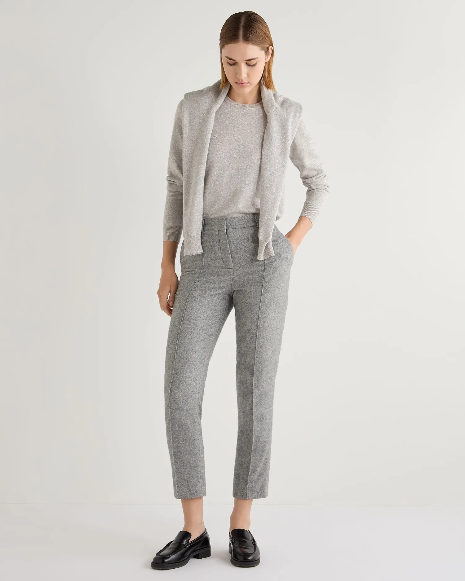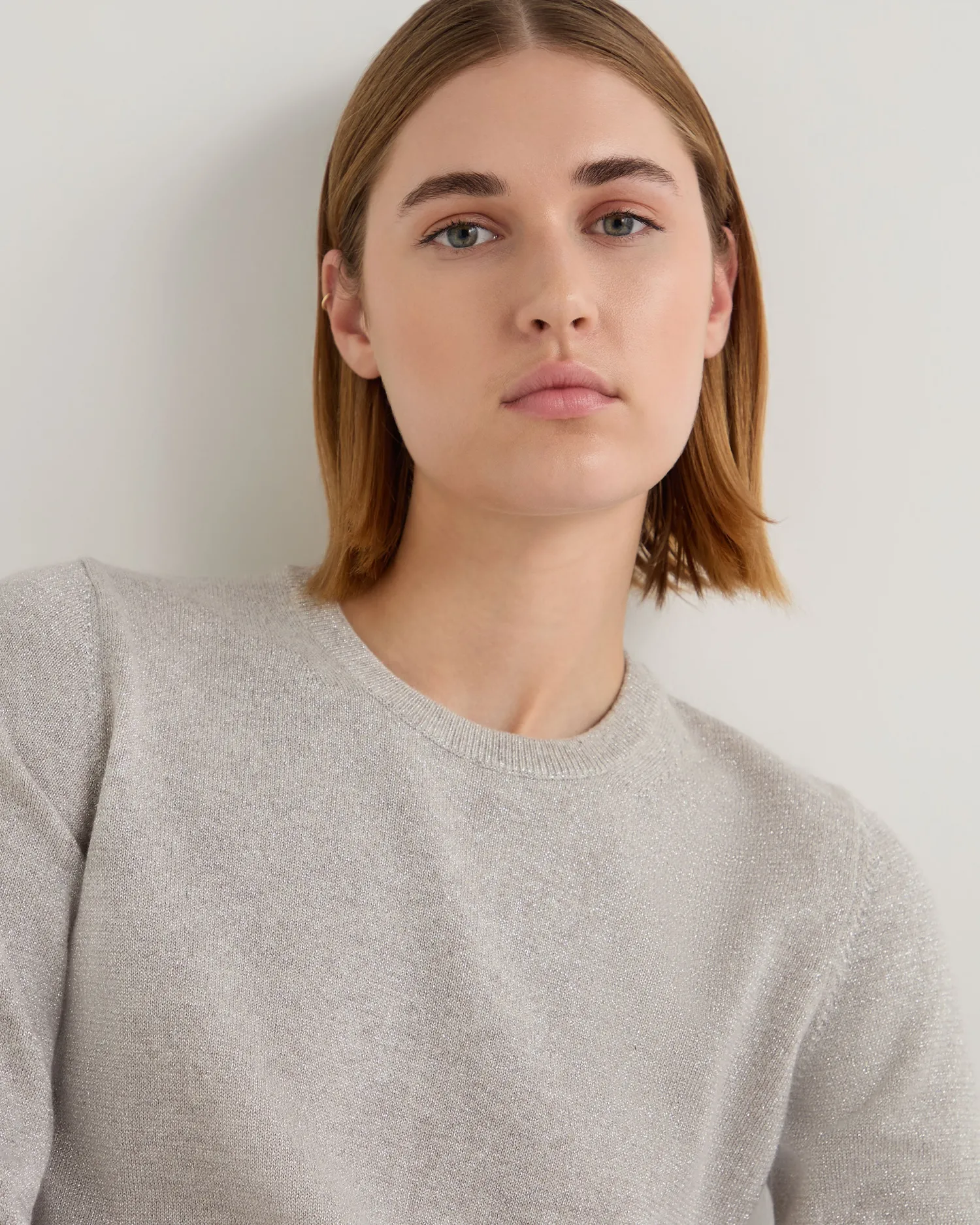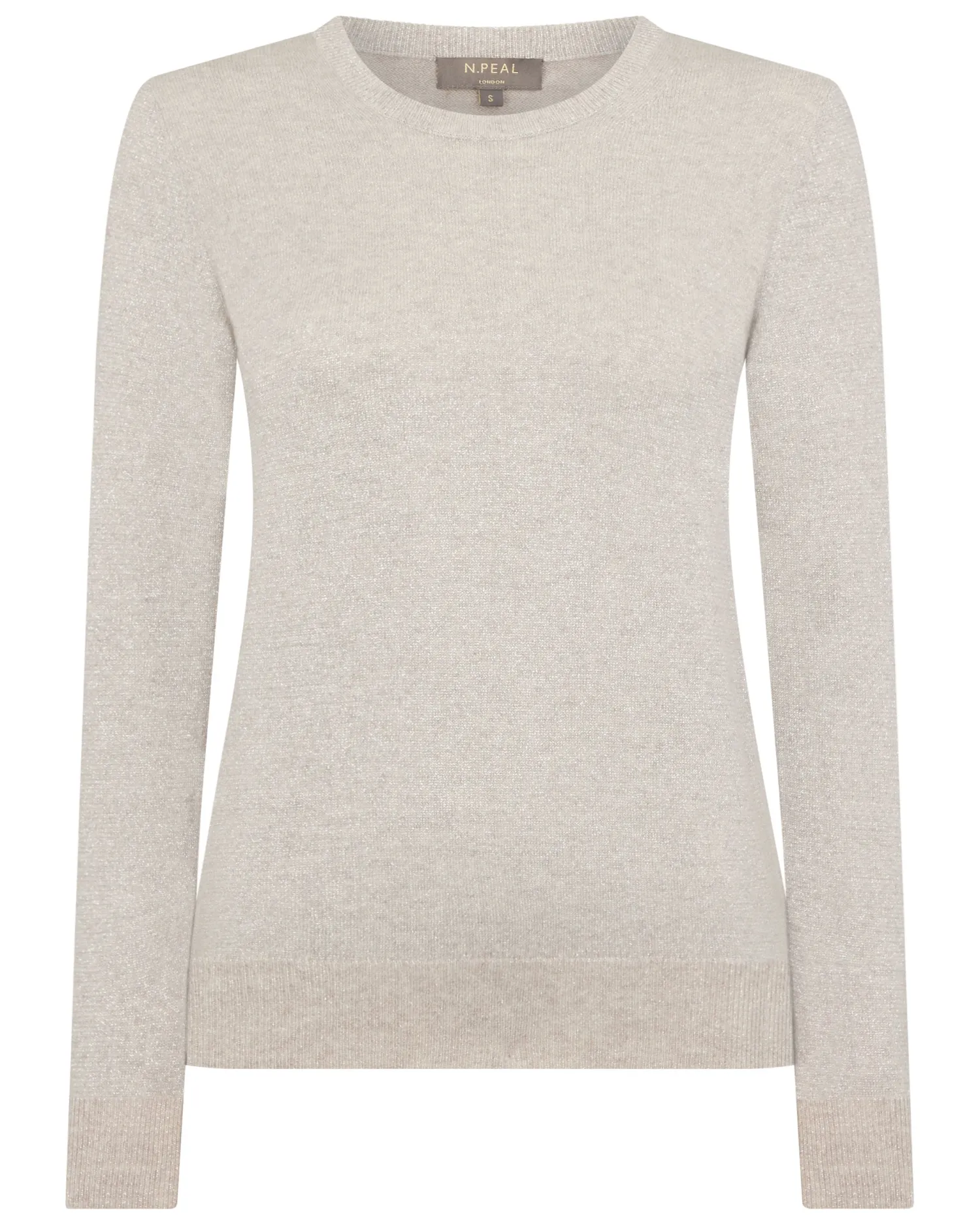 Our classic cashmere round neck sweater available in lovely shades and now with added Lurex.n 92% Mongolian cashmere 8% Lurex Elegant round neck style Wardrobe staple Luxuriously soft Perfectly cut Neat trim finishing Fabulous colour selection 1ply Model is wearing size Small Care: Hand Wash