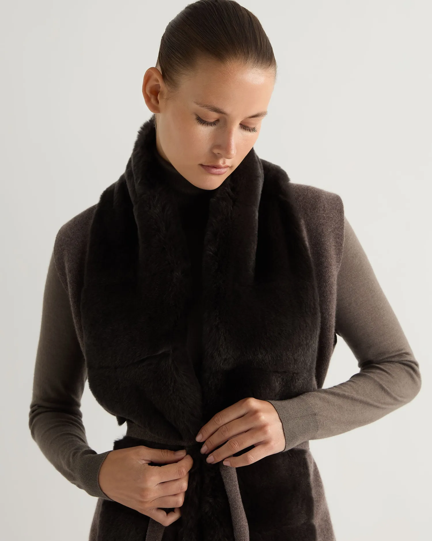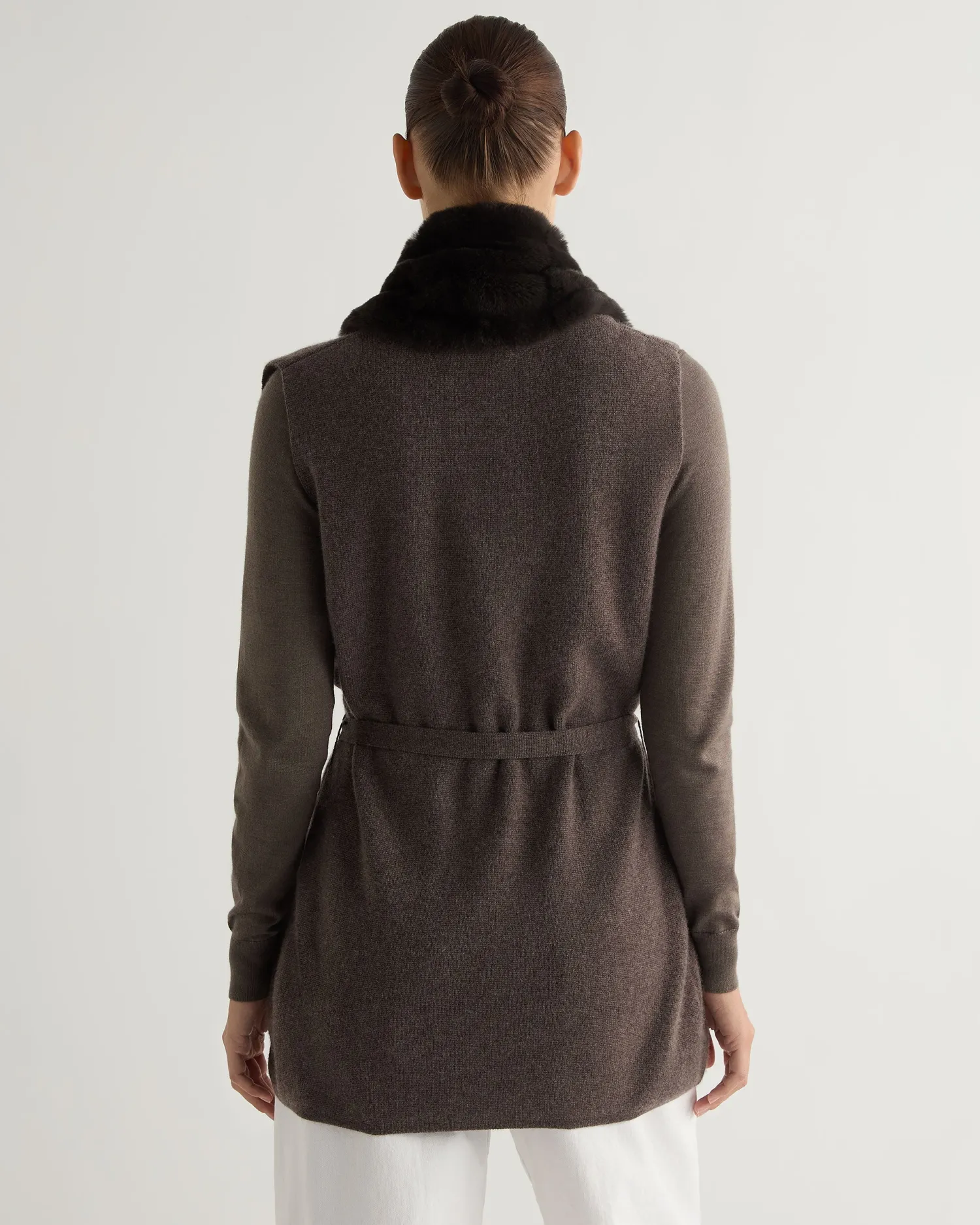 This popular style combines Milano stitch and fur trim – surely the perfect gilet? 100% Mongolian cashmere with Rex fur trim – Milano stitch cashmere for texture – Dark brown Rex rabbit fur placket trim – Stylish and flattering – 1ply – Model is wearing size Small – Care: Dry Clean Only