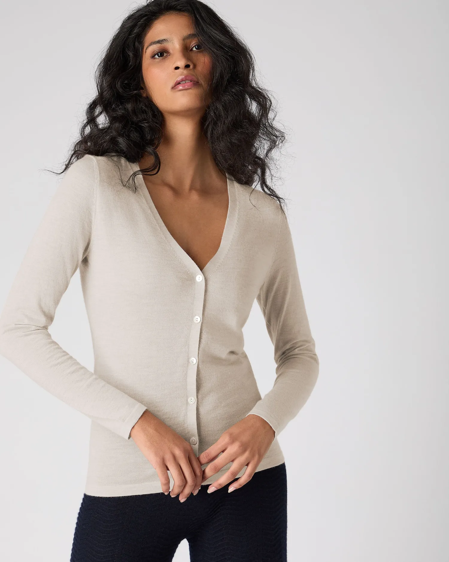Our indulgent superfine cashmere V neck cardigan is worth a try. 100% Mongolian worsted Cashmere – Yarn spun finer to create a lightweight feel – Beautifully light and soft – Elegant v neck style – Six shell buttons to fasten – Great paired with N.Peal superfine shell top – Our superfine products have a naturally slimmer fit, if you’d like a looser fit (like our other products) or are between sizes, we suggest you size up – Model is wearing size Small – Care: Hand Wash