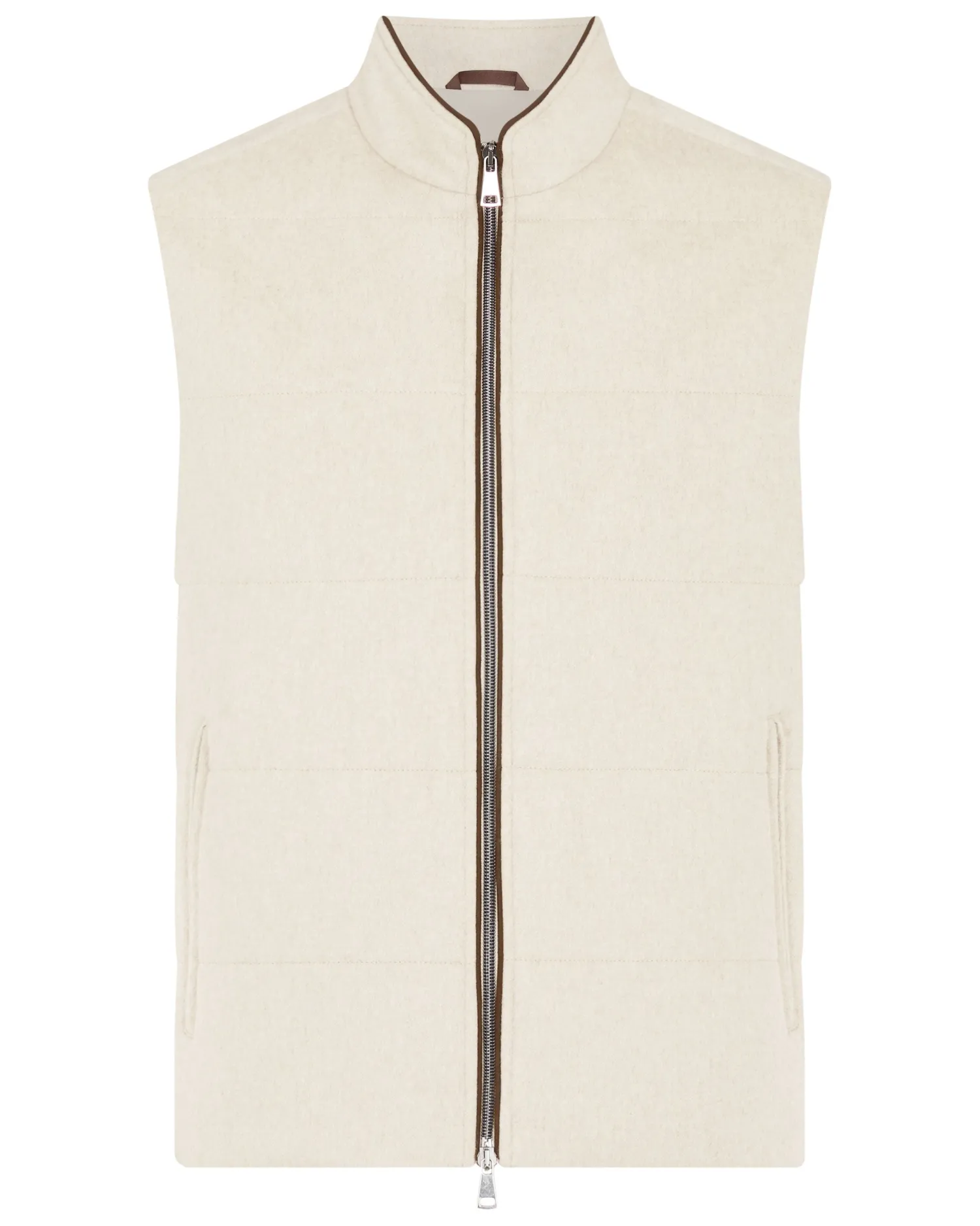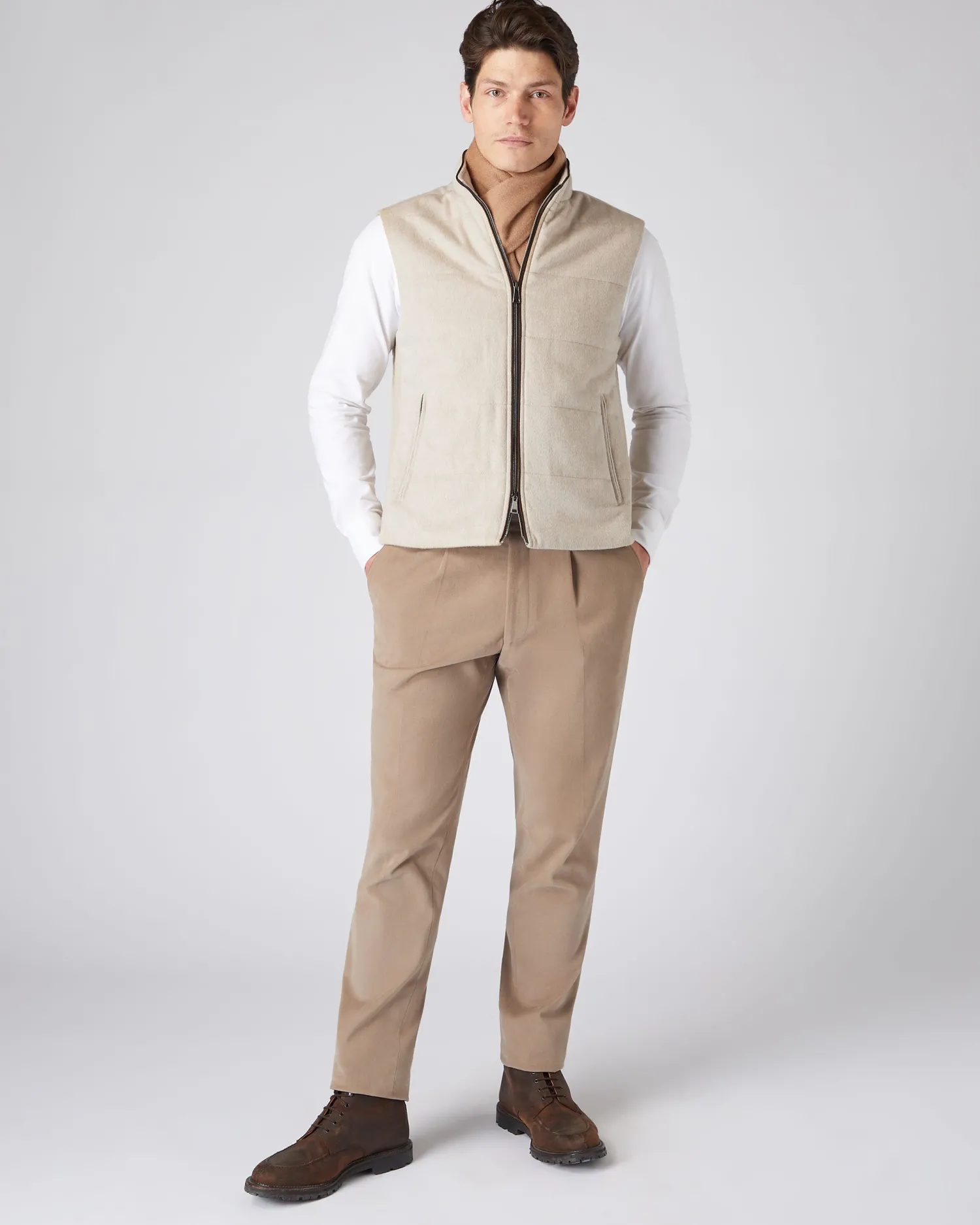A classically fitted gilet with flattering silhouette and noteworthy knitted details in our lightweight Belgravia cashmere gilet. The addition of a thin bonded layer with our London Weather Systemâ„¢ enhances protection from the elements without compromising breathability. Made from 100% Mongolian cashmere woven fabric body with 100% wool side panels- Two way zip and zip up side pockets – Subtle horizontal stitch design – Contrast piping – Knitted side panel for comfort and stretch – Model is wearing size Medium – Care: Dry Clean Only