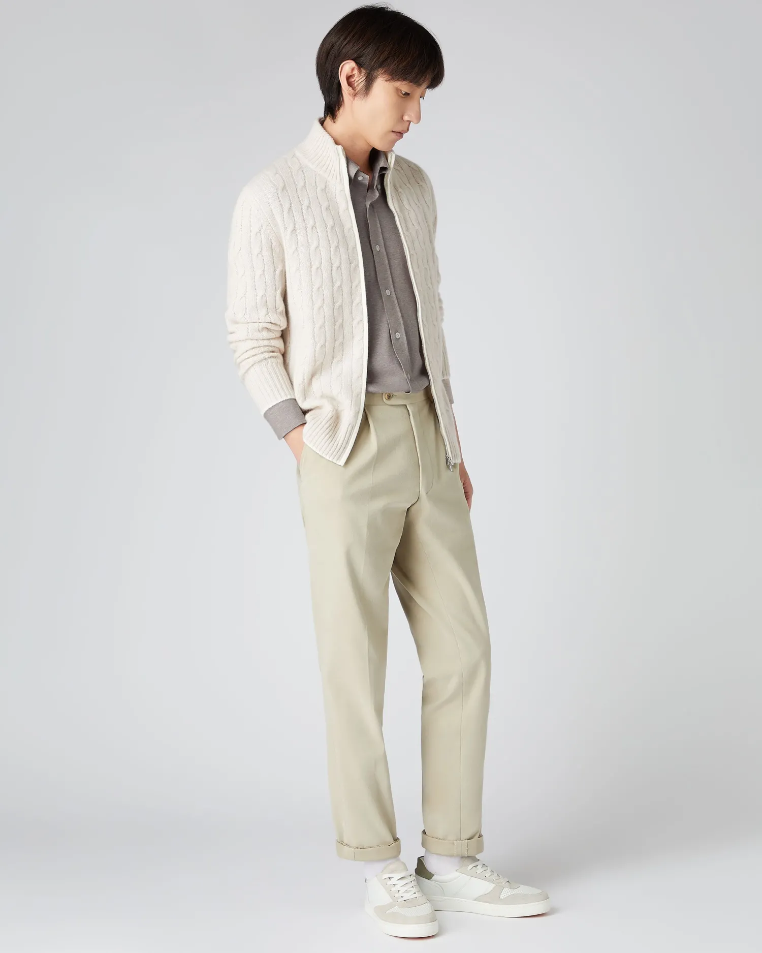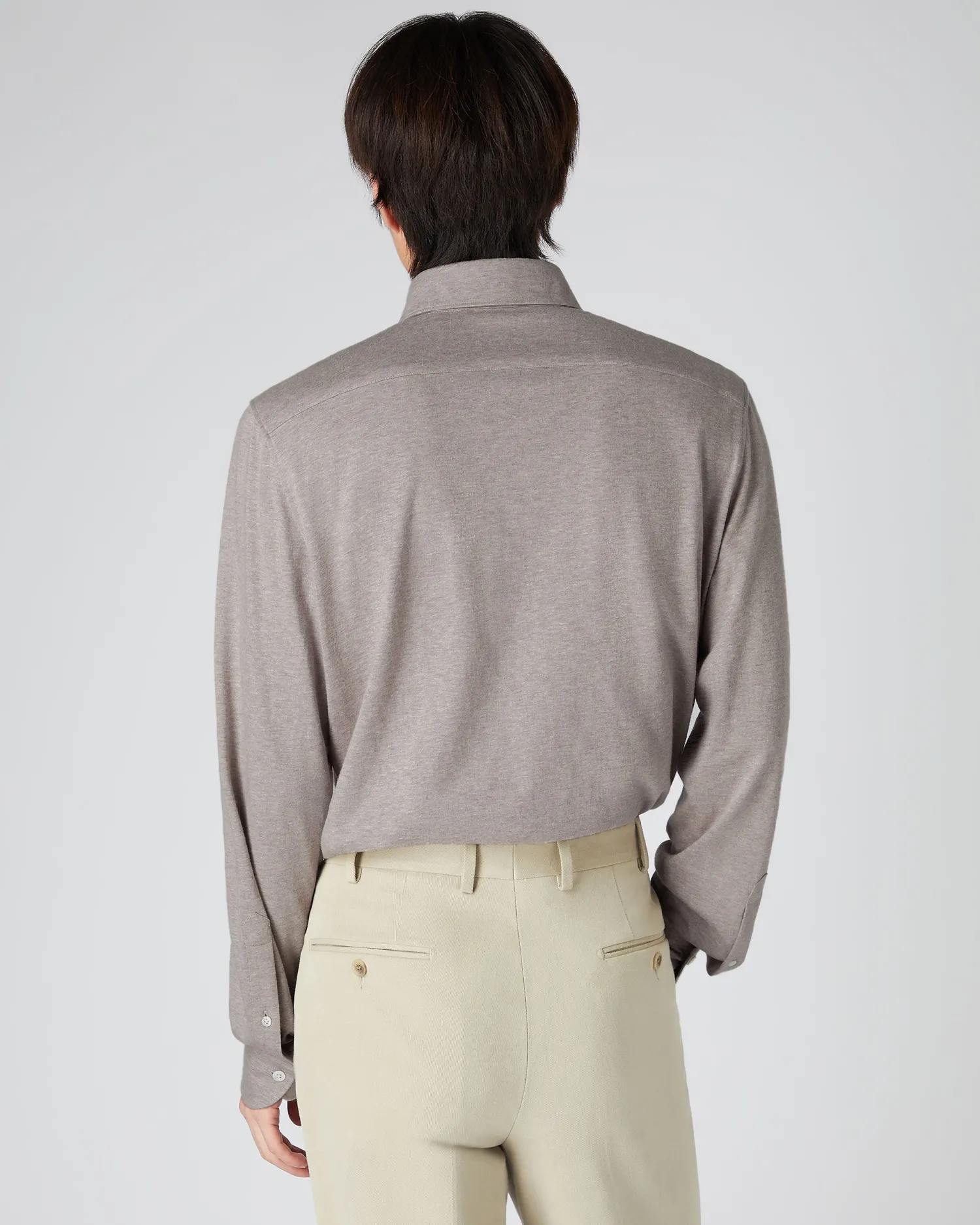 Introducing our Men’s jersey stretch shirts in a cotton cashmere blend with an 85%/15% mix. Unlike a traditional woven shirt with no ‘give’, our Jersey shirts are created on circular knitting machines, providing a natural stretch, ultimately delivering an incredibly comfortable wear, not normally associated with a shirt.nFeaturing an ‘Italian’ button down collar which creates an elegant roll to its shaping. A true wardrobe cornerstone, strong enough when paired with our trousers or layer under your favourite N.Peal knitwear for ultimate elegance.nModel is wearing size Medium.Care: Dry Clean Only.