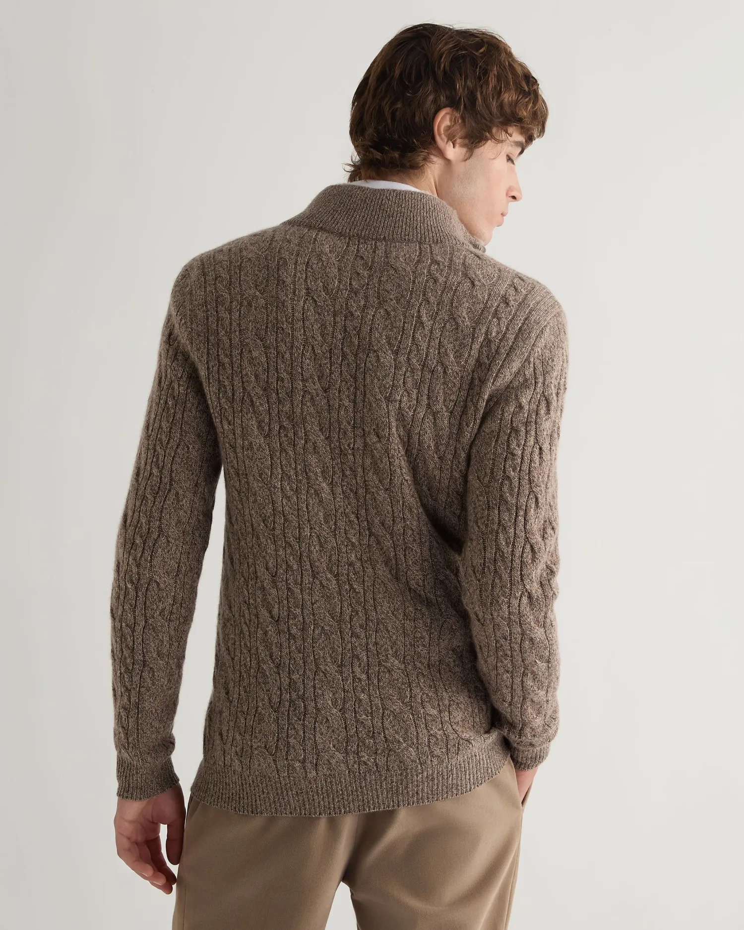 Our popular half zip style, with extra luxury added! Made from 100% Mongolian cashmere with a toast brown rex fur inner collar – Super popular half zip style – Zip fastening with our distinctive leather toggle – Mixed cable knit pattern front, back and both arms – Smart matching rib knit collar, cuffs and hem – Fabulous worn over a T-shirt , a crisp white shirt or supersoft alone against the skin – 2ply – Model is wearing size Medium – Care: Hand Wash