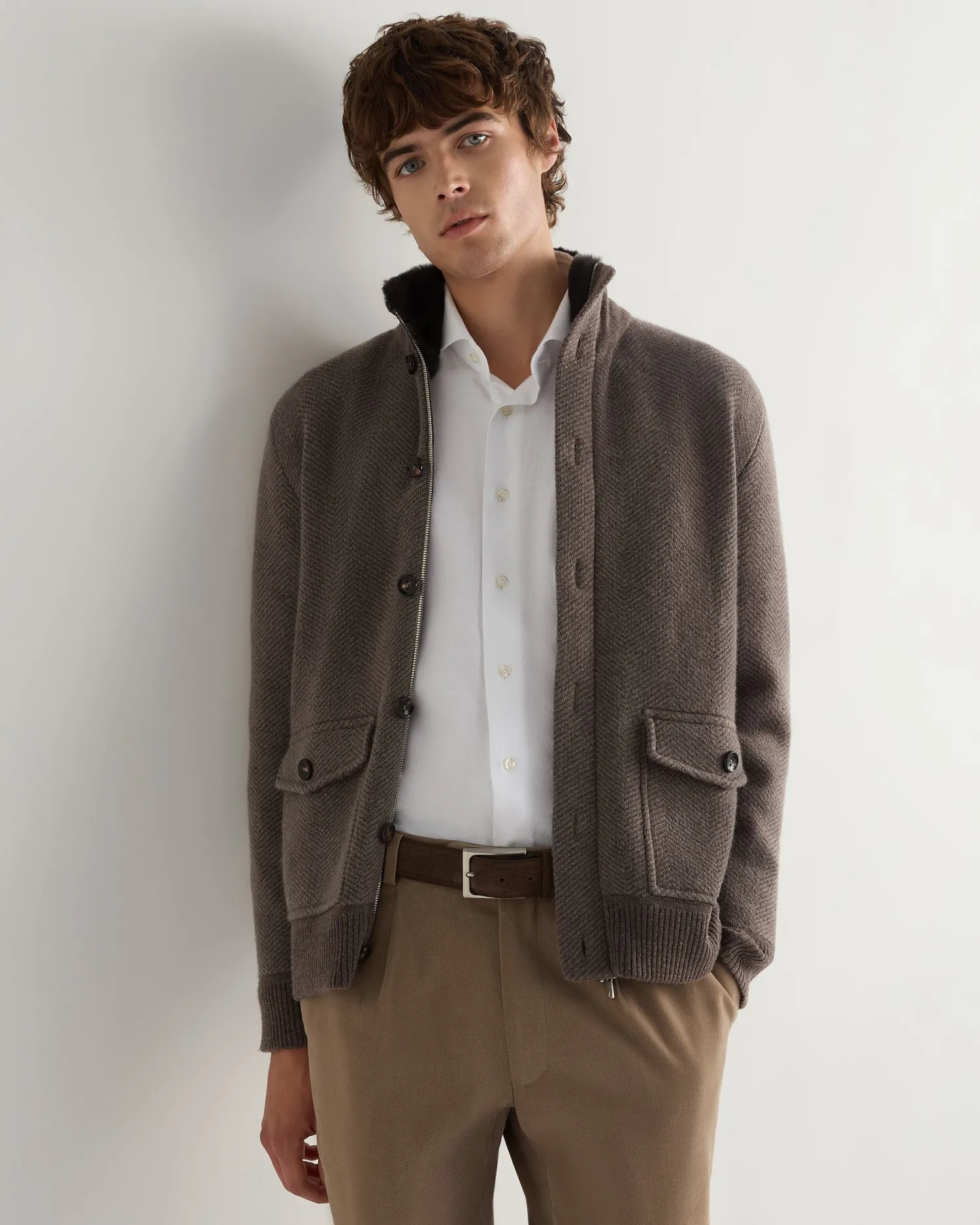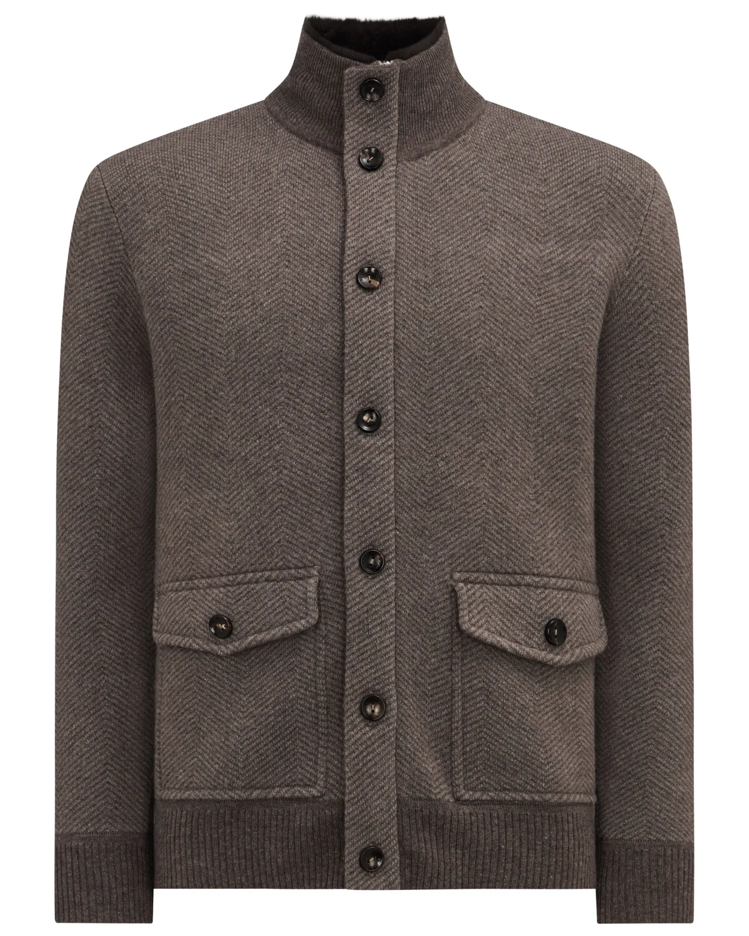 A smart new jacket from the N.Peal designers for this season. Made from 100% Mongolian cashmere with dark brown fur lined collar- Biscotti and taupe brown body and arms with biscotti brown ribbed finish on hem, cuffs and collar – Two distinctive buttoned patch pockets – Zip fastening with button placket over – Attractive herringbone design – 1ply – Model is wearing size Medium – Care: Dry Clean Only