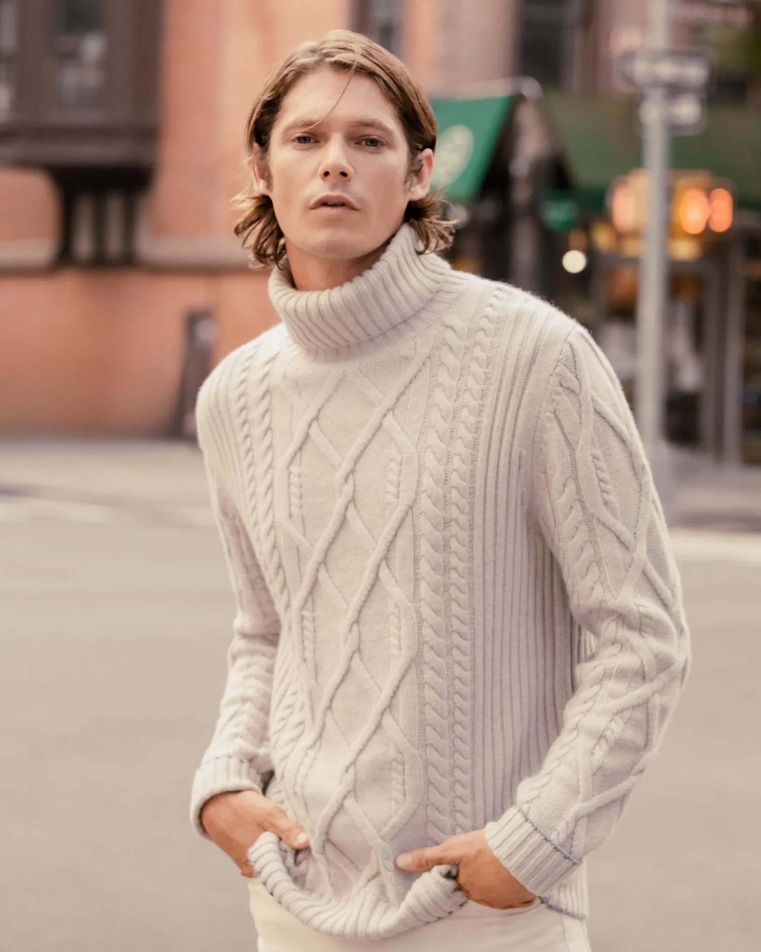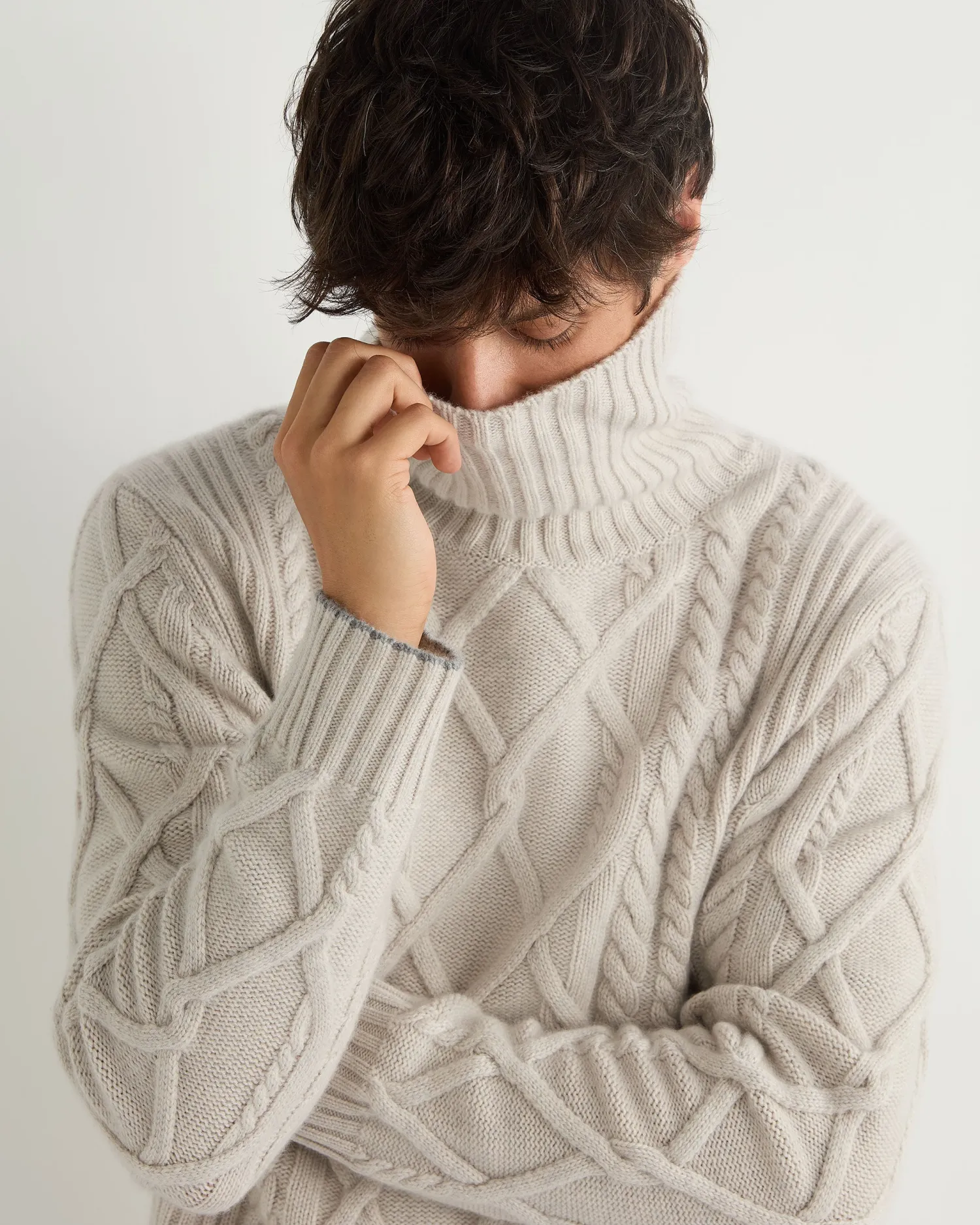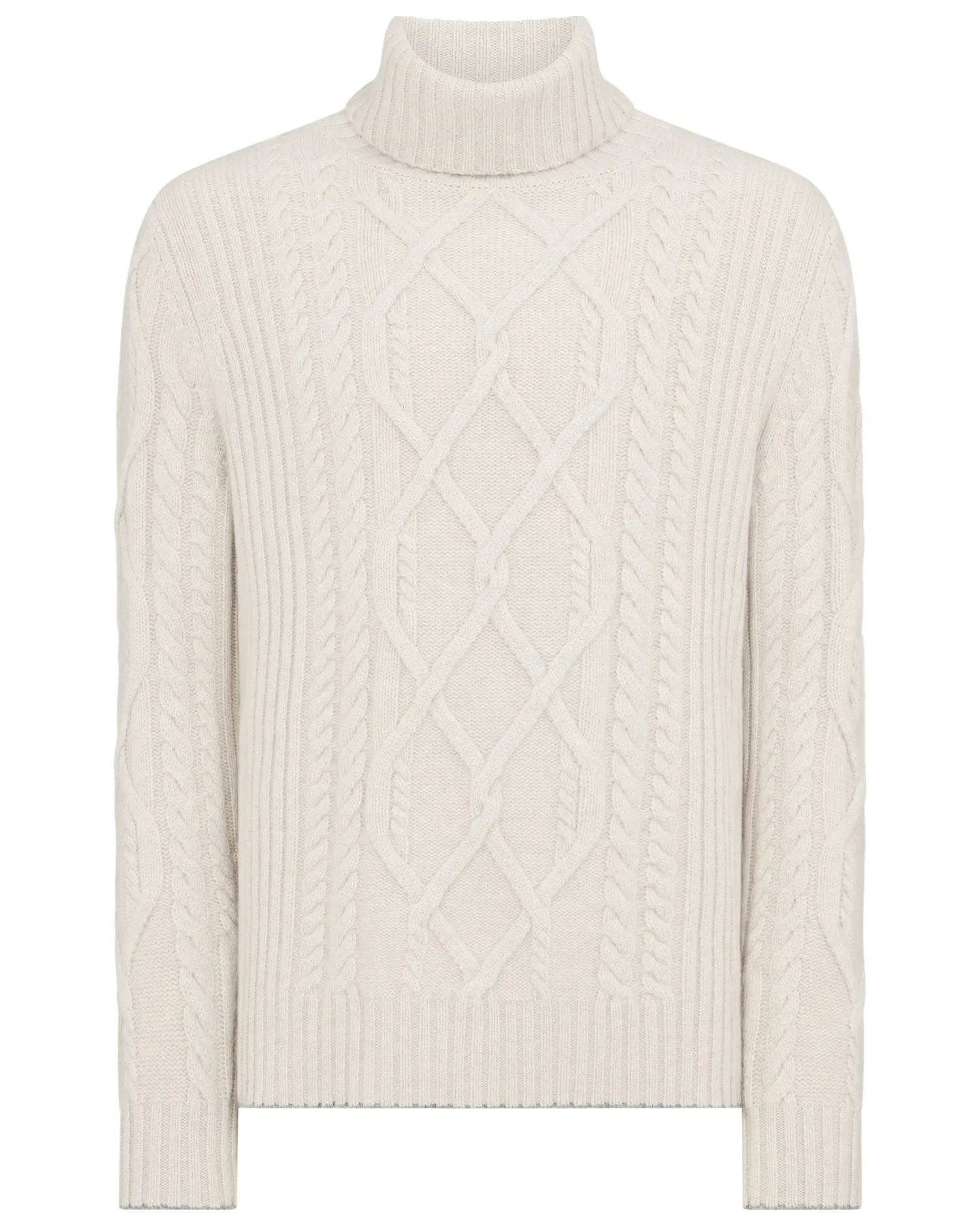 Introducing our new chunky cable roll neck sweater, the varied cable knit patterns add a touch of traditional elegance to your wardrobe. Made from 100% Mongolian organic cashmere – A luxurious layering piece – Perfect for skiing and cold pursuits – Matching ribbed design on the cuff, hem and neck – Flannel grey contrast trim- 4ply – Model is wearing size Medium – Care: Hand Wash Organic cashmere: organic dyes and detergents, free from fertilizer and pesticides, find out more here